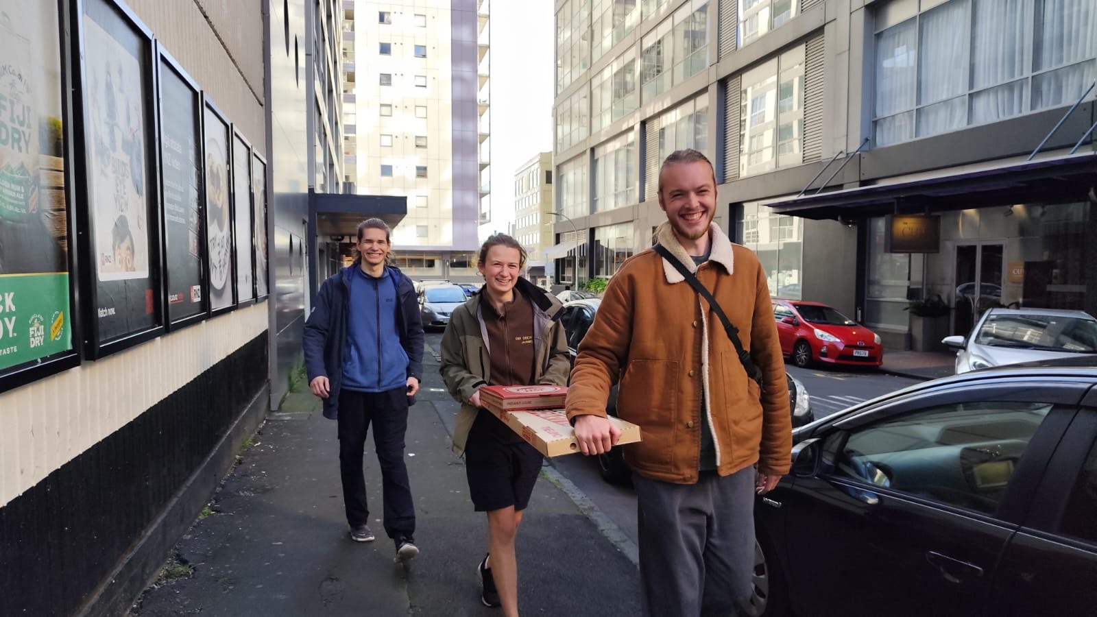 Als Beginn unserer gemeinsamen Zeit sind wir (mal wieder) gemeinsam zu PizzaHut gelaufen. Die Preise dort sind wirklich nicht zu schlagen und so haben wir uns zur Feier des Tages das größte Angebot gegönnt, was der kleine Laden zu bieten hatte: eine Pizza-Limousine! Der riesige Pappkarton beinhaltete drei verschiedene große Pizzen und verschiedene Beilagen. Mit diesem riesigen Karton durch Auckland zu laufen war echt witzig und wir haben viele belustigte Blicke abbekommen. Aber wir wurden auch sehr oft vorgelassen, offenbar kommen mit so viel Pizza auch besondere Privilegien mit sich. Im Hostel angekommen haben wir wirklich alles gegeben die Pizza komplett zu vernichten, aber selbst zu viert haben wir es nicht geschafft all das Essen zum Mittag aufzuessen und haben den Rest deshalb aufs Abendessen (oder als Mitternachtssnack) verschoben.