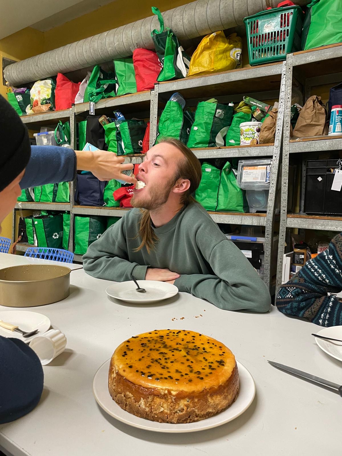Wie schon bei unserem letzten Besuch in Auckland haben wir es voll und ganz genutzt, dass wir einen Ofen und eine große Küche zur Verfügung hatten. Dieses Mal gab es unter anderem Lasagne, Knödel, aber auch zwei verschiedene Kuchen. Zum einen haben wir Thies‘ Lieblingskuchen, kalter Hund, „gebacken“, mein Favorit war aber ein anderer. Wir haben uns an einem Maracuja-Käsekuchen versucht, der einer der besten Kuchen war, den wir je gegessen haben – darüber waren wir uns alle ziemlich einig! Zum Glück hat Janneke mir das Rezept geschickt, sonst wäre die Suche nach diesem vermutlich meine neue Lebensaufgabe! Zu viert zu Kochen war nicht nur wegen der Gegebenheiten im Hostel einfacher, sondern auch, weil das Einkaufen für vier Menschen deutlich einfacher ist als für zwei Menschen. Mir ist erst hier in Neuseeland so richtig aufgefallen, wie groß alle Packungen und Portionen im Supermarkt eigentlich sind! Zu zweit (und ohne Kühlschrank) bekommen wir vieles davon gar nicht auf! Für die doppelte Anzahl an Menschen zu kochen war daher wirklich eine angenehme Abwechslung!