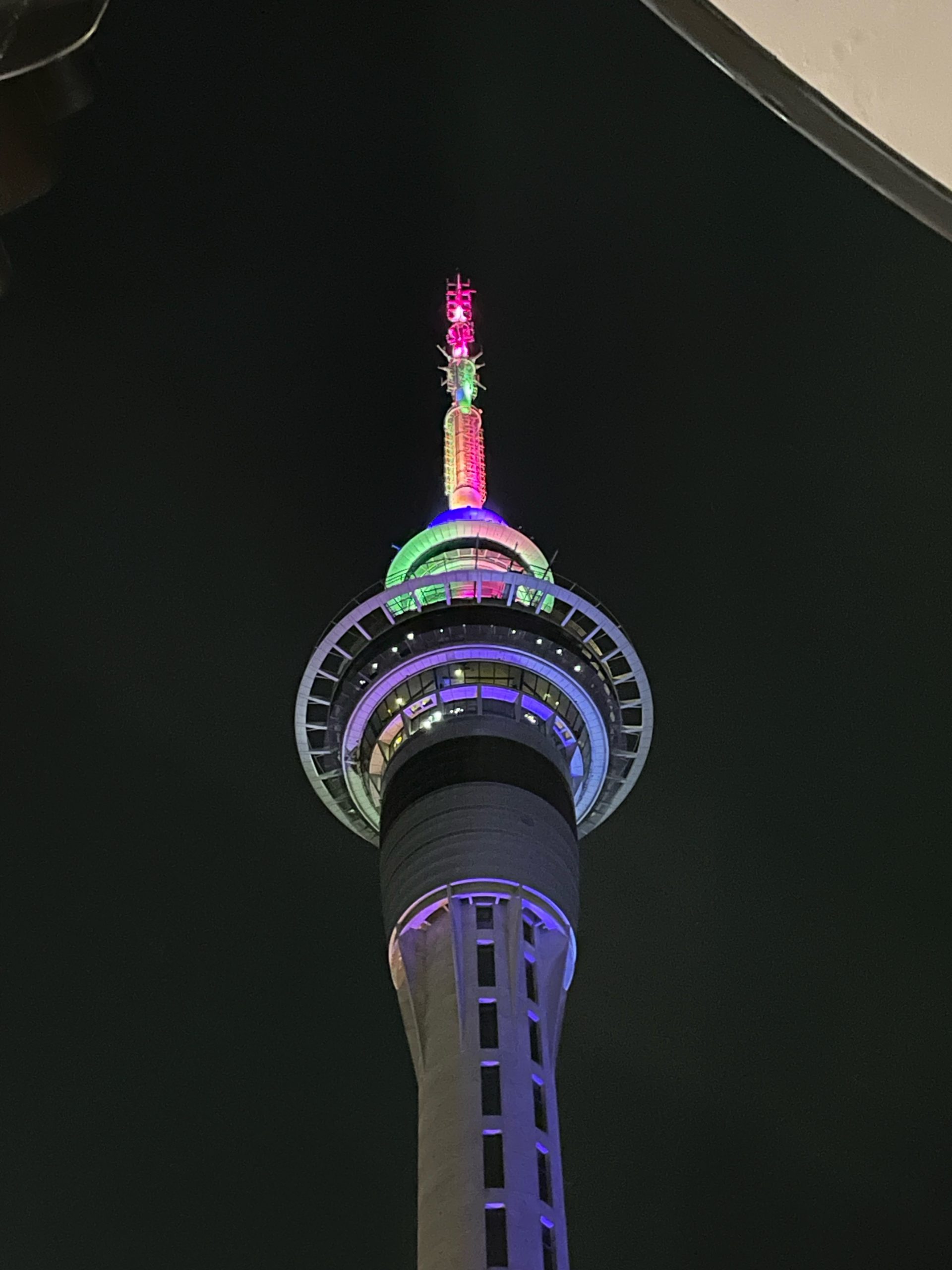 In der zweiten Nacht haben wir uns gemeinsam E-Scooter gemietet und haben damit die leeren Straßen unsicher gemacht. Bei den steilen Hügeln der Stadt hatten die armen Fahrzeuge ordentlich zu kämpfen, aber wir hatten auf jeden Fall unseren Spaß! Schon ab spätem Abend ist Auckland komplett leer, was ich bei einer Millionenstadt immer noch etwas komisch finde. Ab 22 Uhr fühlt man sich wie in einer Geisterstadt, in der nur noch wenige Gestalten draußen sind. Zum Scooter fahren sind das aber die perfekten Bedingungen und durch die vielen Lichter und beleuchteten Hochhäuser fühlt es sich auch trotzdem noch lebendig an. Gerade der Sky Tower sieht nachts wirklich toll aus, weil er in verschiedenen Farben angestrahlt wird und aus der gesamten Innenstadt (immerhin ist mit 328 Metern das höchste Bauwerk Neuseelands) sichtbar ist. Schon beim ersten Mal habe ich mich ein bisschen in diesen Turm verliebt und auch beim zweiten Mal habe ich einige Fotos von ihm gemacht!