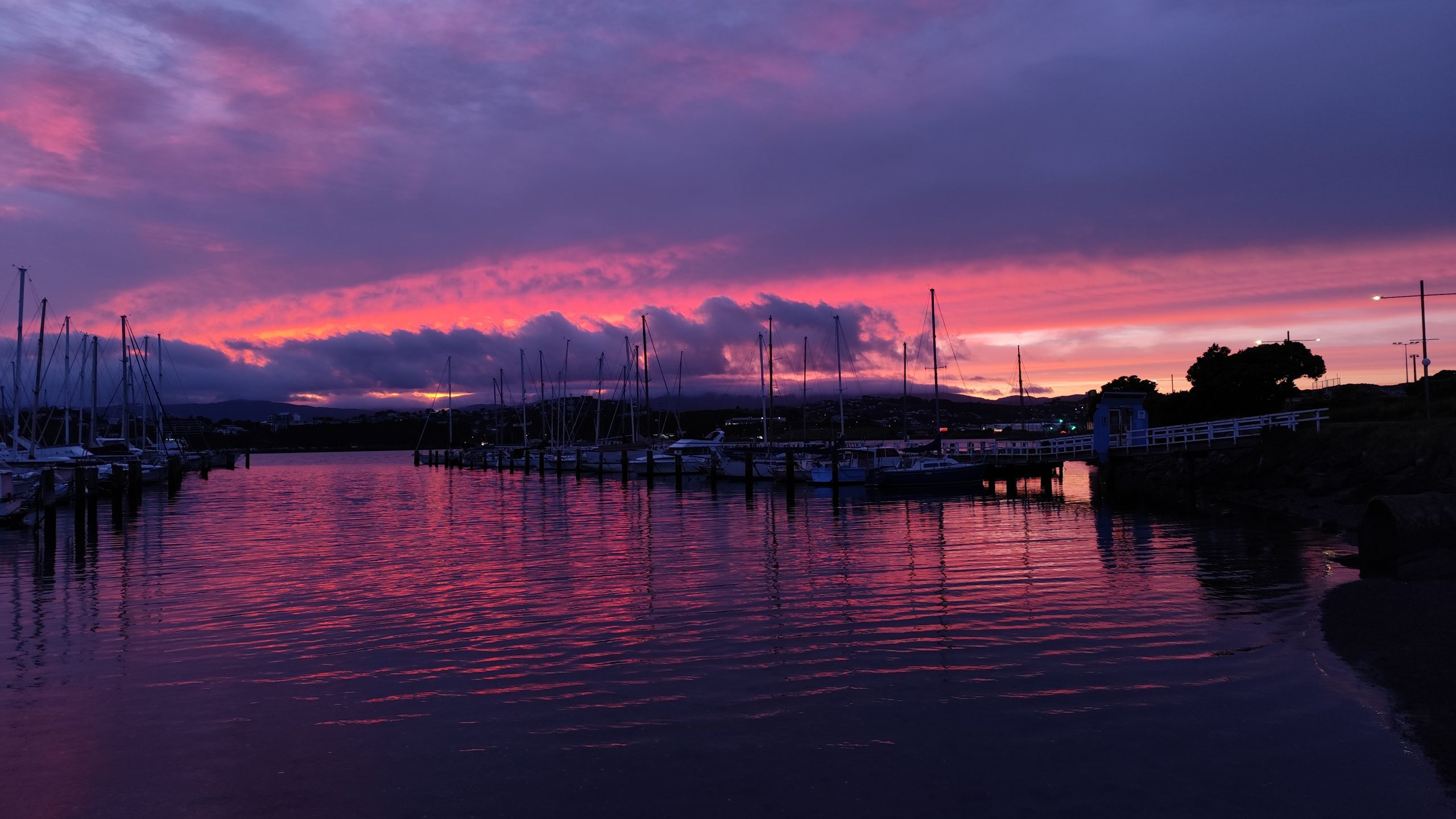 Dafür haben wir uns auf dem Campingplatz in Wellington früh den Wecker gestellt. Noch vor dem Sonnenaufgang klingelten uns unsere Handys um kurz nach sechs aus dem Schlaf. Wir sind schnell mit einem kleinen Frühstück und dem Abbau des Bettes fertig geworden und konnten nochmal den wunderschönen Sonnenuntergang beobachten, der über der Hauptstadt aufging. Es hat sich angefühlt, als wolle die Nordinsel uns in den strahlendsten Farben verabschieden. Wie bei jedem Neuanfang bin ich mit gemischten Gefühlen in unser Auto gestiegen, als es um sieben dann Zeit war zum Fähranleger zu fahren. Ziemlich schnell hat dann die Aufregung gesiegt, es liegt noch so viel Tolles vor uns!