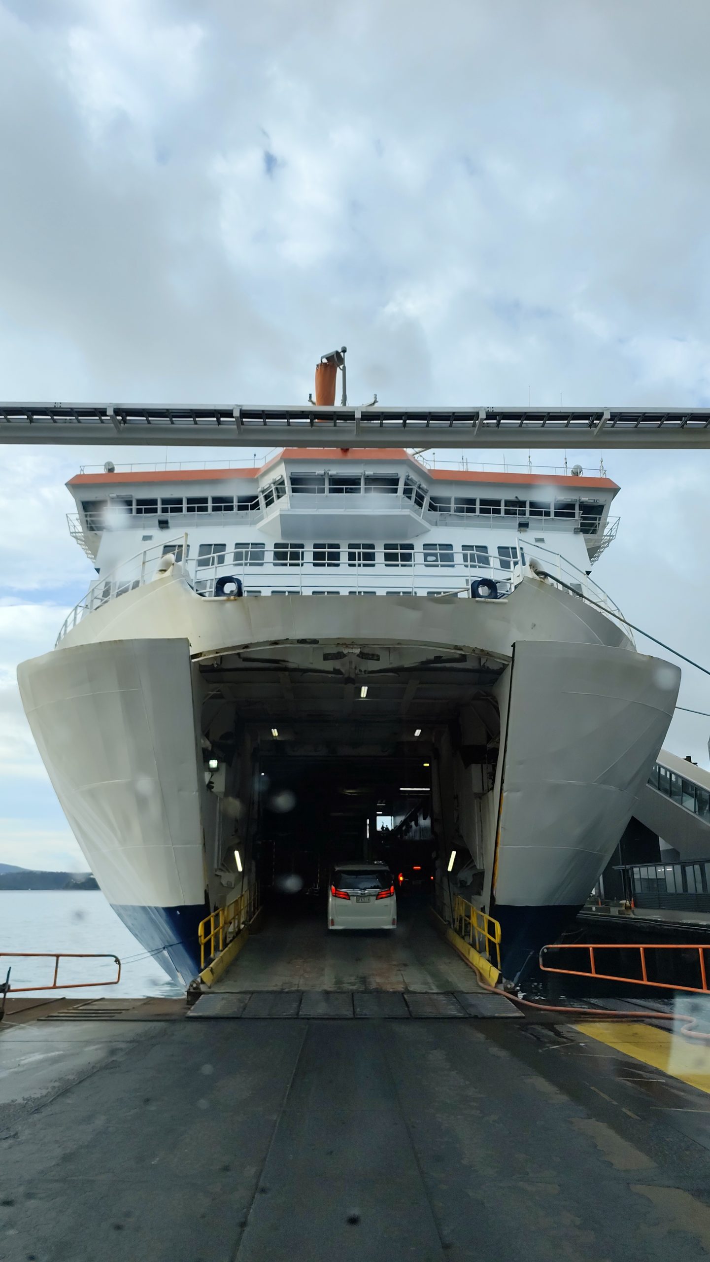 Eine Stunde später standen wir auf dem großen Parkplatz der Fährgesellschaft und warteten darauf, dass es endlich weitergehen würde. Endlich bewegte sich in den vorderen Reihen etwas und nach einigen weiteren Minuten konnten auch wir endlich losfahren. In einer langen Schlange ging es dann über eine kleine Brücke in den Schiffsbauch hinein, was eine sehr lustige Erfahrung war, obwohl ich schon vorher mal mit meiner Familie auf einer Autofähre mitgefahren bin. Irgendwie fühlt es sich trotzdem etwas absurd an auf einer Straße zu fahren, die sich in einem Schiff befindet!