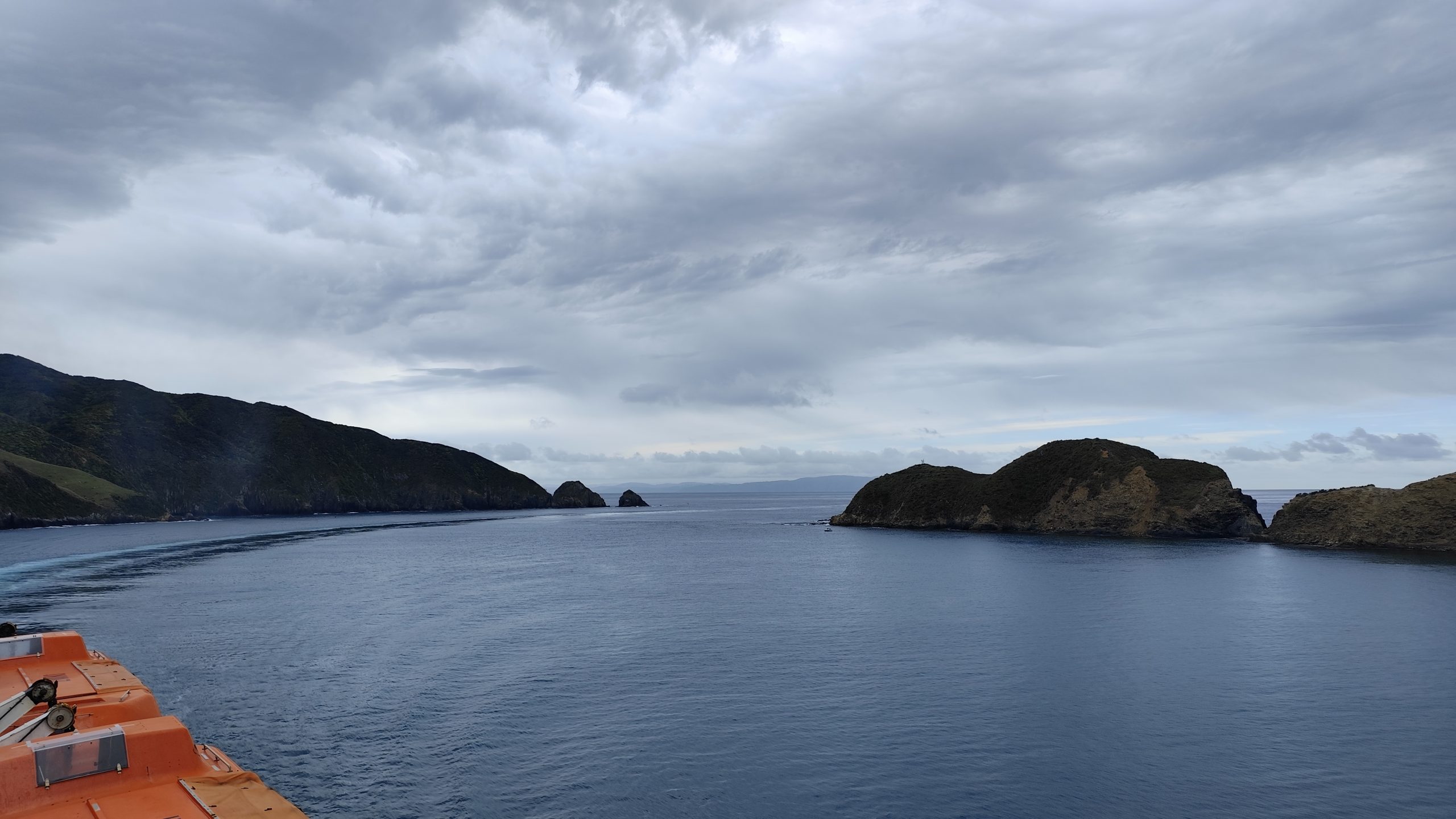 Irgendwann hat Thies mich dann auf etwas aufmerksam gemacht: Berge! In der Ferne konnte wir verschwommen die ersten Berggipfel erkennen und damit auch den ersten Blick auf die Südinsel werfen. Für uns war das ein Zeichen unseren gemütlichen, warmen Platz zu verlassen und wieder nach oben auf das offene Aussichtsdeck zu gehen. Leider waren die Wolken über der Südinsel zugezogen, deshalb war das Licht etwas düster. Zum Glück hat es jedoch nicht geregnet und wir konnten genau mit ansehen, als wir zwischen zwei Landzungen hindurch fuhren und uns dann in einem engen Fjord befanden. Durch diesen Fjord muss jedes Schiff fahren, wenn es von Wellington nach Picton fahren möchte, denn der Norden der Südinsel besteht aus vielen kleinen Inseln und Halbinseln, wo keine großen Schiffe anlegen und keine großen Straßen hinführen können. Deshalb fahren alle Schiffe noch ein ganzes Stück zwischen den grünen Inseln und Landzungen hindurch, bis man die von kleinen Meeresarmen durchzogene Landschaft in Picton größtenteils hinter sich gelassen hat. Dort beginnt die große Landfläche der Südinsel. Bis dahin hatten wir jedoch noch eine ganze Weile Zeit, denn der schmale Fjord zieht sich noch über etwa eine Stunde Bootsfahrt. Die ersten Felsen, an denen wir vorbei gefahren sind, waren noch relativ karg, aber je näher wir dem Festland kamen, desto grüner und bewachsener wurden die Inseln. Schon bald haben wir dichte Wälder gesehen, die sich hinter den vielen geschwungenen Buchten und Stränden erstreckten.