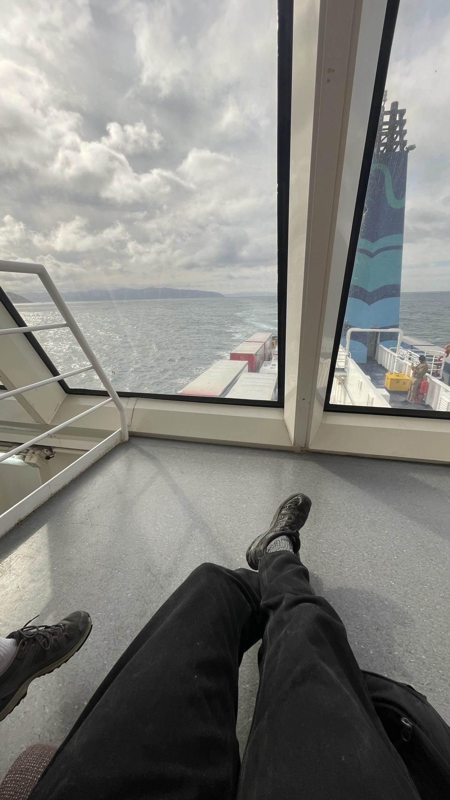 Als wir die Nordinsel langsam hinter uns ließen, haben wir unsere Plätze verlassen und haben angefangen das restliche Schiff zu erkunden. Es gab mehrere Etagen zu entdecken und nach einer ausführlichen Entdeckungstour (ganz unten gab es sogar ein Kino!) haben wir uns eine kleine Bank mit Blick durch eine große Glasfront auf das Meer vor uns gesichert. Dort haben wir dann den Großteil der Fahrt verbracht und unser Frühstück gegessen.