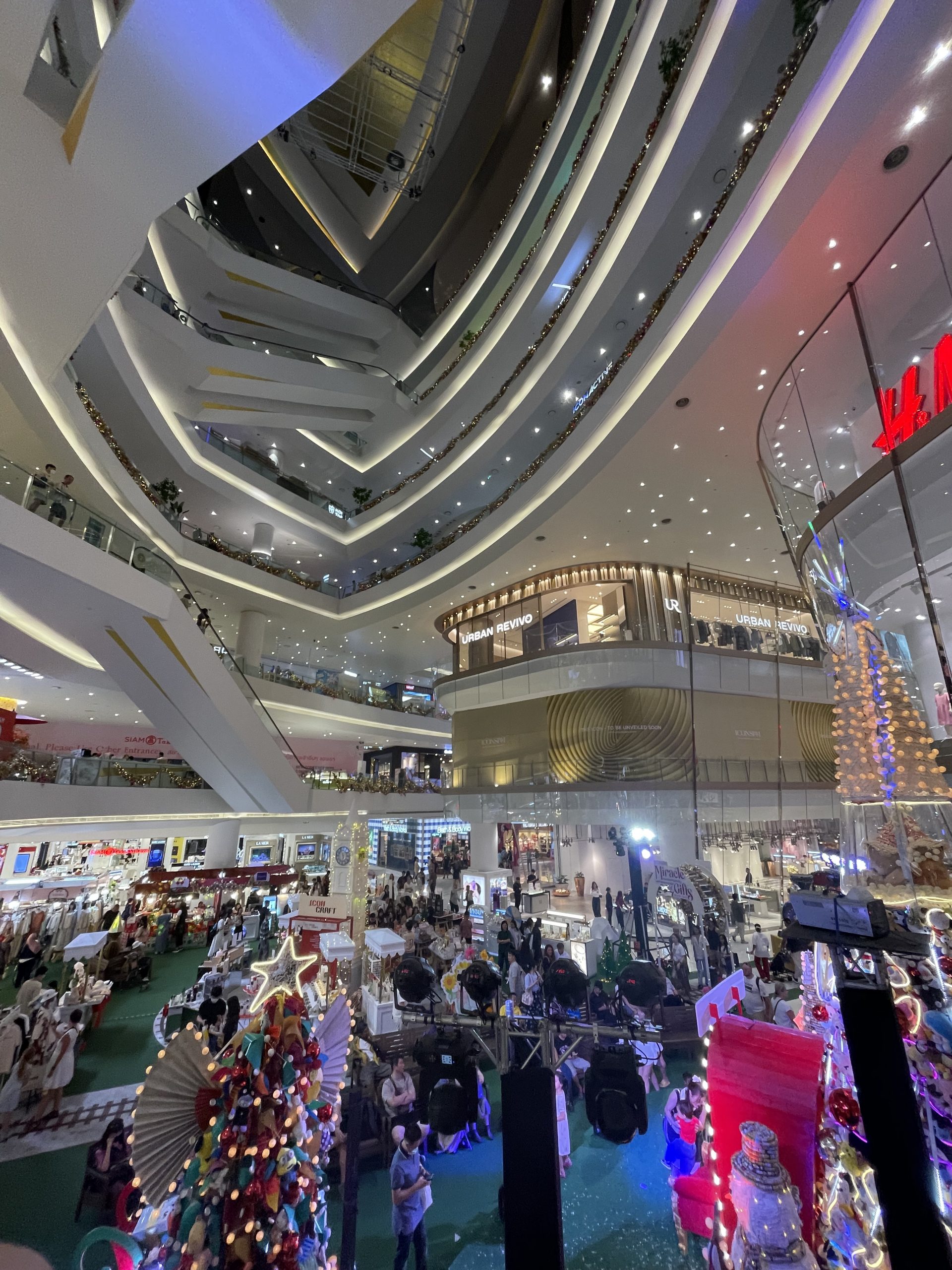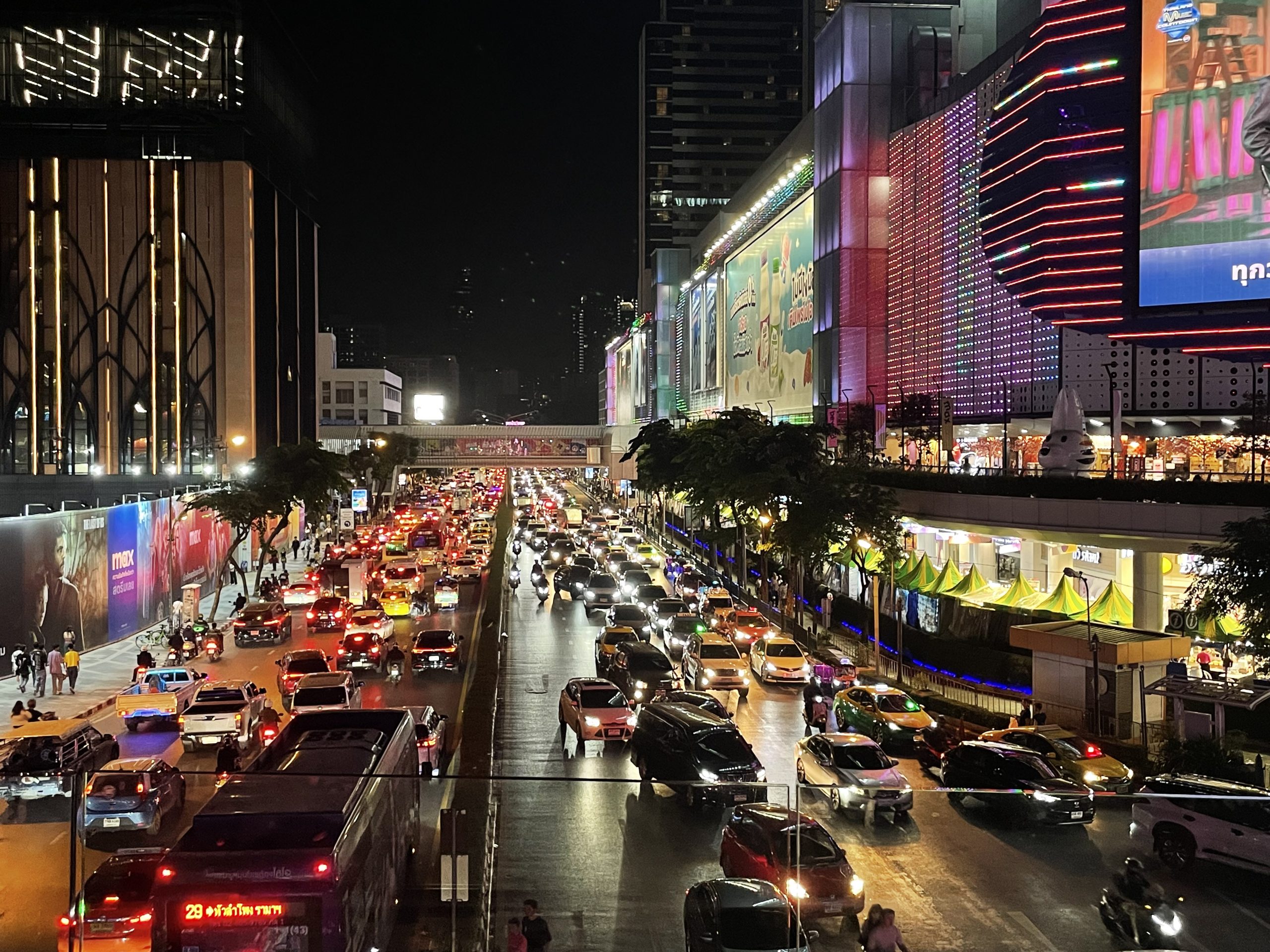 Naja, entweder das, oder man quetscht die mitunter größten Einkaufshallen in ganz Südostasien einfach alle in die Stadtmitte. Willkommen in Bangkok. Ob in „CentralwOrld“ (ja, das „O“ gehört so), „Siam Paragon“, „MBK“, „Platinum“, „City Complex“ oder dem „Indra Square“, in den Tausenden und Abertausenden von Shops findet man immer was man braucht. Und alles andere natürlich auch. In den Straßen zwischen den Mega-Malls sind überall riesige (und ich meine riesige) LED-Bildschirme an den Wänden, die Werbung für verschiedenste Marken zeigen. Es fühlt sich ein bisschen an, als stünde man auf den Times Square in New York, umrundet von unfassbar vielen blinkenden Lichtern, Bildschirmen und großen Gebäuden. Während in der Gegend auch viele Night Markets zu finden sind, welche gut für günstigere Gegenstände sind, so ist beispielsweise in der „IconSiam“ jedes erdenkbare Luxusgeschäft zu finden – von Modemarken wie Gucci oder Prada, über eine Ausstellung von Dyson von 42 verschiedenen Staubsaugerarten, dazu Saugroboter und Ventilatoren, bis hin zu Tesla und Rolls Royce, welche sich wie viele andere Automarken aus irgendeinem Grund im sechsten Stockwerk befinden.