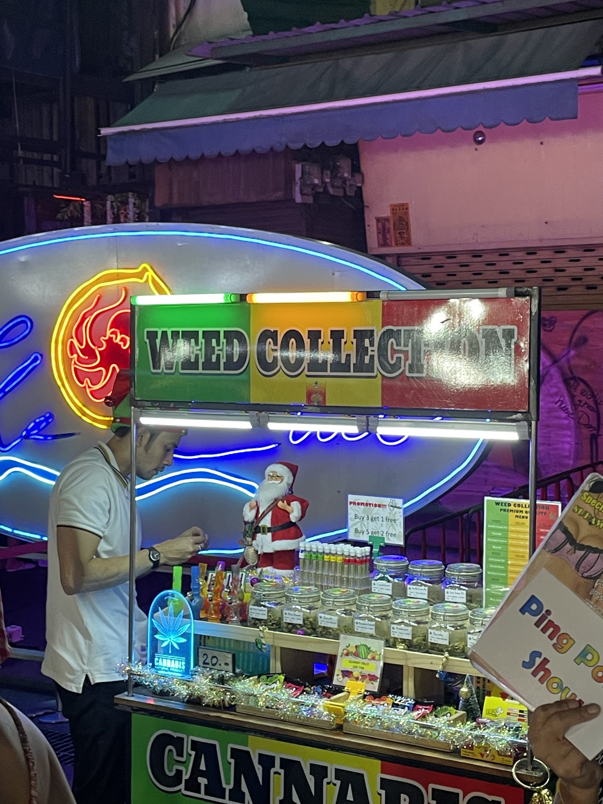 In der Mitte der Straße laufen die Touristen. Viele sind dort, wie wir, aus Interesse, aber der Großteil tatsächlich zum Trinken und zum Feiern. Abgegrenzt wird der Weg von Tischen und Stühlen, sowie von kleinen Straßenständen die Essen und Trinken verkaufen. Außerdem stehen am Rand etliche „Marktschreier“ – Angestellte, deren Job es ist, Gäste in die Bars und Clubs zu locken. Oft halten diese Schilder in die Luft, auf denen zum Beispiel Speisekarten abgebildet sind, oft aber auch Angebote für Alkohol. Soweit so gut. Zwischen den ganzen Bars und Ständen sind immer wieder Gras-Shops zu finden, entweder als tatsächliche Shops oder wieder nur als Straßenverkäufer. Achtet man jedoch einmal genauer auf die Schilder der Marktschreier, entdeckt man schnell auch Angebote für Lachgas. Dieses ist hier erstaunlich beliebt und weit verbreitet. Selbst haben wir es zwar nicht gesehen, sind uns aber beide sehr sicher, dass man hier an so ziemlich jede erdenkliche Droge ran kommt, wenn man nur einmal fragt. Sei es Ketamin, Kokain oder Speed – hier lässt sich alles finden. An den beiden Enden der Khaosan Road ist dann die dritte und letzte Art der Schilder zu finden. Hier werden Shows verkauft. Falls jemand den letzten Teil von „Fack you Göthe“ gesehen hat: Das Ping Pong Klischee ist tatsächlich wahr! Ein anderer Show-Name den wir im vorbeilaufen erkannt haben war „Banana-Shot“. Ich möchte um ehrlich zu sein gar nicht wissen, was genau in den Räumlichkeiten hinter den Clubs alles passiert, aber im Endeffekt ist genau das das Problem dieser Straße. Nur ein Bruchteil der Dinge, die hier passieren sind tatsächlich legal und niemanden scheint es weiter zu interessieren, nicht einmal die Stadt selbst. Außerhalb der Straße sind in den weiteren Gassen viele Prostituierte zu finden. Auch Obdachlose sind dort im Mengen, manchmal bilden sich sogar Gruppen von 10-20 Personen die am Straßenrand ihr Lager aufschlagen.