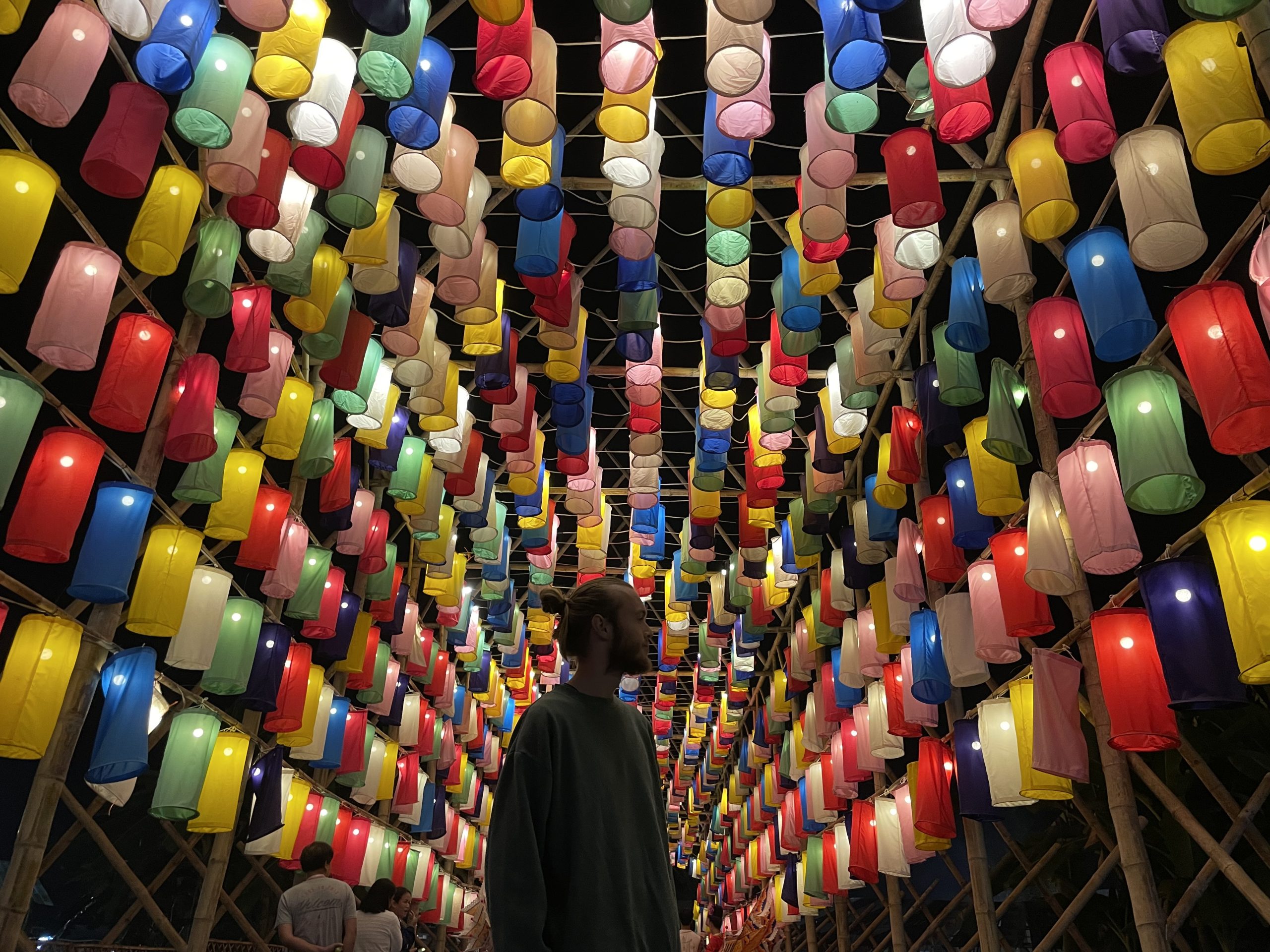 Danach haben wir noch mit unseren Familien telefoniert und waren um halb eins schon fast alleine auf dem Gelände. Diese Chance haben wir genutzt, um auch die Teile zu erkunden, zu denen wir bisher keinen Zugang hatten. Niemand hat uns aufgehalten, denn auch das Sicherheitspersonal war schon längst weg. Das meiste war gar nicht so spannend, es gab mehr (mittlerweile leere) Essenstände und einen Bereich, in dem am Nachmittag wohl ein offenes Restaurant war. Spannend war nur die Bühne, auf der für die höchsten Preisklassen Shows gezeigt wurden. Nun, da niemand mehr da war, war die Bühne eine ideale Tanzfläche. Gerade als wir fertig waren, haben die Besitzer einiger Stände noch eine letzte Himmelslaterne steigen lassen. Diese einzelne Laterne war mindestens genauso schön, wie die hunderten, die gemeinsam vor ihr nach oben gestiegen sind. Wir haben sie mit unseren Blicken verfolgt, bis wir sie nicht mehr erkennen konnten. So wunderschön!