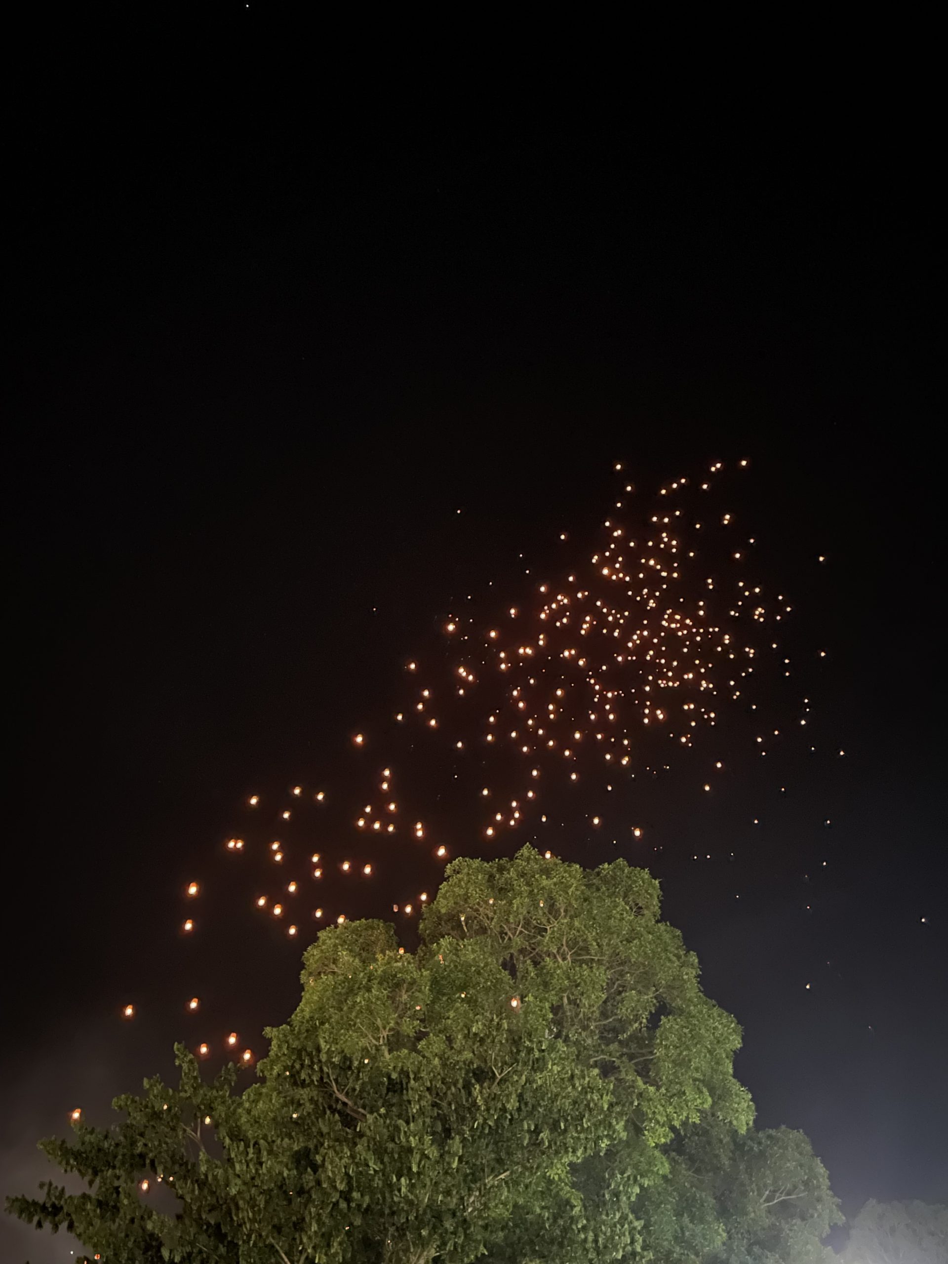 Gerade nachdem Thies nochmal kurz losgegangen ist, um sich etwas zu trinken zu holen, begann mein Highlight des Abends. Die ersten Himmelslaternen wurden eine halbe Stunde vor Neujahr steigen gelassen. Erst waren es einige wenige, die hinter den Bäumen von einer anderen Wiese auftauchten. Aber nach und nach wurden es immer mehr, ein stetiger Strom kleiner Lichter am Nachthimmel. Für die nächsten 1.5 Stunden war der Himmel erfüllt von diesen kleinen Lichtpunkten und es wurden stetig neue steigen gelassen. Zum Glück hat Thies rechtzeitig zurück gefunden und so konnten wir diesen magischen Moment auch gemeinsam genießen. Leider konnten wir selbst keine Laterne steigen lassen, da das den höheren Preisklassen vorbehalten war. Aber schon das zuschauen war den Besuch dieses Festivals wert!