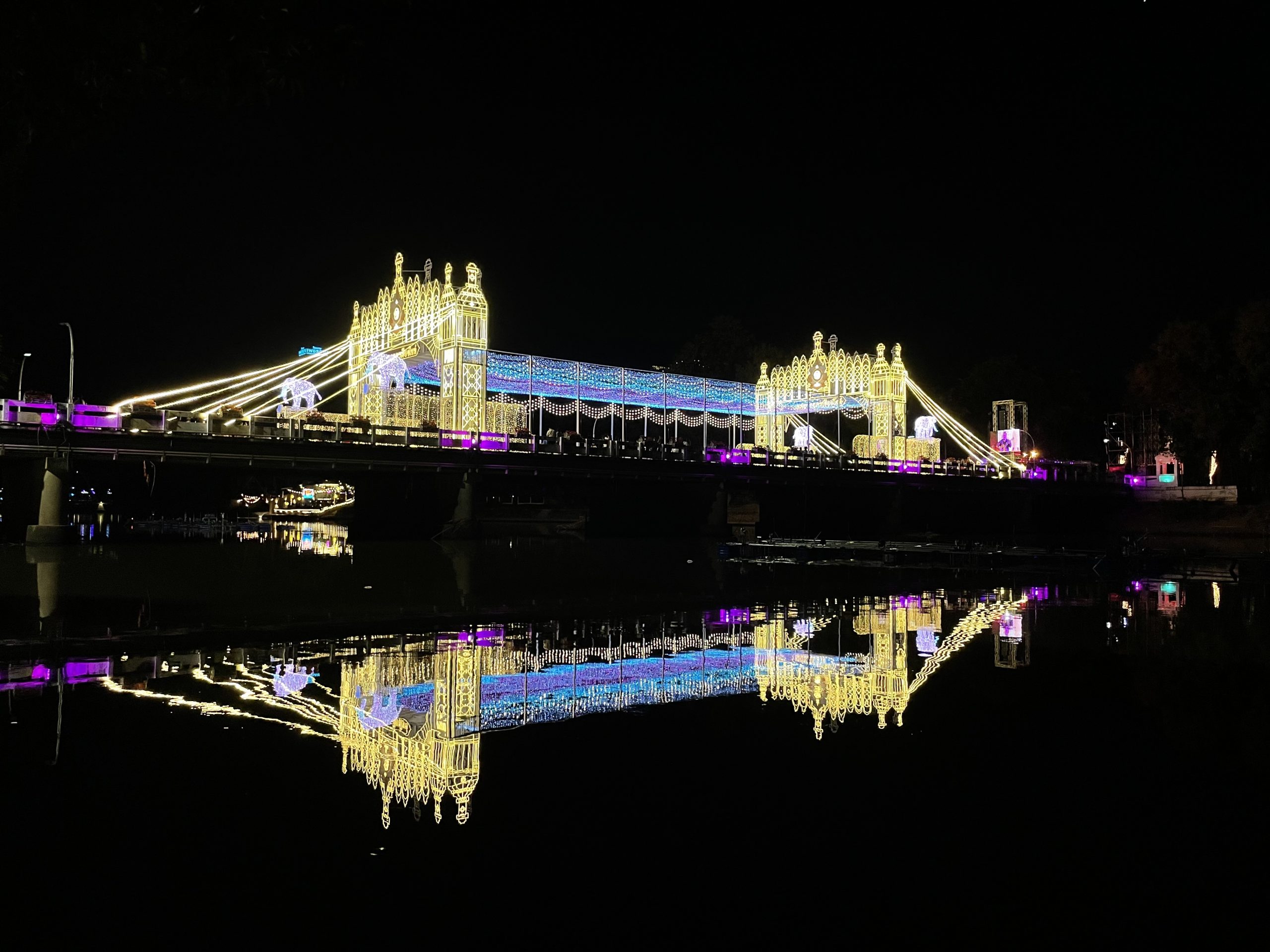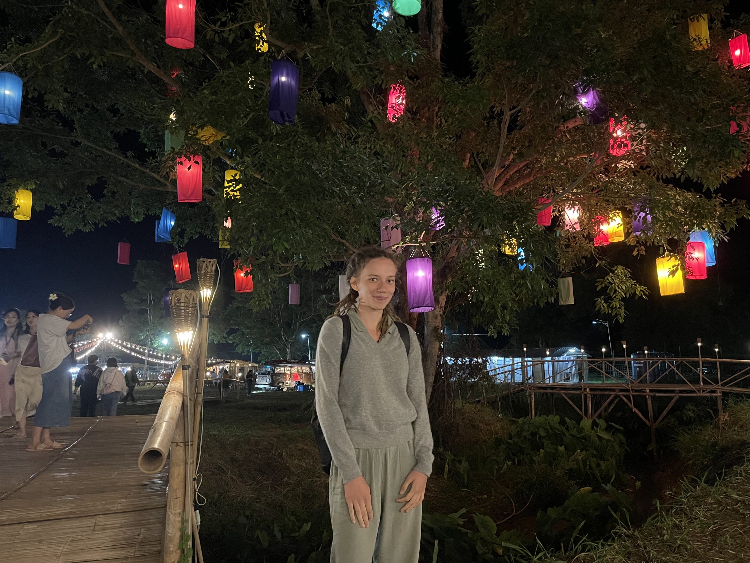 Am Abend sind wir mit dem Roller zu einer Brücke gefahren, wo die Stadt Chiang Mai einen Neujahrscountdown mit vielen Aktivitäten angeboten hat. Thies hat uns sehr sicher durch den chaotischen Verkehr gebracht, das traue ich mir bei so vielen engen Stellen mit ihm als Passagier aktuell noch nicht wirklich zu. So sind wir aber gut angekommen und waren beeindruckt davon, was dort auf die Beine gestellt wurde. Die Brücke war über und über mit gelben Licherketten umwickelt, sodass sie im Dunkeln wirklich schön geleuchtet hat. Der Hauptteil der Brücke hatte ein Dach aus blauen und violetten Lichterketten, von denen viele ein Stück hinuntergingen. Außerdem gab es einen kleinen Markt mit vielen Essenständen und eine Bühne, auf der verschiedene Künstler aufgetreten sind. Einmal in der Stunde gab es zusätzlich eine Wassershow mit mehreren Fontänen, die von Pontons auf dem Fluss abgefeuert wurden. So konnte man sie aus allen Richtungen gut sehen. Die ganze Show war zu Musik abgestimmt und wurde mit einem Feuerwerk beendet. Das alles war wirklich sehr beeindruckend, vor allem, da es bis Silvester ja noch zwei Tage waren! Zu diesem Zeitpunkt haben wir schon gemerkt, dass es eine sehr gute Entscheidung war für den Jahreswechsel nach Chiang Mai zu kommen. Es waren viele Menschen dort, aber es war nicht total überfüllt, also genau die richtige Mischung! Wider Erwarten waren nicht so viele Touristen dort. Wir waren zwar längst nicht die einzigen dort, aber es waren doch hauptsächlich Thais, die an dieser Brücke den Abend verbracht haben. Die Stimmung dort war wirklich gut und wir haben die Zeit sehr genossen. Bei der kleinen Bühne sind uns ein paar Dinge aufgefallen. Vor den eher unbekannten Musikern hatte sich eine kleine Menge versammelt. Anders als in Deutschland wurde aber eher wenig geklatscht, offenbar ist das hier einfach nicht so üblich. Auch grundsätzlich wirkten die Menschen deutlich unbeteiligter, als ich es gewohnt war. Außer zwei kleinen Mädchen tanzte oder wippte niemand mit, alle sahen nur sehr höflich nach vorne und haben teilweise gefilmt. Für mich wäre das nichts, bei einem Konzert (selbst wenn ich die Künstler nicht kenne) möchte ich eigentlich gerne mittanzen. Das sind wohl die kleinen kulturellen Unterschiede, die einem irgendwann unterkommen! Neben dem nicht-mittanzen bei den Konzerten haben wir uns bei den Straßenständen etwas zu Essen gekauft, die Shows bewundert und natürlich auch das eine oder andere Foto gemacht. Langsam kann Silvester kommen!