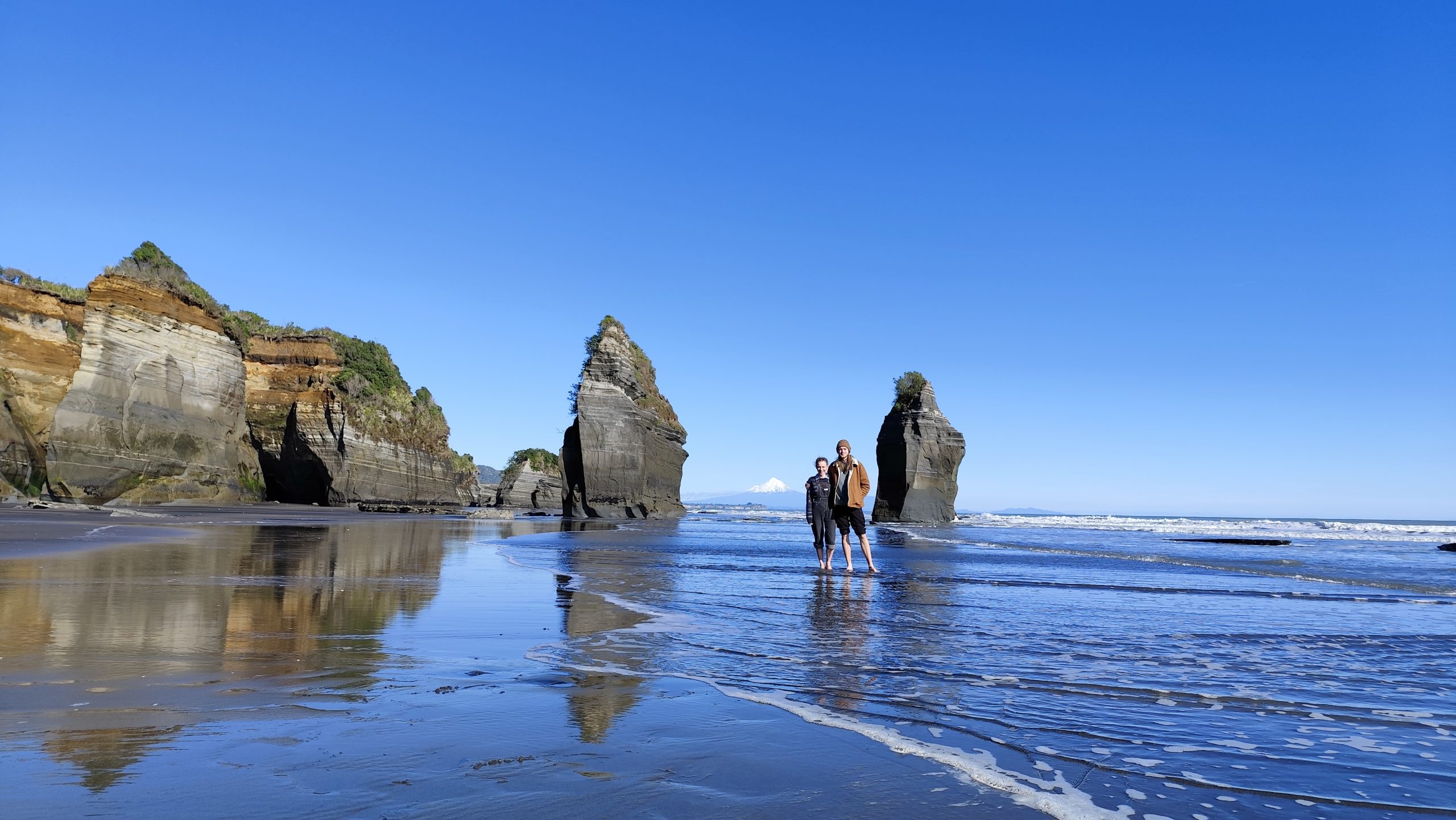 Die berühmten Gesteinsformationen nennen sich „Three Sisters“. Eine der Schwestern wurde vor ein paar Jahren in einem Sturm zerstört (was viele Einheimische wie den Verlust eines Familienmitglieds betrauert haben), das macht die Stein-Säulen für uns Touristen aber nicht weniger beeindruckend. Im Hintergrund zeigt sich der Mount Taranaki, der (wie wir finden) vom ersten Eindruck etwas an Mount Fuji erinnert. Zu ihm wollen wir später auch noch hin fahren. Gleich vor den drei Schwestern steht aber noch ein großer Felsen, der auch noch einmal ein gutes Stück riesiger und massiver ist als die anderen drei. Er wird „The elephant“ genannt und ich sehe sogar wieso. Unten durch diesen Felsen durch führen mehrere natürliche Tunnel, die etwa doppelt so hoch waren wie ich. An den Seiten gab es auch noch kleine Abzweigungen, in die ich dann aber nicht mehr gepasst habe.