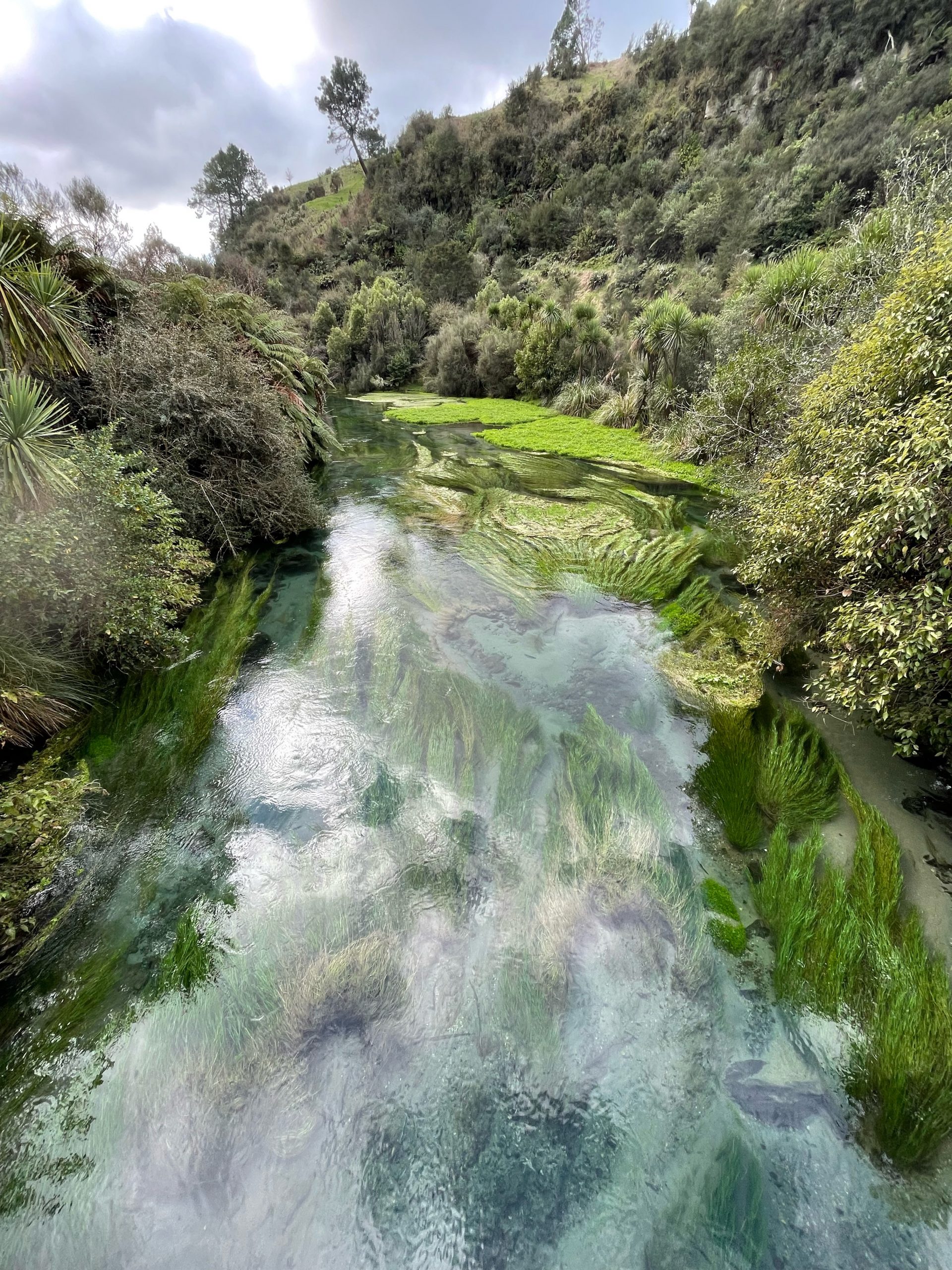 Glücklicherweise sprang unser Motor am nächsten Morgen völlig problemlos an und wir konnten weiterfahren. Die nächsten Stops waren hauptsächlich kleine Wanderwege oder Wasserfälle, die mehr auf dem Weg lagen als tatsächlich unser Hauptziel zu sein. Trotzdem sehr beeindruckend war die sogenannte „Blue Spring“. Von diesem Ort kommen etwa 70% des gesamten Flaschenwassers, das in Neuseeland genutzt wird. Zur Blue Spring hin führt ein Wanderweg an einem Fluss längs, den wir zusammen erkundet haben. Und auch wenn der Wanderweg und die umliegende Wald total schön waren, lag das besondere an diesem Ort doch im Fluss selbst. Denn das Wasser dort war so klar, wie man es sich gar nicht vorstellen könnte! Von oben sah es schon fast so aus, als wäre das Wasser überhaupt nicht da. Woran man es dann noch am ehesten erkennen konnte, waren die Seepflanzen, die auf dem Flussboden wuchsen und in dem Strömung dauerhaft in eine Richtung gezogen wurden. Wir haben natürlich versucht, dieses tolle Naturphänomen zu fotografieren, aber es ist auf keinem der Bilder so toll rübergekommen wie in echt. Hier trotzdem ein Eindruck:
