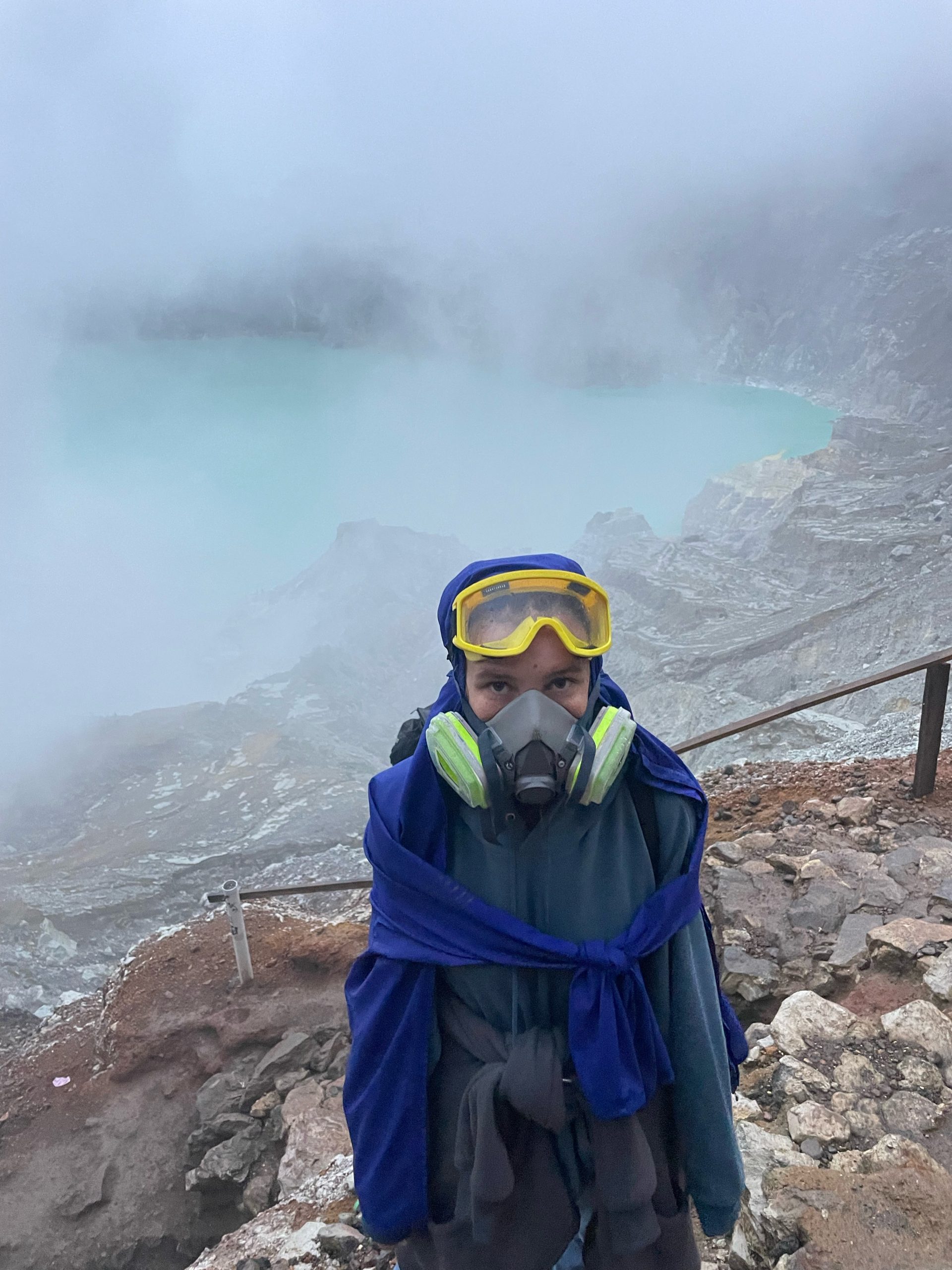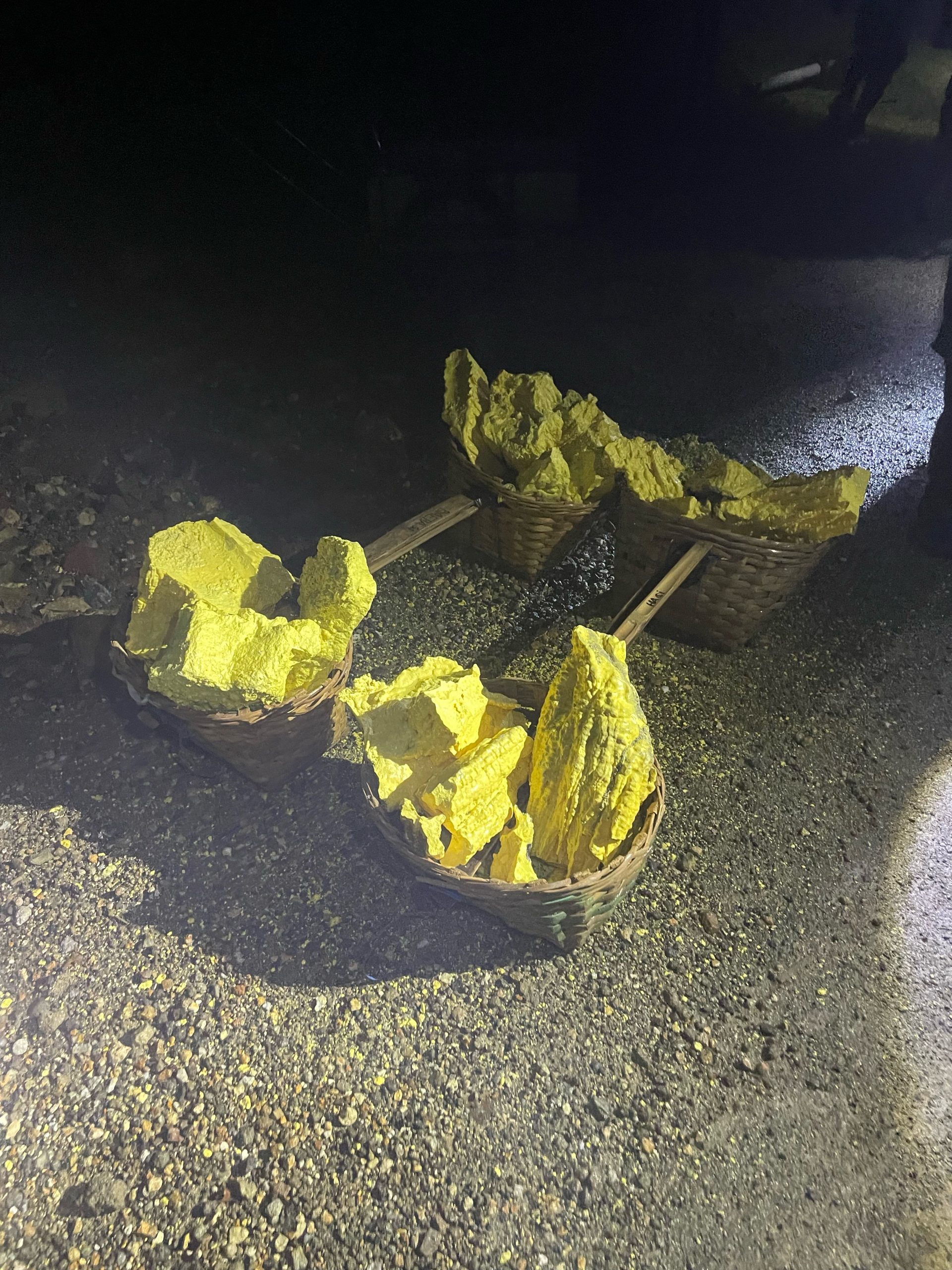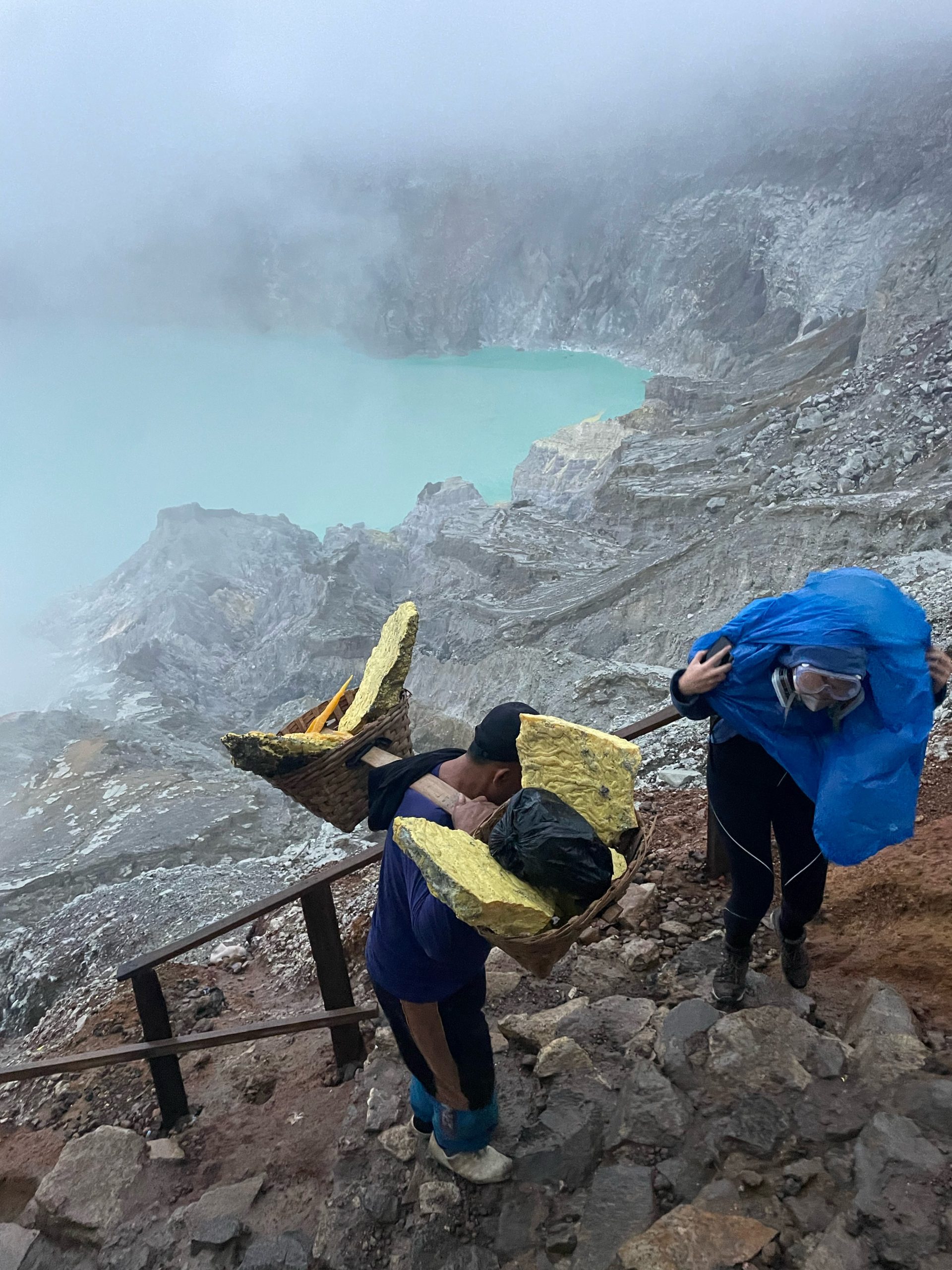 Neben den anderen Tourist:innen sind uns auch immer wieder Arbeiter entgegen gekommen, die ihre Last in zwei Körbe den steilen Weg nach oben geschleppt haben. Die beiden Flechtkörbe waren mit einer langen Stange verbunden, die von den Männern geschultert wurde, um mehr Gewicht tragen zu können. In den Körben befanden sich gelbe, große Brocken. Denn neben einem beliebten Touristenziel liegt im Krater auch ein Abbaugebiet für Schwefel, dass in Form von Dämpfen aus dem Vulkan austritt. Der abgekühlte Schwefel wird von den Arbeitern in diesen Körben den steilen Weg hinauf geschleppt, wobei die wenigsten dabei das passende Schuhwerk, Gasmasken oder eine Schutzbrille tragen. An diesem Arbeitsplatz sind sie den giftigen Dämpfen schutzlos ausgeliefert. Zu diesem Thema gibt es auch viele YouTube Videos, falls sich jemand noch weiter dazu informieren möchte.