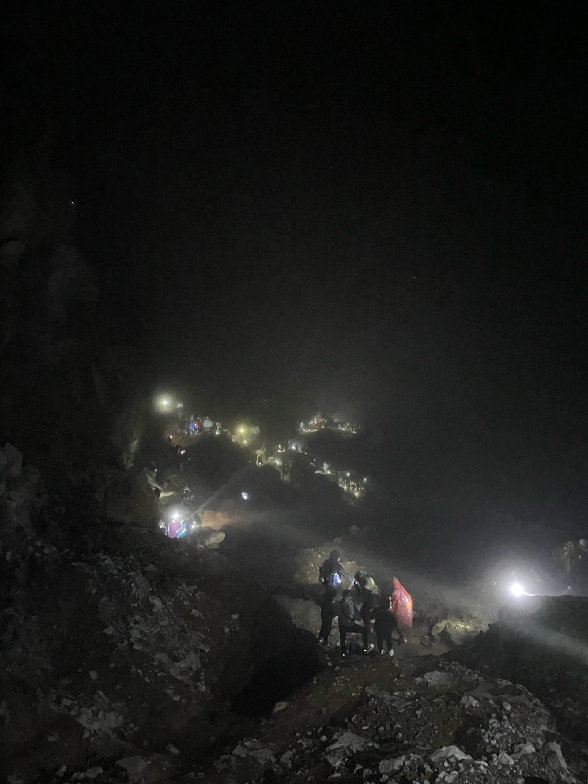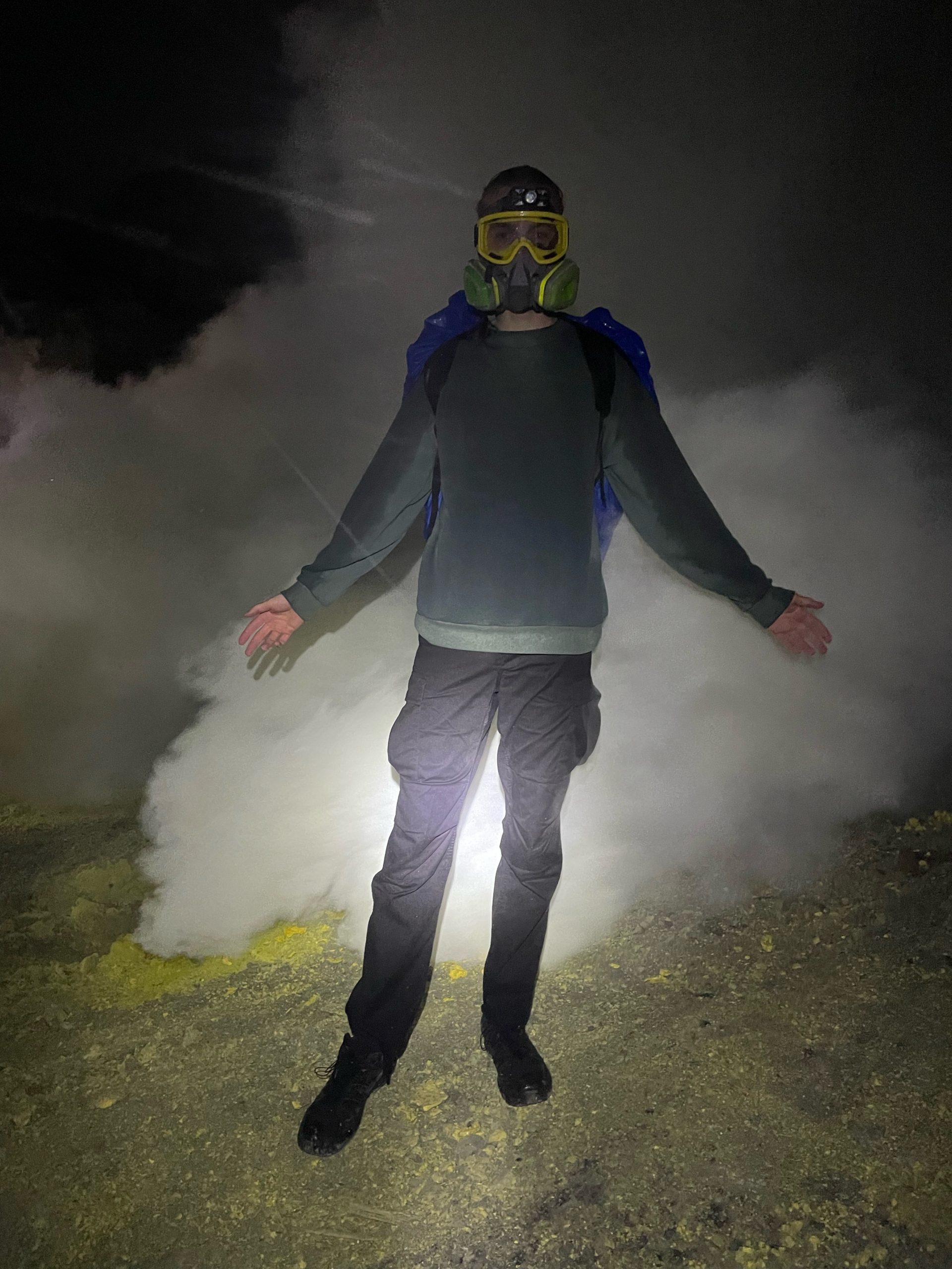 Unserem Guide hat man sehr angemerkt, dass er diese Wanderung täglich absolviert, denn er hat ein schnelles Tempo vorgegeben, dem nicht alle aus unserer großen Gruppe gut folgen konnten. Irgendwann mussten wir jedoch gezwungenermaßen langsamer werden, denn auf dem Wanderweg wurde es immer voller und voller. Bald brauchten wir die Stirnlampen nicht mehr, denn der Weg wurde von dem Licht hunderter anderer Lampen bereits genug erhellt. Der Aufstieg hat ca. eine Stunde gedauert und war ziemlich unspektakulär. Im Dunklen konnten wir natürlich nicht viel von der Landschaft sehen und so haben wir uns einfach mit den anderen Teilnehmern der Gruppe unterhalten und waren dann gegen halb vier oben am Kraterrand. Als wir uns dem Rand genähert haben, ist uns ein sehr unangenehmer Geruch in die Nasen gestiegen. Die ersten Gruppenmitglieder haben ihre Gasmasken aufgesetzt und wir beide haben es ihnen schließlich gleich getan. Dadurch hat man den beißenden Geruch immer noch riechen können, aber die Lunge wurde deutlich weniger gereizt. Und daraufhin begann der Abstieg in den Krater!