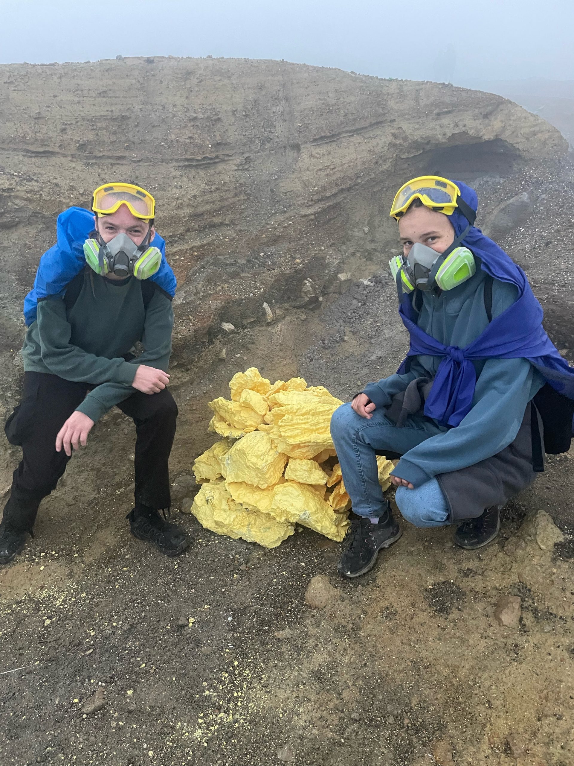 Gegen halb sieben (oder so ähnlich) haben wir es endlich an den oberen Rand des Kraters geschafft und sind dort auf andere Mitglieder unserer Reisegruppe gestoßen. Gemeinsam haben wir ein paar Bilder gemacht und konnten auch noch alleine mit ein paar Blöcken Schwefel Fotos machen.