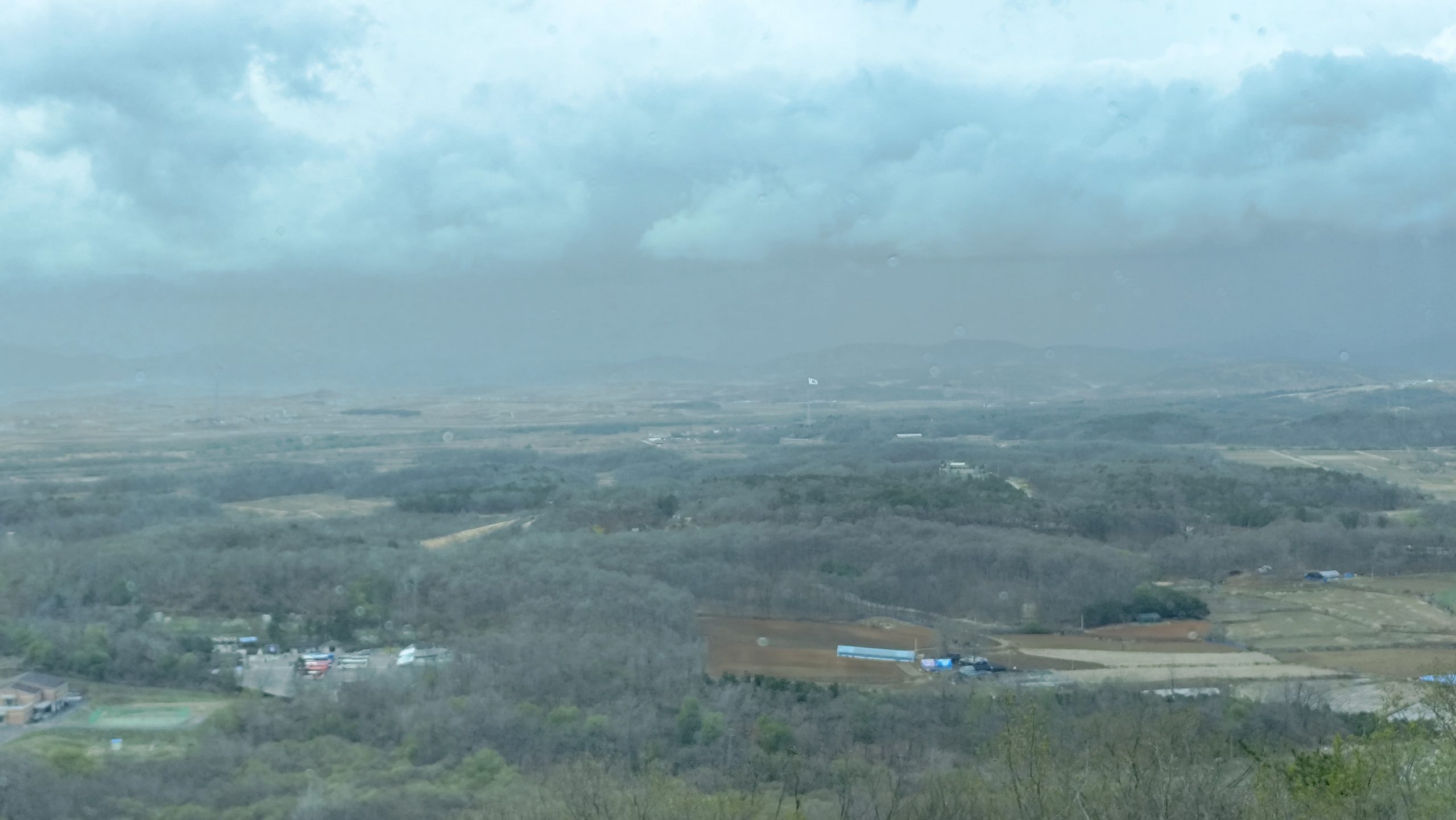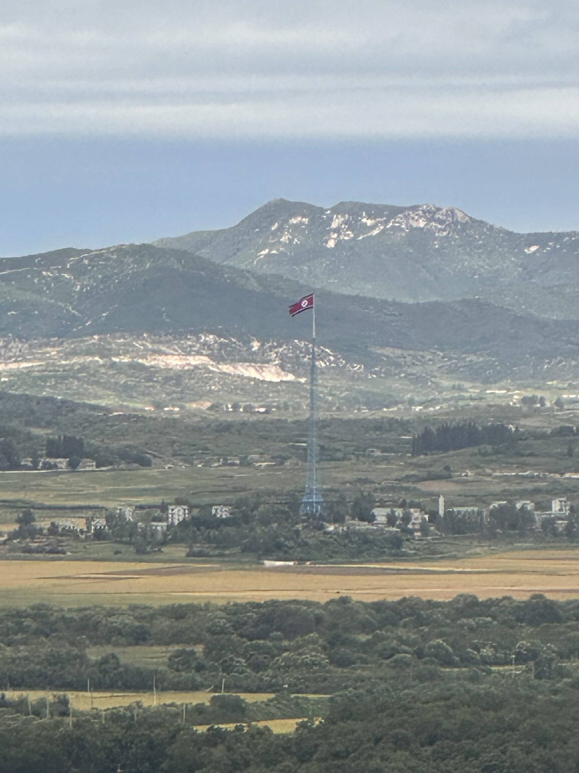 Neben den Flaggen und dem Grenzgebäude gibt es in der DMZ noch zwei Propaganda-Dörfer, eins auf jeder Seite. Im südkoreanischen Dorf , dem Daeseong-dong (Freiheitsdorf), leben knapp 150 Menschen, jedoch unter sehr strikten Bedingungen. Sie haben eine Ausgangssperre in der Nacht und müssen bei jedem Weg außerhalb des Hauses von Soldaten begleitet werden. Als „Entschädigung“ müssen sie dafür weder Steuern zahlen, noch den Wehrdienst absolvieren. Nordkorea behauptet, dass auch in ihrem Dorf, dem Kijŏng-dong (Friedensdorf), aus bunt bemalten Häusern und blauen Dächern ebenfalls Menschen leben und arbeiten. Allerdings haben die Häuser keine echten sondern nur aufgemalte Fenster und es laufen dort auch keine Menschen herum, weshalb Südkorea es als eine Attrappe bezeichnet. Unser Guide hat für die ganze Reisegruppe Ferngläser mitgebracht, sodass wir uns alle Gebäude und auch die beiden Flaggen genau ansehen konnten. Auch von dieser Plattform durfte man offiziell keine Bilder machen. Da diese Regelung aber nur so halb durchgesetzt wurde, je nachdem ob man gerade von einem Guard beobachtet wurde oder nicht, haben wir hier trotzdem ein Foto von Nordkorea für euch: