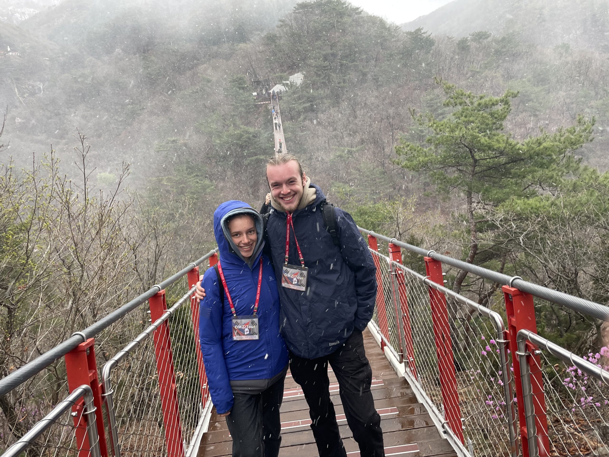 Nach einer fünfzehnminütigen Fahrt mit dem großen Reisebus sind wir an einem Ort angekommen, der auf den ersten Blick gar nichts mit Nordkorea oder dem Krieg zu tun hat. Nach einer kurzen Wanderung hat unsere Gruppe den Rand einer langen Brücke erreicht. Sie ist über 10 Meter hoch und über 220 Metern die längste Hängebrücke in ganz Südkorea. Genau als wir dran waren die lange Brücke zu überqueren, hat es ordentlich angefangen zu wehen und zu regnen. Durch den starken Wind hat die Brücke ein bisschen geschwankt und unsere Überquerung so etwas spannender gestaltet. Nach wenigen Minuten hat es jedoch schon wieder aufgehört, weshalb ich zum Glück nicht ganz durchgefroren war. In den Bergen, zwischen denen sich die Brücke heute aufspannt, wurde im Koreakrieg heftig gekämpft. Unter anderem hat dort eine ganze britische Einheit ihr Leben verloren, als sie als letzte UN-Truppe versucht haben die Stellung zu halten, während alle anderen Truppen bis nach Busan (eine Stadt im Südosten Südkoreas) zurückgedrängt wurden. Zum Gedenken dieser Soldaten hängt dort heute neben der Taegeukgi (so heißt die südkoreanische Flagge) auch der Union Jack (offiziell Union Flag) aus Großbritannien.