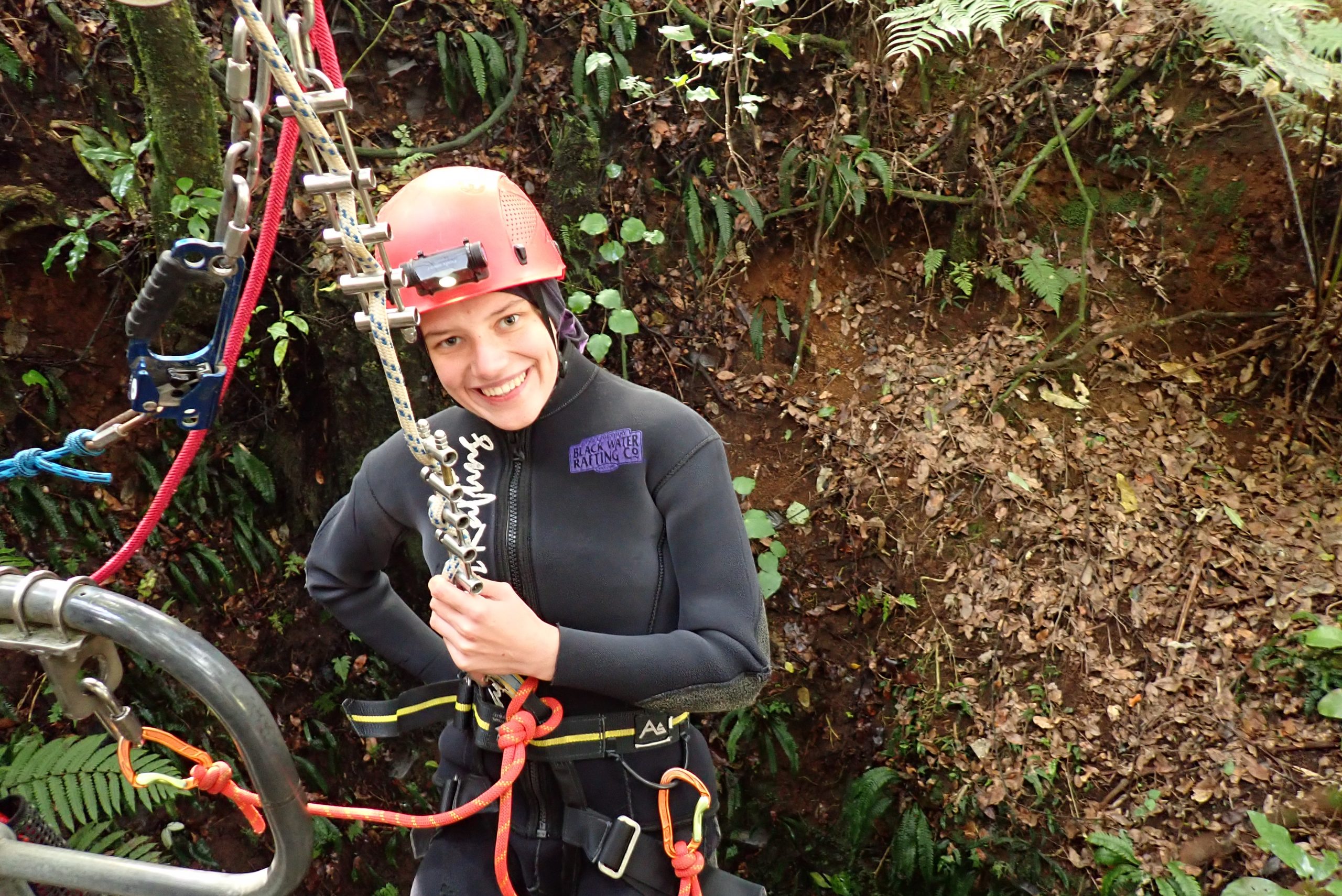 Etwa um 09:00 Uhr Morgens standen Beeke und ich vor der Tür einer Organisation, die Touren durch ebendiese Höhlen veranstaltet. Natürlich sollte dies keine normale, geführte Tour werden, aber ich will noch nicht zu viel verraten. Bevor wir überhaupt in die Nähe der Höhle gelassen wurden, bekamen wir in unserer kleinen Gruppe aus sechs Personen eine Sicherheitseinweisung. Unsere beiden Guides statteten uns mit einem Wetsuit, Neopren-Shirts, Gummistiefeln, Neopren-Socken, einem Helm mit einer Kopflampe, einem Hängegurt und Karabinern aus. Beeke bekam als einziges Mädchen der Gruppe und als kleinste eine extra Lage an Neopren als Kälteschutz, zusammen mit dem (berechtigten) Kommentar: „Du siehst aus, als würdest du schnell frieren“. Danach wurden die wichtigsten Sicherheitsregel kurz durchgesprochen und daraufhin ging es auch schon los. Mit einem Van wurden wir alle zu einem Höhleneingang verfrachtet. Kurz bevor wir uns diesem näherten mussten wir jedoch noch an einem kleinen Hügel eine Technik lernen, die uns helfen würde, überhaupt in die Höhle zu gelangen. Der Eingang war nämlich nicht mehr als ein Loch, was sich etwa 30 Meter tief streckte und gerade so breit genug war für einen Menschen. In genau dieses Loch sollte sich dann jeder von uns, einer nach dem anderen, abseilen.