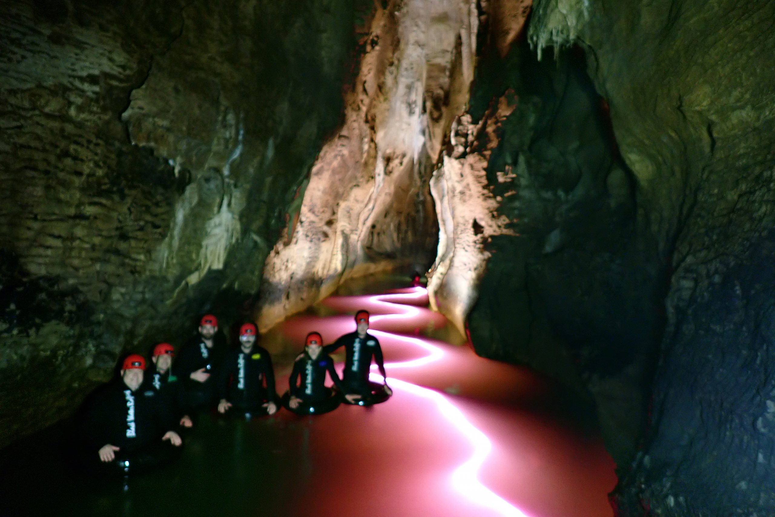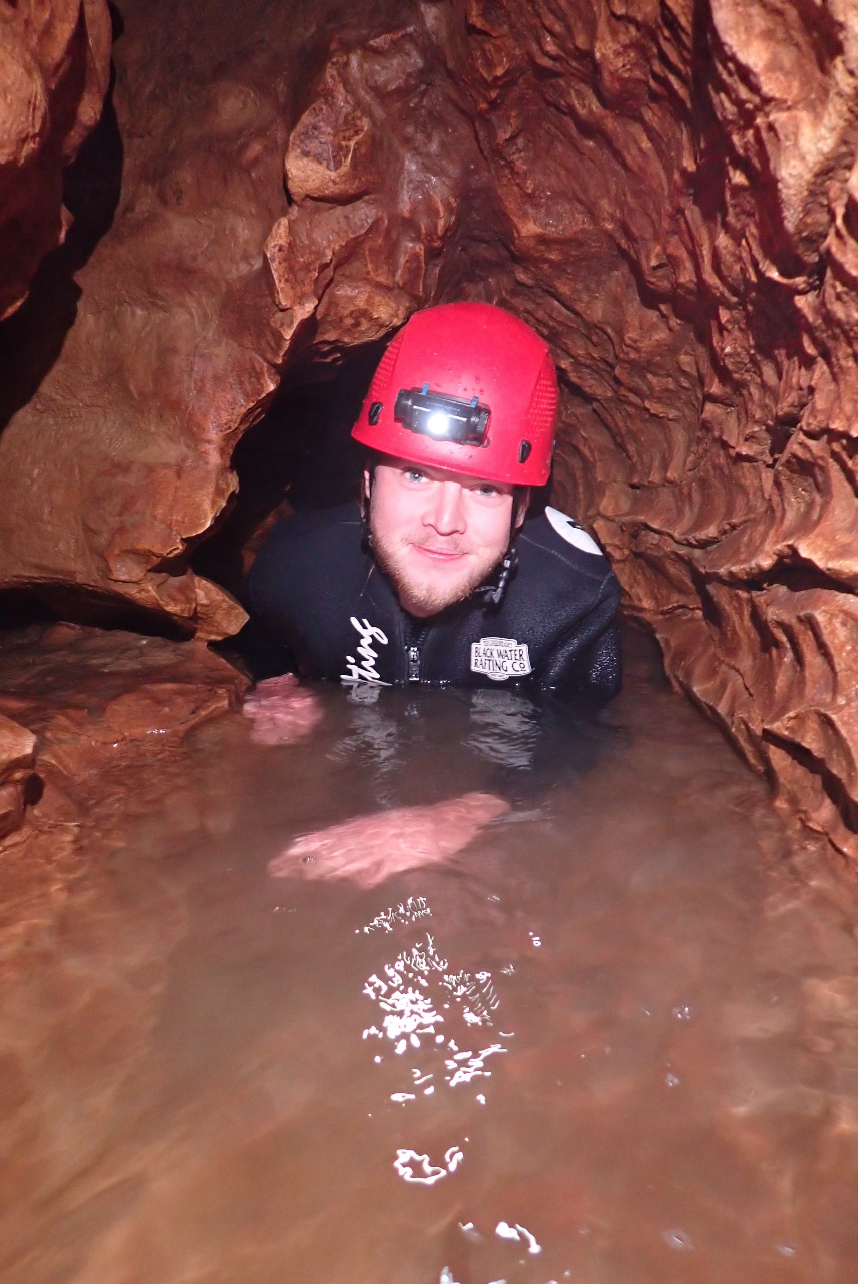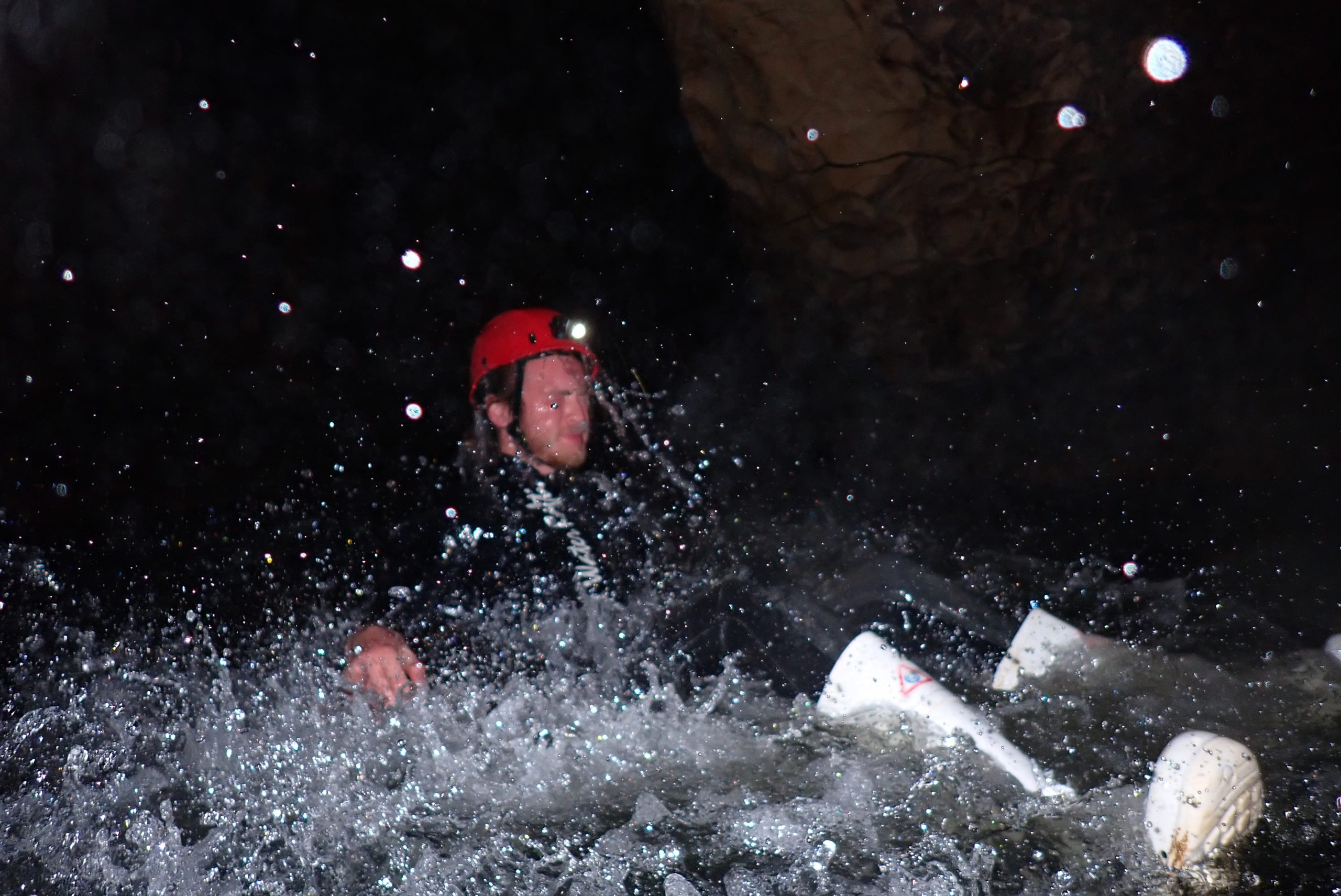 Als ich im Wasser ankam merkte ich aber direkt, dass auch Neopren leider nicht alle Kälte fern halten kann. Nach wenigen Sekunden kroch die Kälte durch den Anzug in meine Haut und das obwohl ich noch gar nicht ganz im Wasser war. Wir konnten von der Kante aus so springen, dass wir gleich sitzend auf unserem Schwimmring landeten. Nach und nach landete einer nach dem nächsten in dem eiskalten Wasser. Am Rand des Flusses befand sich ein Seil, an dem man sich durch den Fluss ziehen konnte. Als dann auch der letzte unserer Truppe im Wasser angekommen war, haben wir uns als Gruppe zusammengeschlossen und haben uns der Kälte gewidmet. Ein paar Meter flussaufwärts war der Flusslauf flach genug, um stehen zu können. So nahmen wir also alle unsere Schwimmringe in die Hand und joggten durch den Matsch, etwa 200 Meter weiter in die Dunkelheit. Das Joggen war keineswegs einfach und so wurde uns allen wenigstens etwas wärmer. Doch das war auch nötig. Hin und wieder haben wir kleine „Cave-Raves“ gestartet, wenn man aufeinander warten musste. Man stelle sich also 6-8 Personen vor, die mitten in der Dunkelheit, ohne Musik und tief unter der Erde nebeneinander tanzten, um etwas Wärme zu erzeugen. Eine Ansicht, die ich so schnell auch nicht mehr vergessen werde.