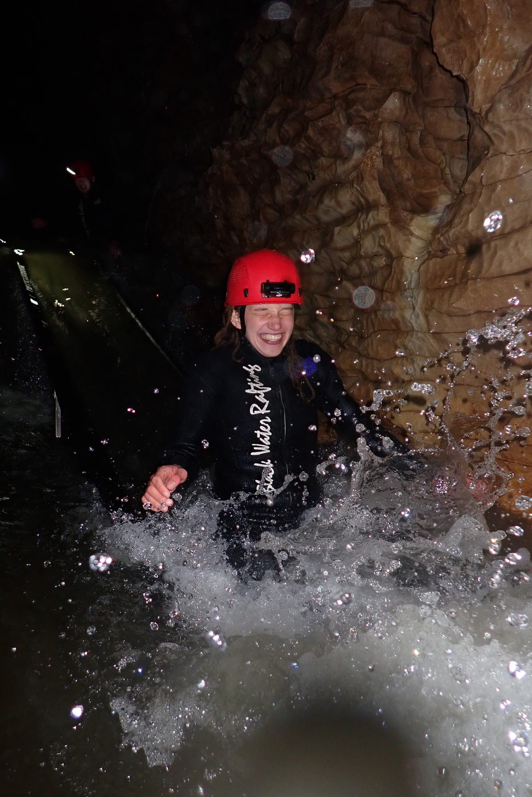 Als nächsten Punkt auf der Tagesordnung stand eine kleine Pause an. Gleich neben dem Vorsprung auf dem wir gerade saßen floss ein unterirdischer Fluss längs, gleich einige Meter breit. Wir setzten uns alle an die Kante und wurden von unseren großartigen Guides mit heißem Kakao und Keksen versorgt – ein Service, den ich etwa 60 Meter unter der Erde so nicht erwartet hätte! Die Wärme tat total gut, denn mit jedem Meter Tiefe wurde es auch ein wenig kälter. Der kalte Stein, auf dem wir saßen, hat dabei natürlich auch nicht gerade geholfen. Mit diesen Snacks ein bisschen zu entspannen und sich das erste Mal untereinander austauschen zu können war so aber total schön. Trotzdem ließ die nächste abenteuerliche Aktion nicht zu lange auf sich warten.