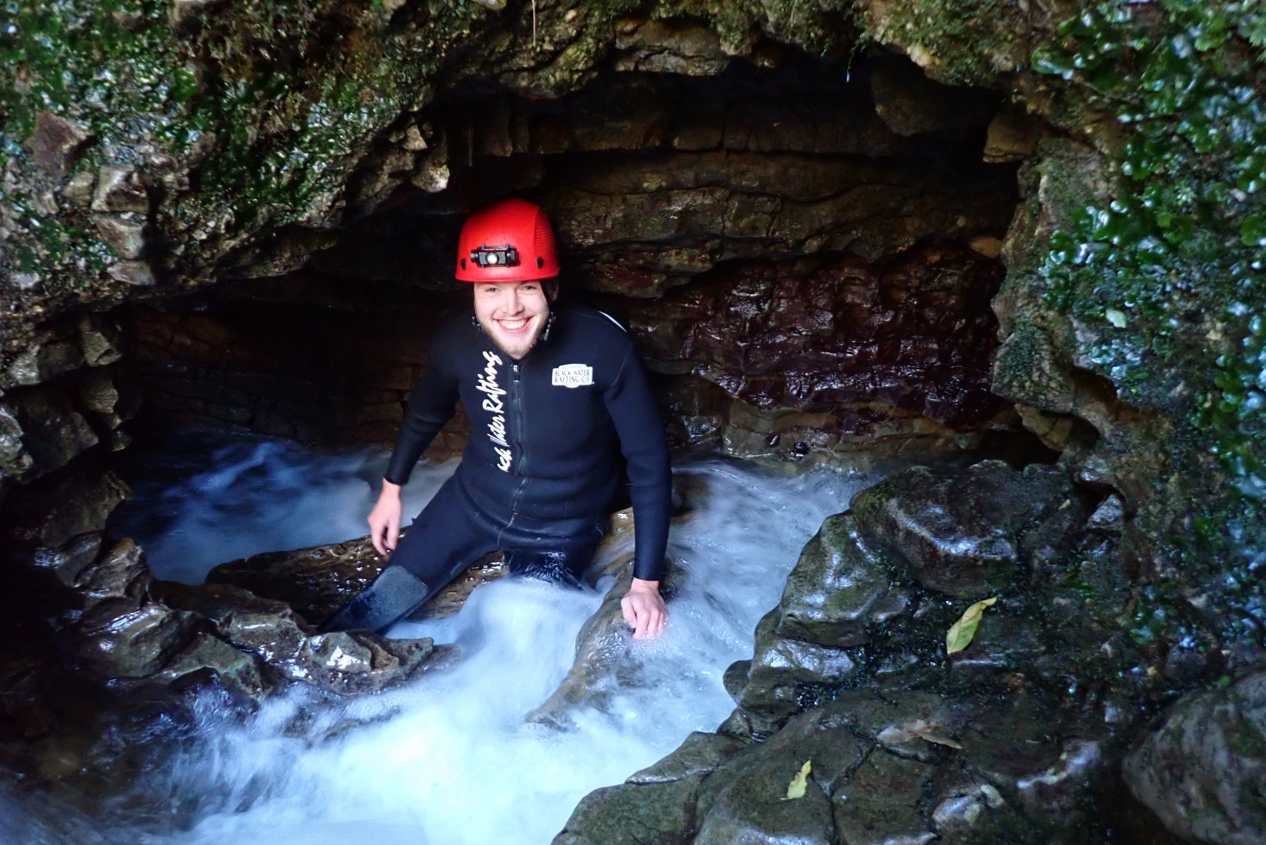 Es ging wieder, wie davor, im Freeclimb einen Wasserfall hoch. Wieder wurde uns beim Platzieren von Füßen und Händen geholfen und wieder hat es das fallende Wasser nicht gerade einfacher gemacht. Nach ein paar Metern hatte ich den Wasserfall überwunden und konnte nun durch einen engen Gang krabbeln und kriechen, der wenn dann gerade so groß genug zum darin knien war. Jedenfalls für mich, Beeke konnte dort wahrscheinlich stehen. Nach einer kleinen Kurve habe ich aber endlich, nach etwa fünf Stunden, das erste Mal wieder Tageslicht gesehen! Der Ausgang war auch der Ort, an dem das Wasser in die Höhle floss und als ich gerade durch das Loch kam, entdeckte ich auch den Guide mit der Kamera: