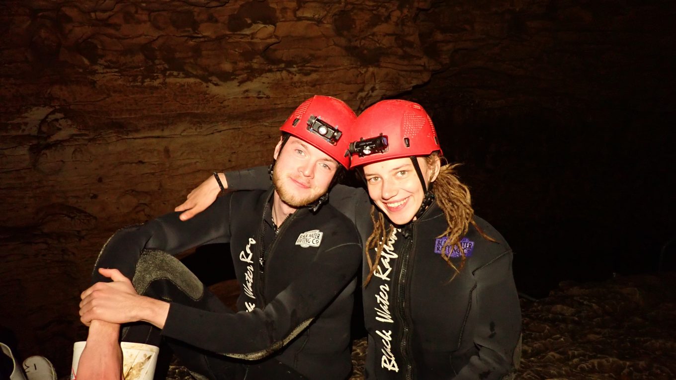 Als ich im Wasser ankam merkte ich aber direkt, dass auch Neopren leider nicht alle Kälte fern halten kann. Nach wenigen Sekunden kroch die Kälte durch den Anzug in meine Haut und das obwohl ich noch gar nicht ganz im Wasser war. Wir konnten von der Kante aus so springen, dass wir gleich sitzend auf unserem Schwimmring landeten. Nach und nach landete einer nach dem nächsten in dem eiskalten Wasser. Am Rand des Flusses befand sich ein Seil, an dem man sich durch den Fluss ziehen konnte. Als dann auch der letzte unserer Truppe im Wasser angekommen war, haben wir uns als Gruppe zusammengeschlossen und haben uns der Kälte gewidmet. Ein paar Meter flussaufwärts war der Flusslauf flach genug, um stehen zu können. So nahmen wir also alle unsere Schwimmringe in die Hand und joggten durch den Matsch, etwa 200 Meter weiter in die Dunkelheit. Das Joggen war keineswegs einfach und so wurde uns allen wenigstens etwas wärmer. Doch das war auch nötig. Hin und wieder haben wir kleine „Cave-Raves“ gestartet, wenn man aufeinander warten musste. Man stelle sich also 6-8 Personen vor, die mitten in der Dunkelheit, ohne Musik und tief unter der Erde nebeneinander tanzten, um etwas Wärme zu erzeugen. Eine Ansicht, die ich so schnell auch nicht mehr vergessen werde.