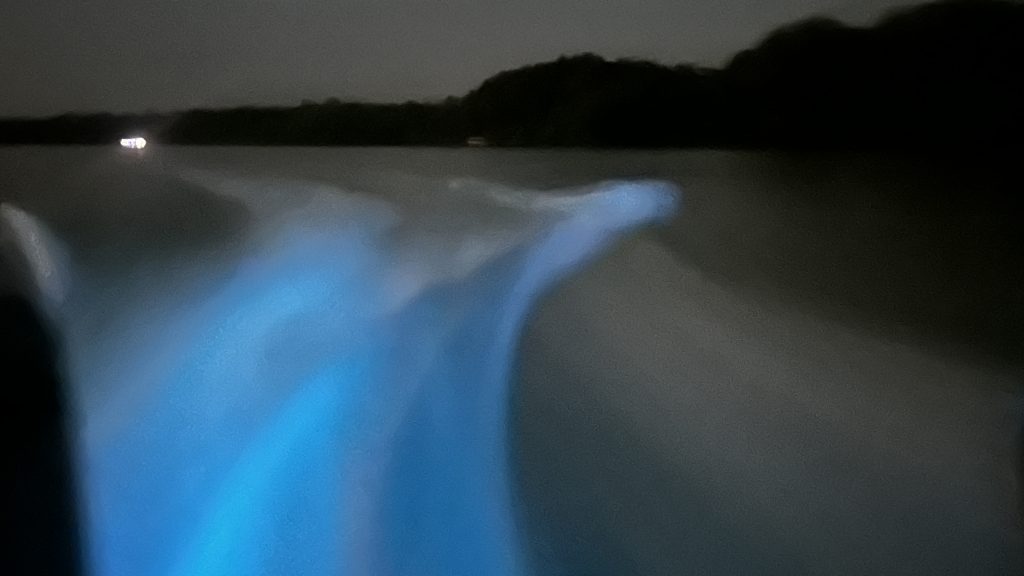 Doch meine Lieblingsstation lag immer noch vor uns! Mittlerweile war es stockdunkel und wir sind den Fluss wieder runter Richtung Mündung gefahren. Dort hat jeder von uns einen Kescher bekommen. Mit diesem haben wir dann die Wasseroberfläche aufgewirbelt, woraufhin diese blau geworden ist!