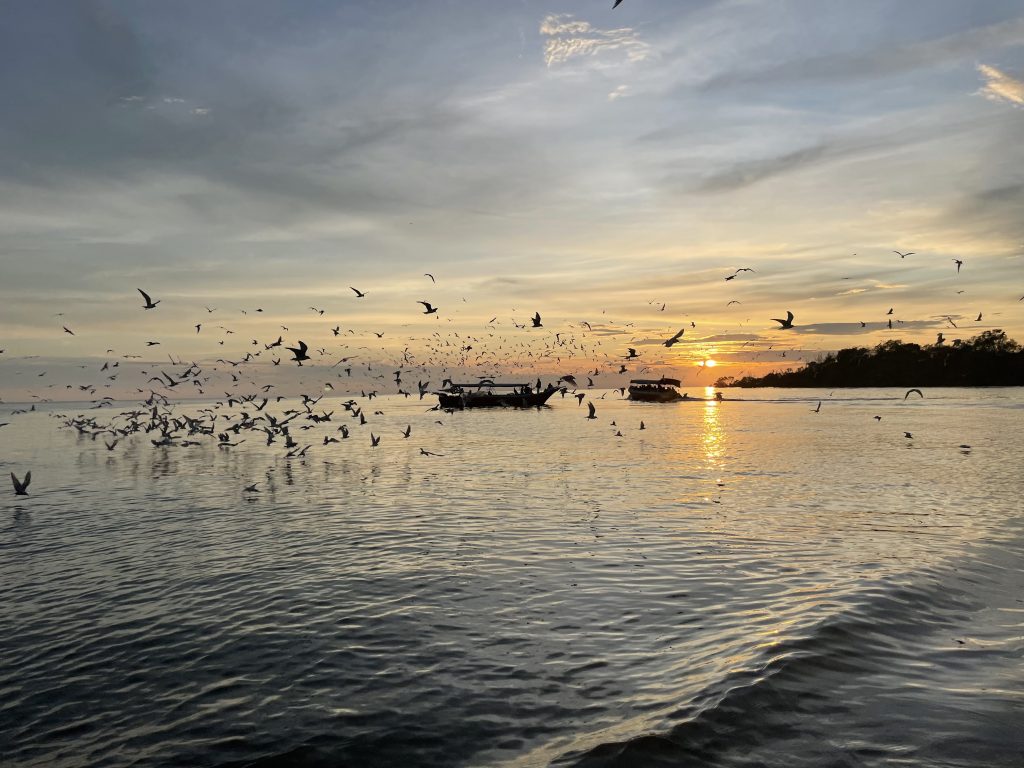 Zuerst sind wir dem Fluss bis zur Mündung im Meer gefolgt. Dort waren schon ein paar andere Boote, die die Aussicht genossen haben. Denn über dem Wasser kreisten mindestens 20 Adler und über 100 kleinere weiße Vögel. Jeder der Fahrer warf ihnen zwischendurch Essen ins Wasser, um sie an der Stelle zu halten. Die Adler sind von einigen Metern über der Wasseroberfläche herunter gesturzflugt und haben sich die Fleischbrocken dann aus dem Wasser geschnappt, nur um dann sofort wieder aufzusteigen. Die kleineren Vögel haben sie dabei umschwirrt und haben versucht auch etwas Futter abzubekommen. Zu dieser ohnehin schon wunderschönen Szene fing dann auch noch die Sonne unterzugehen.