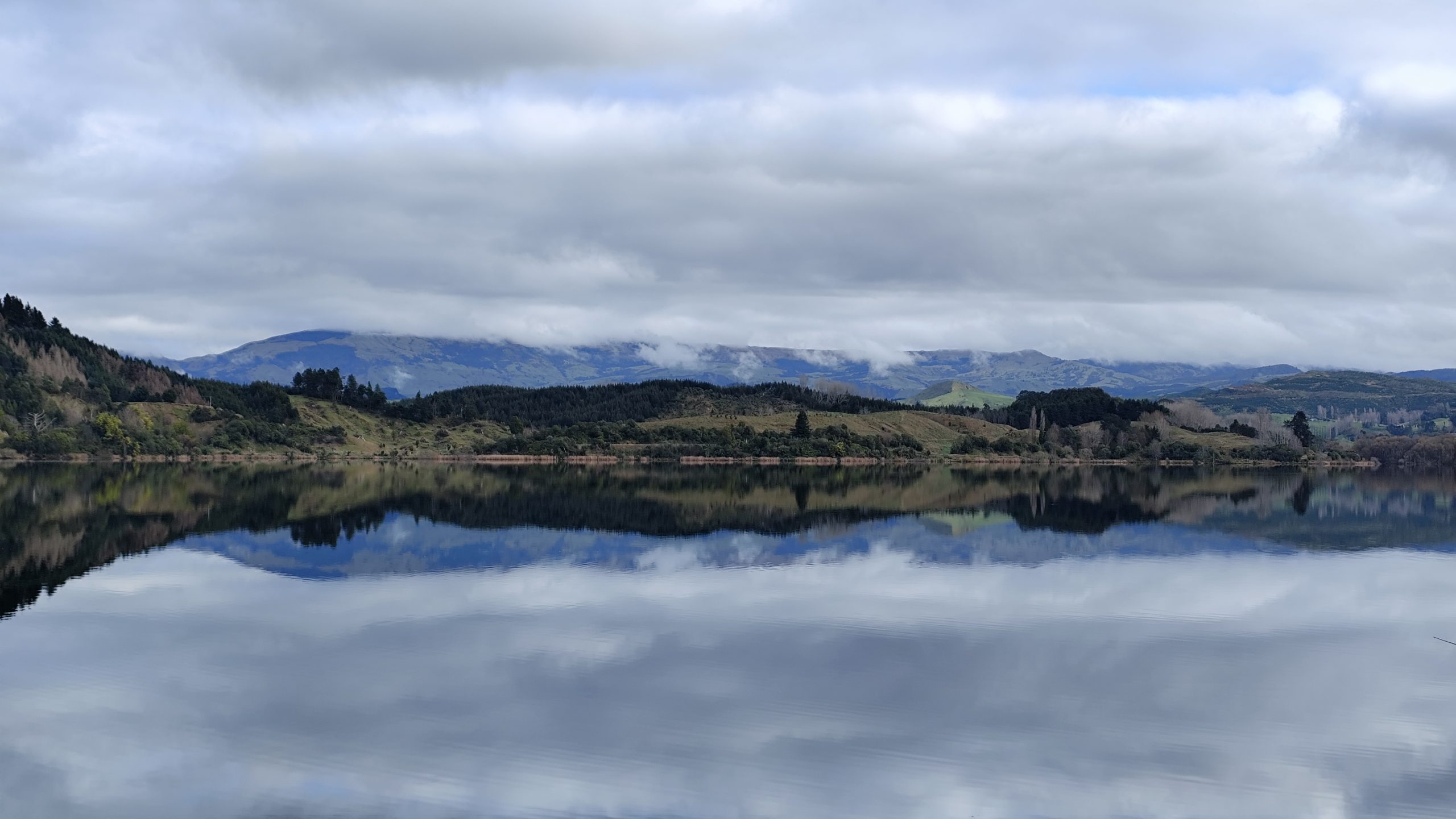 Wir haben uns bald dazu entschlossen, die Nacht nicht hier zu verbringen. Wir sind also noch einmal ein Stück weiter nördlich gefahren, wo angeblich ein weiterer kostenloser Campingplatz sein sollte. Nach etwa 30 Minuten kamen wir dort an. Im ersten Moment wirkte es nicht groß anders, als der vorherige Platz. Da es an dem Ort kein künstliches Licht gab, konnten wir auch nicht sonderlich viel von der Umgebung erkennen. Doch an einer Stelle sahen wir ein Schild aus dem Busch gucken: „Freedom Campers this way ->“. Das war alles, was wir brauchten. Dem Schild folgend kamen wir kurz darauf an einer großen Wiese an, die glücklicherweise auch weit entfernt von der Landstraße lag. Abgesehen von drei Zelten und einem Wohnmobil waren wir hier alleine, es war also schön ruhig. Auf der Fahrt über den kleinen Sandweg zur Wiese haben wir schon bemerkt, dass wir uns relativ nah an einem See befanden. Die Straße ging oft am Ufer längs und an einigen Stellen war sie sogar etwas überflutet. Dass wir am nächsten Morgen so eine tolle Aussicht haben würden, konnten wir trotzdem nicht erahnen: