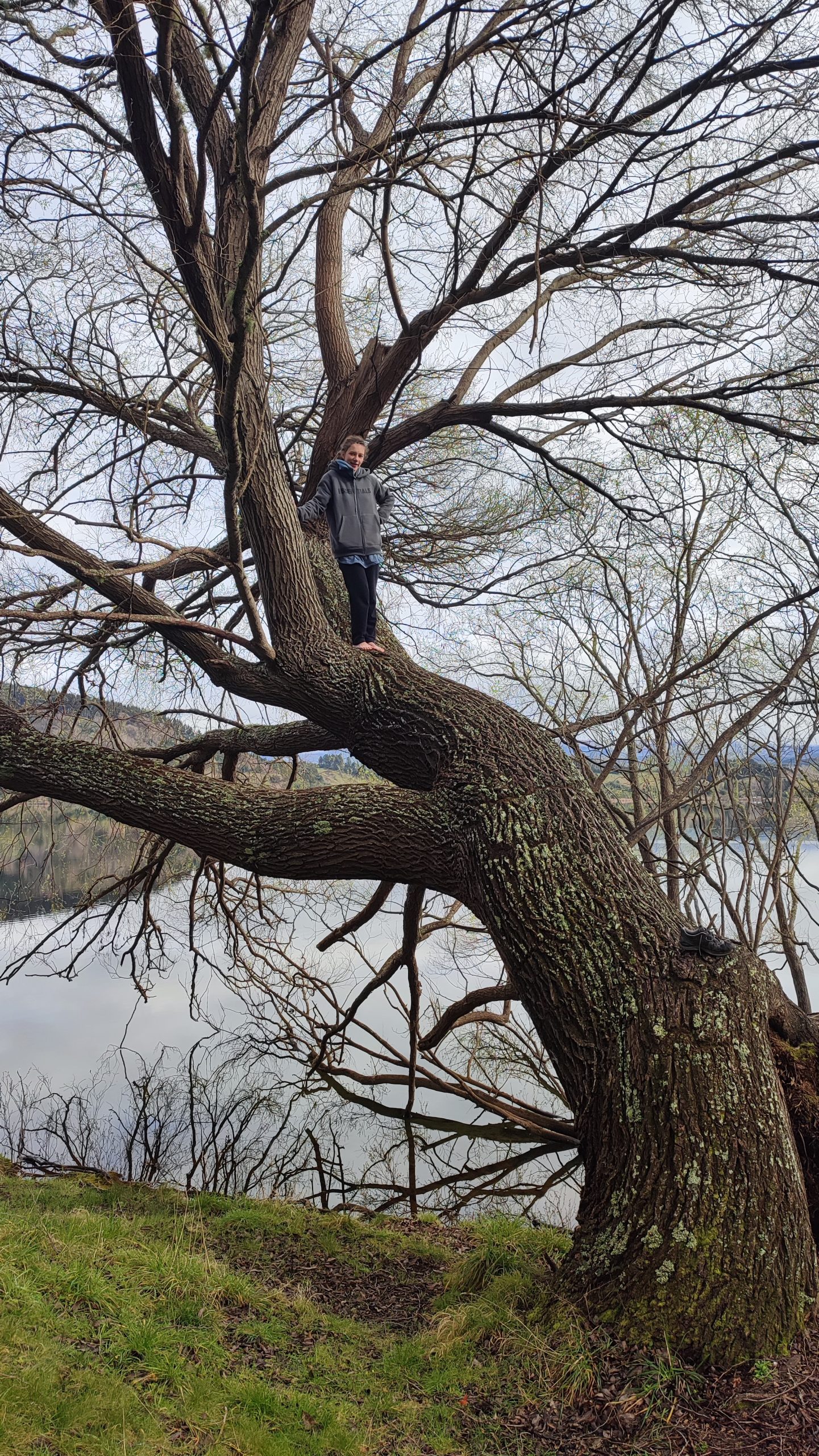 Gleich neben unserem Auto befand sich einer kleiner Unterstand mit einer Bank, worauf wir großartig frühstücken konnten. So eine Aussicht beim Frühstück zu haben ist schon ein tolles Gefühl. Direkt daneben befand sich ein Baum, der zur Hälfte auf und in dem See lag und sich perfekt zum Klettern anbot. So konnten wir noch eine ganze Weile an diesem Ort bleiben und die Zeit genießen – und das obwohl wir ursprünglich nur nach einer kleinen Bucht am Wegesrand gesucht hatten, an der wir die Nacht verbringen könnten.