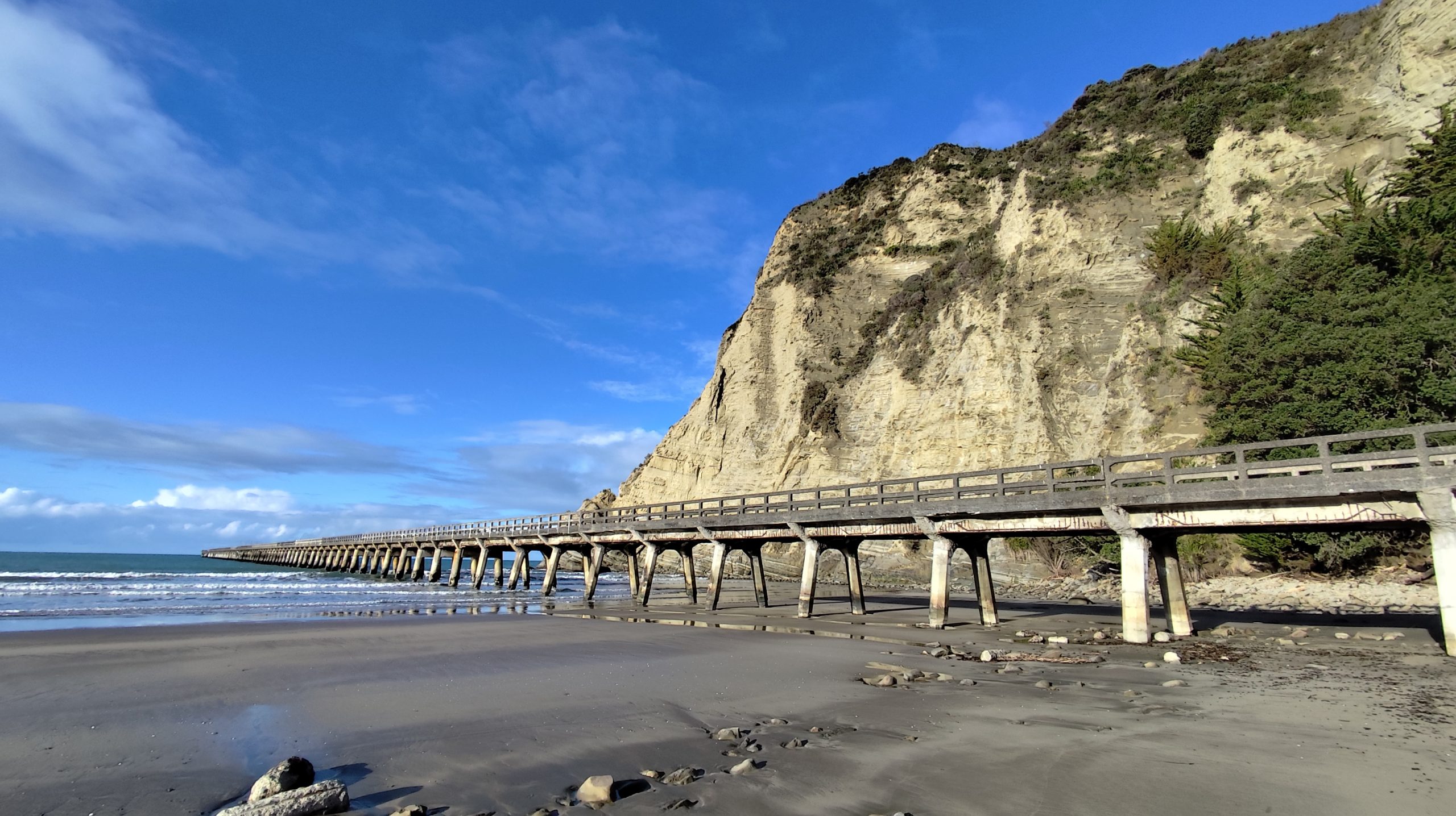 Am 25. August, einen Tag nachdem wir den Raketenstart angesehen haben, ging es gleich weiter auf der Halbinsel, die in der Region „Gisborne“ liegt. Ein großer Teil dieses Abschnitts war reines Fahren, wobei die Aussicht dafür häufig auch sehr gut war. Ein Stop den wir zwischendurch machen konnten war an einem Strand ziemlich im Nirgendwo. Das besondere hier war, dass in dieser Gegend früher ein relativ großer Handelshafen lag. Dementsprechend standen noch einige Gebäude von früher und auch ein Steg. Dieser Steg war etwa 300-400 Meter lang und führte aus einer Bucht hinaus. Leider war er ab etwa der Hälfte des Weges gesperrt, da er langsam aber sicher auseinander fällt und es nicht mehr sicher wäre, diesen aktiv zu nutzen. Trotzdem haben wir hier einige Fischer gesehen, die auch an der Hälfte des Steges noch ganz glücklich gewesen zu sein schienen.