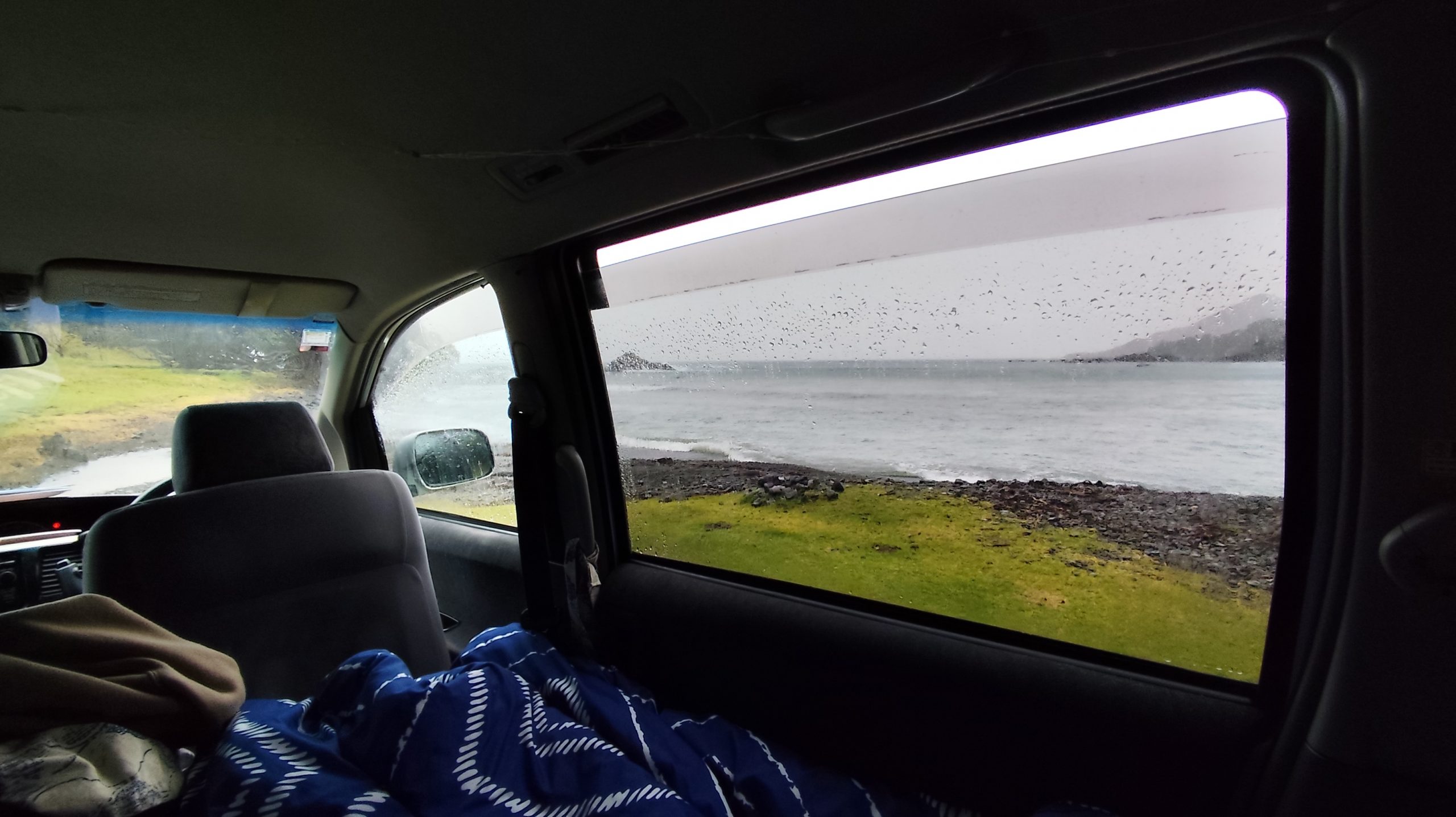 Nach einem weiteren Tor verwandelte sich die Straße dann in einen Sand- und Kiesweg. Etwas später wurde dieser immer hügeliger und es bahnten sich einige Schlaglöcher an. Nachdem wir dann einen erstaunlich steilen Hügel runtergefahren sind, hatten wir unser Ziel für die Nacht erreicht. Wir standen direkt am Wasser, an einem Steinstrand mitten im Nirgendwo! Neben uns war nur ein anderer Camper da, der aber noch am gleichen Abend wieder gefahren ist. Leider hat es den Abend wieder durchgehend geregnet, dafür haben wir am nächsten Morgen dieses tolle Foto von unserem Auto und dem Stellplatz machen können: