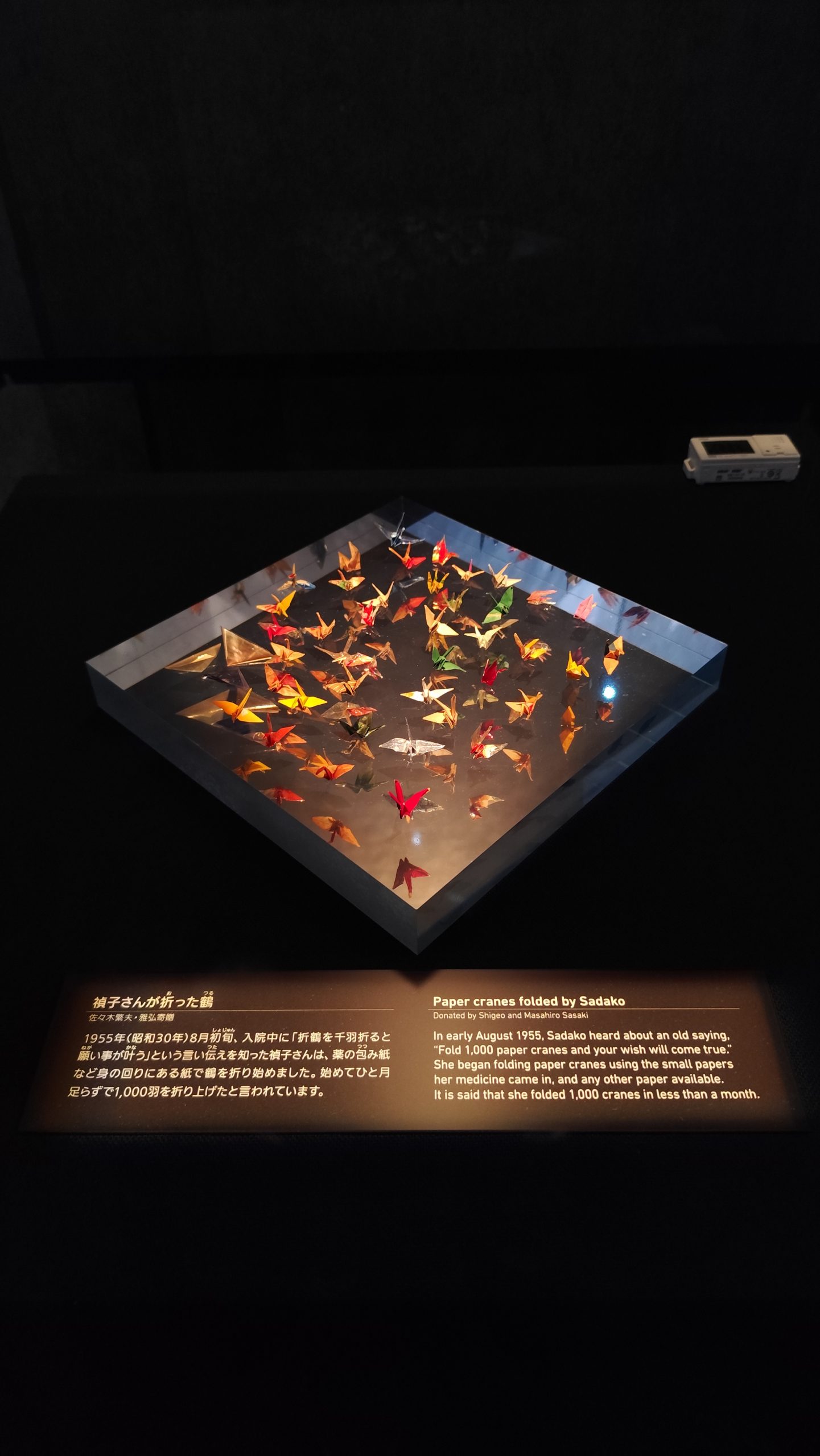 Aber auch Menschen, die eigentlich keine physischen Schäden davon getragen hatten, konnten ihr Leben noch Jahre später verlieren. Es wurde sehr ausführlich die Geschichte eines Mädchens dargestellt, die 10 Jahre nach dem Anschlag an Leukämie erkrankte und schließlich auch daran starb. Durch die Strahlung ist das Risiko für viele Krankheiten deutlich erhöht, was auch Jahre oder Jahrzehnte später erst eintreten kann. Das Schicksal des Mädchens, Sadako Sasaki, trieb ihre Mitschüler:innen an eine Petition zu starten. Sie sammelten Geld und Unterschriften und schafften es schließlich damit, dass drei Jahre nach Sadakos Tod ein „Kinder-Friedens-Denkmal“ im Peace-Memorial Park errichtet wurde. Das Zeichen dieses Denkmals ist ein fliegender Origami-Kranich. Nach einer alten japanischen Legende wird ein Wunsch von den Göttern erfüllt werden, wenn man 1.000 Kraniche faltet. Es ist nicht ganz klar, ob sie diese Zahl erreicht hat, auf jeden Fall wurde sie dank ihrer Mitschüler:innen trotzdem mit 1.000 Kranichen begraben. So schön dieses Symbol für Weltfrieden und Hoffnung ist, so traurig ist auch ihre Geschichte, so wie jedes der grausamen Schicksale, die wir an diesem Tag gelesen haben.