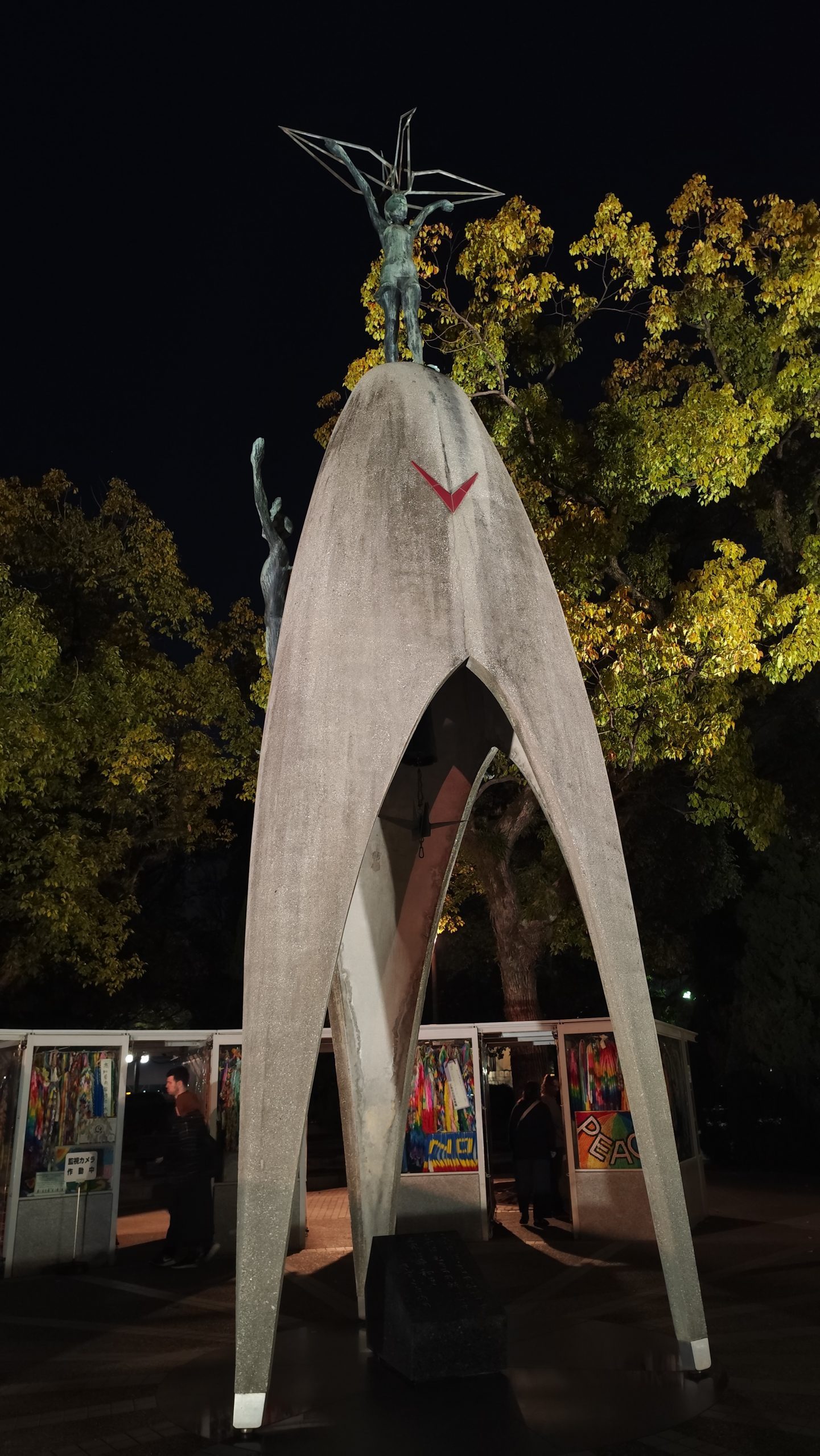 So ging unser letzter ganzer Tag in Hiroshima auch schon zu Ende, denn für den nächsten Abend hatten wir schon den Nachtbus nach Fukuoka gebucht. Am 24.03. haben wir nochmal den Peace Memorial Park besucht. Nach dem unserem Museumsbesuch war es schon dunkel, deshalb haben wir den Besuch des Parks auf einen anderen Tag, also heute, verschoben. Die Anlage ist ziemlich groß und wird von einem Kanal getrennt. Im nördlichen Teil steht der Atomic Bomb Dome. Wir haben uns lange auf eine Bank am Kanal gesetzt und die halb zerfallenen Mauern und die zerstörte Kuppel betrachtet. Südlich des Kanals sind über die große Fläche verschiedene Denkmäler verteilt. Ein Teil des Hauptdenkmals ist eine brennende Flamme. Diese soll erst gelöscht werden, wenn alle Atomwaffen auf der ganzen Welt zerstört sind. Neben dem bereits erwähnten Denkmal für Kinder gab es auch eines konkret für diejenigen Schüler:innen und Student:innen, die für den Abriss von Gebäuden in der Innenstadt mobilisiert worden waren. In einem andern Teil des Parks kann man die Friedensglocke läuten, auf der ein Abbild der Weltkarte eingraviert ist. Ihr Klang soll für Frieden in der ganze Welt sorgen. Diese Bauten sind nur einige der vielen Denkmäler und Erinnerungsstätten auf dem Parkgelände.