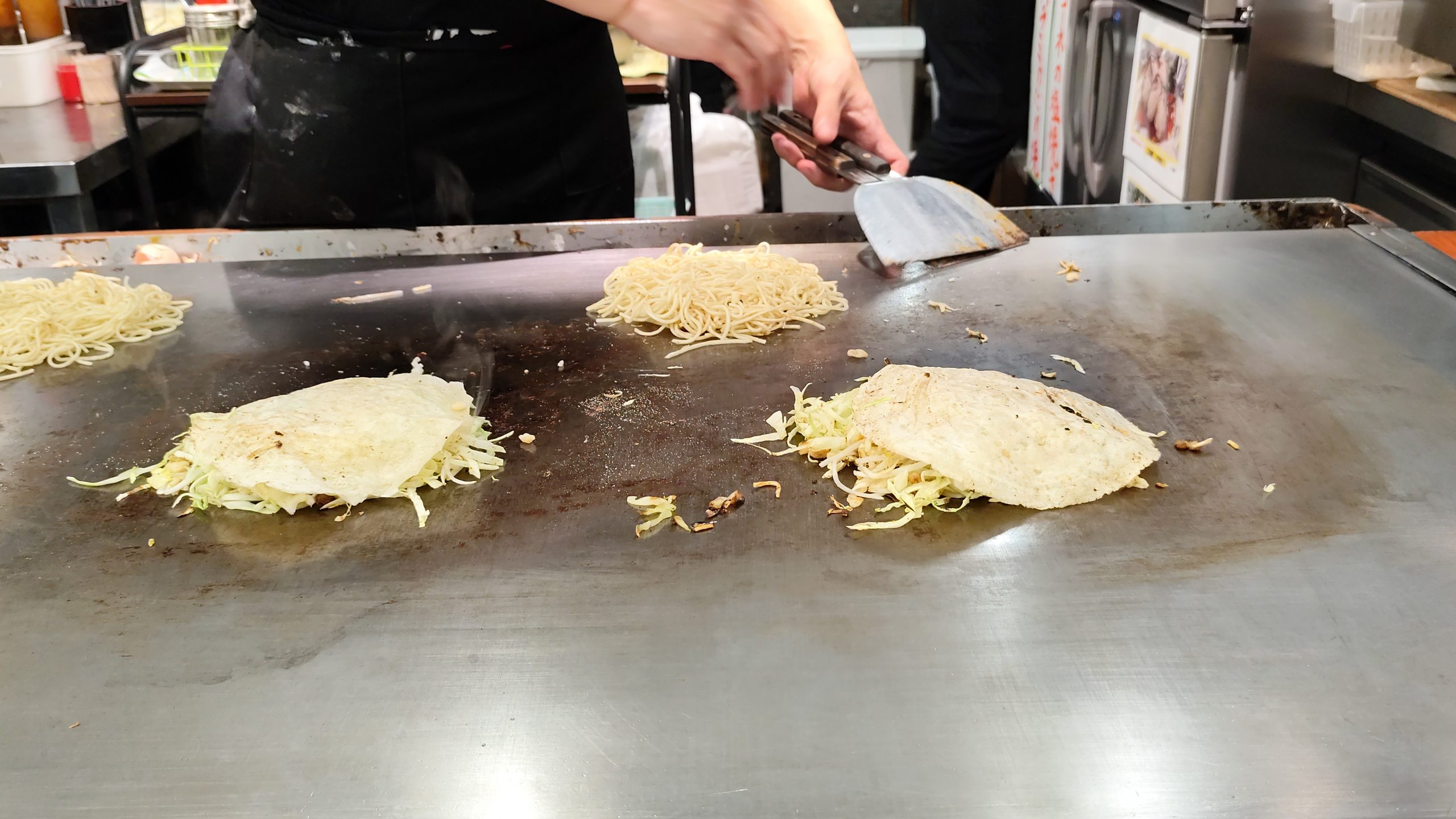 Abends haben wir ein letztes Mal Okonomiyaki gegessen, jedoch nicht in einem gewöhnlichen Restaurant! Hiroshima ist bekannt für seine Okonomiyaki und deshalb gibt es seit mehreren Jahrzehnten das „Okonomimura“. Dieses vierstöckige Haus (dessen Fassade an das Essen angepasst ist) beherbergt Dutzende Okonomiyaki-Stände. An jedem Stand sitzt man um die heiße Herdplatte herum und dahinter stehen die Köch:innen, die das Essen vor den Augen der Gäste zubereiten. Trotz der großen Auswahl haben wir erst im dritten Stockwerk einen passenden Stand gefunden, der auch eine vegetarische Variante angeboten hat. Das ist zwar nicht die traditionelle Machart, schmeckt aber trotzdem richtig gut! Ich werde dieses Essen wirklich vermissen…