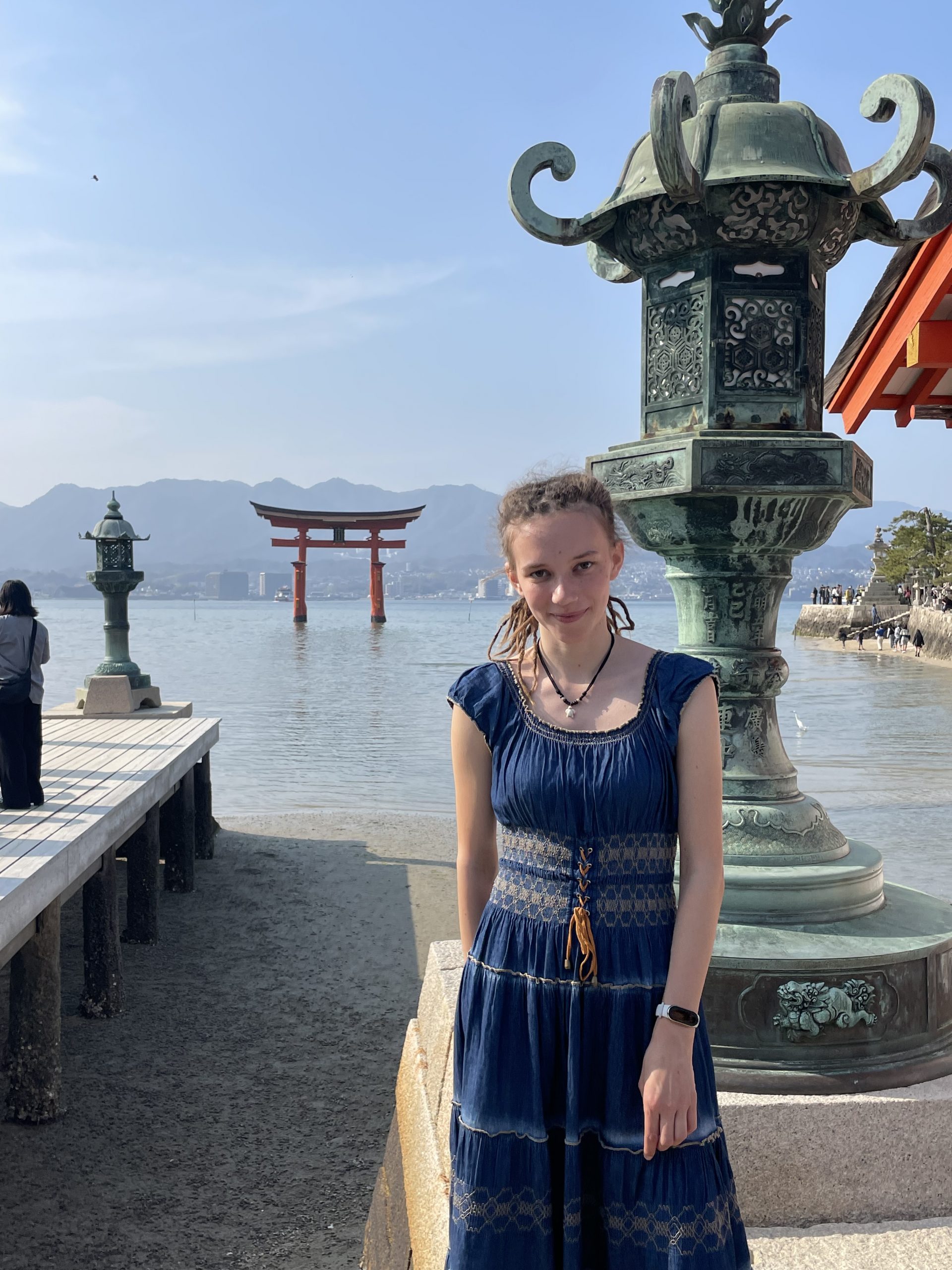 Wir sind mit der Straßenbahn in den Süden von Hiroshima gefahren und sind dann auf die Fähre umgestiegen. Schon während der halbstündigen Fahrt konnten wir ein Stück abseits das Tor und den dazugehörigen Schrein (er heißt Itsukushima Schrein) sehen.