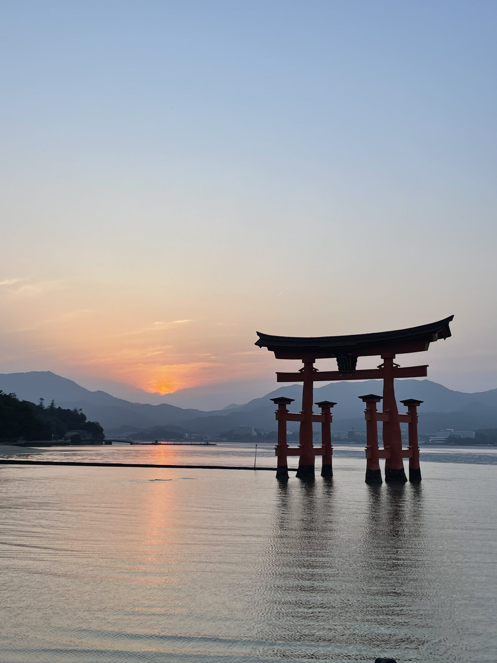 Trotz dieser Unterbrechung hat sich das Warten auf den Sonnenuntergang sehr gelohnt. Mit den bunten Farben sah das Meer und das berühmte Shinto-Tor noch so viel mystischer und schöner aus, als in den Stunden davor tagsüber! Eigentlich wollten wir gar nicht gehen, aber da es nach Sonnenuntergang schnell kälter werden würde, mussten wir eine Fähre vor Einbruch der Dunkelheit nehmen.