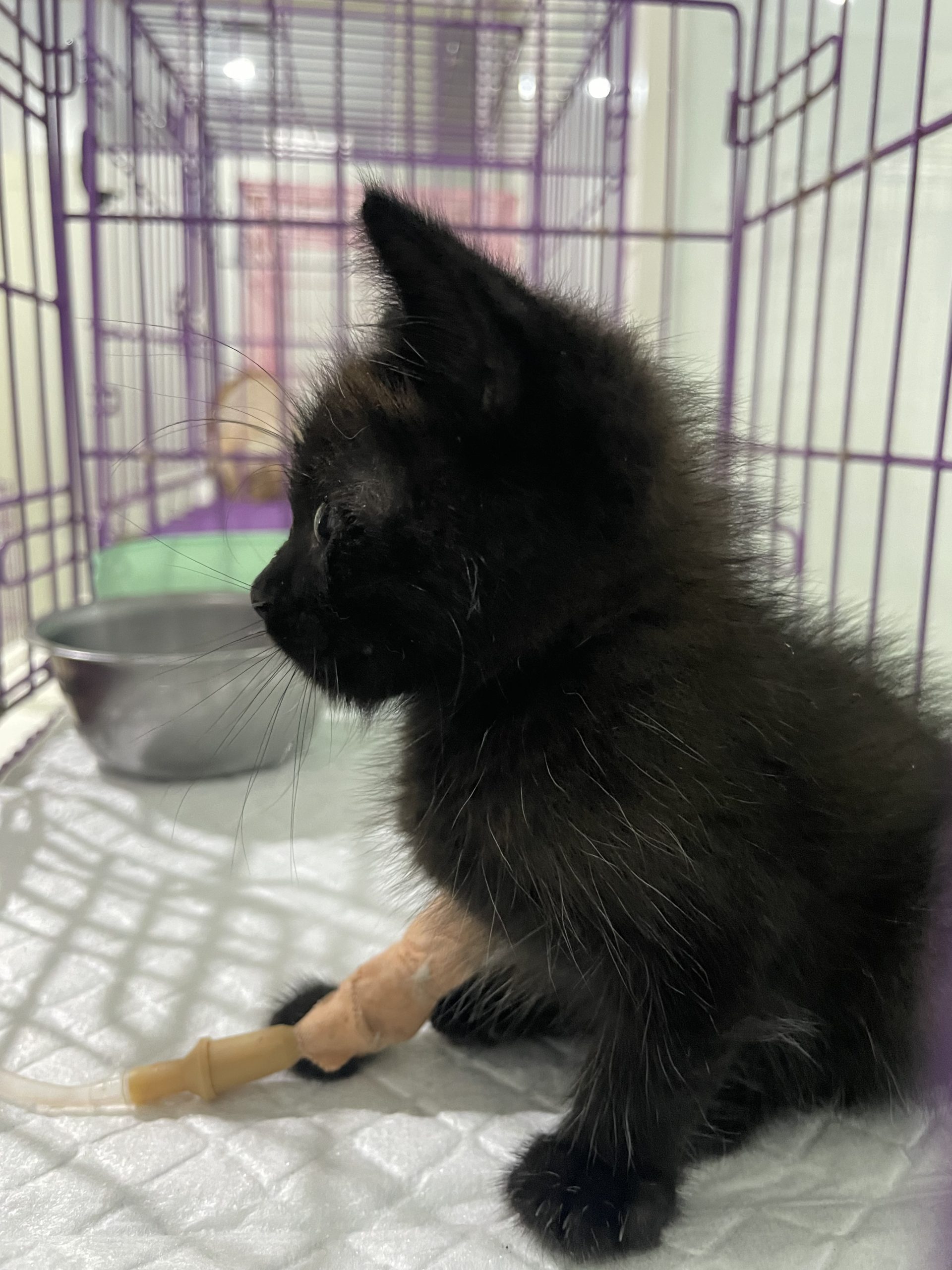 Als wir sie am späten Nachmittag besucht haben, war sie ganz guter Dinge. Ihre Verfassung ist stabil und sie scheint die OP bisher recht problemlos überstanden zu haben. Ihr Auge sieht (trotz der Nähte) schon viel besser aus als gestern und sie konnte sich einigermaßen normal bewegen, nur eingeschränkt durch den Infusionszugang an ihrer Hinterpfote. Sie scheint also nicht allzu schlimme Schmerzen zu haben und hat unsere Hände durch den Käfig verfolgt. Revna hat sich ausführlich streicheln und kraulen lassen, war jedoch weniger aktiv, als in den letzten Tagen. Wer kann es ihr nach einer solchen OP verdenken? Am Ende unseres Besuchs hat sie sich in einer Käfigecke zusammengerollt und geschlafen, so ein süßes kleines Fellknäuel!