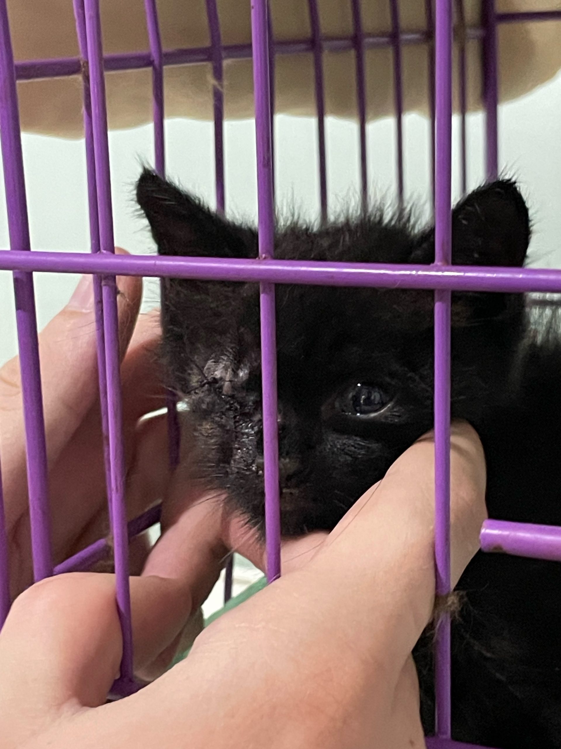 Nach näherer Betrachtung hat Thies festgestellt, dass ihr rechtes Auge stark verletzt ist. Der Augapfel steht nach oben und der ganze Bereich ist stark geschwollen. Im Dunkel der Gasse konnten wir nicht viel mehr erkennen, allerdings hat dieser kurze Blick schon ausgereicht, um festzustellen, dass dieses kleine Wesen dringend medizinische Hilfe benötigt.