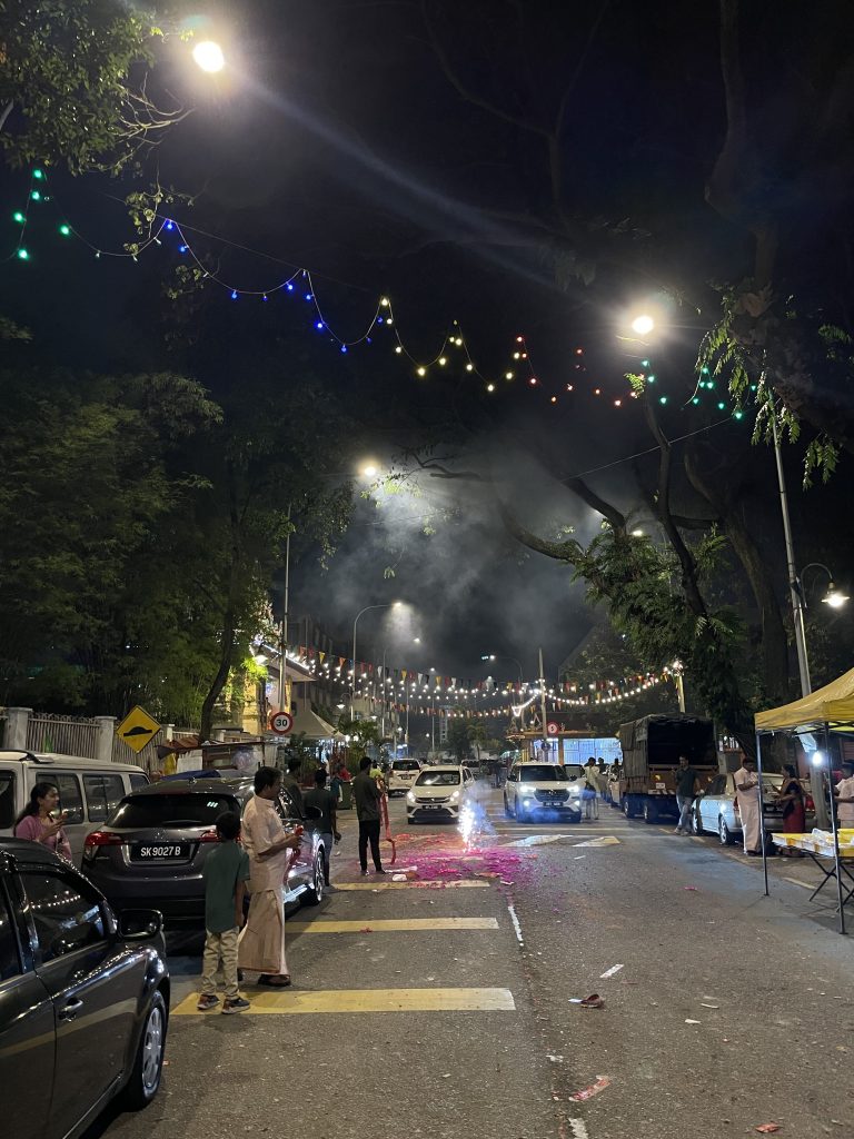 Wir haben uns also auf nach Little India, einem Stadtteil von KL, aufgemacht, denn dort wird das Fest besonders gefeiert. Ich habe eigentlich nur leuchtende Lampions und vielleicht Wunderkerzen erwartet. Beides gab es auch viel, aber die Hauptattraktion waren die Feuerwerke! Wir sind einfach durch die Straßen gelaufen und sind dem Knallen und den bunten Lichtern gefolgt, Feuerwerke sind ja recht schlecht zu übersehen. Dabei sind wir in einer scheinbar normalen Straße angekommen. Links und rechts waren Stände mit Obst, Fruchtsaft und anderen Kleinigkeiten. In der Mitte sind Autos durchgefahren, was für uns ein echter Schock war, denn sie sind dabei mitten durch die Feuerwerke gefahren! Die Menschen haben sie einfach zwischendurch durch die Feuerwerksreste gewunken und die Autos haben sich von dem ganzen Trubel herum nicht beirren lassen. Aber auch die Menschen selbst waren deutlich waghalsiger, als ich es aus Deutschland gewohnt bin. Ein Sicherheitsabstand zu den brennenden und knallenden Objekten war nicht vorhanden – teilweise wurden sie einfach in der Hand gehalten und erst im letzten Moment losgelassen.