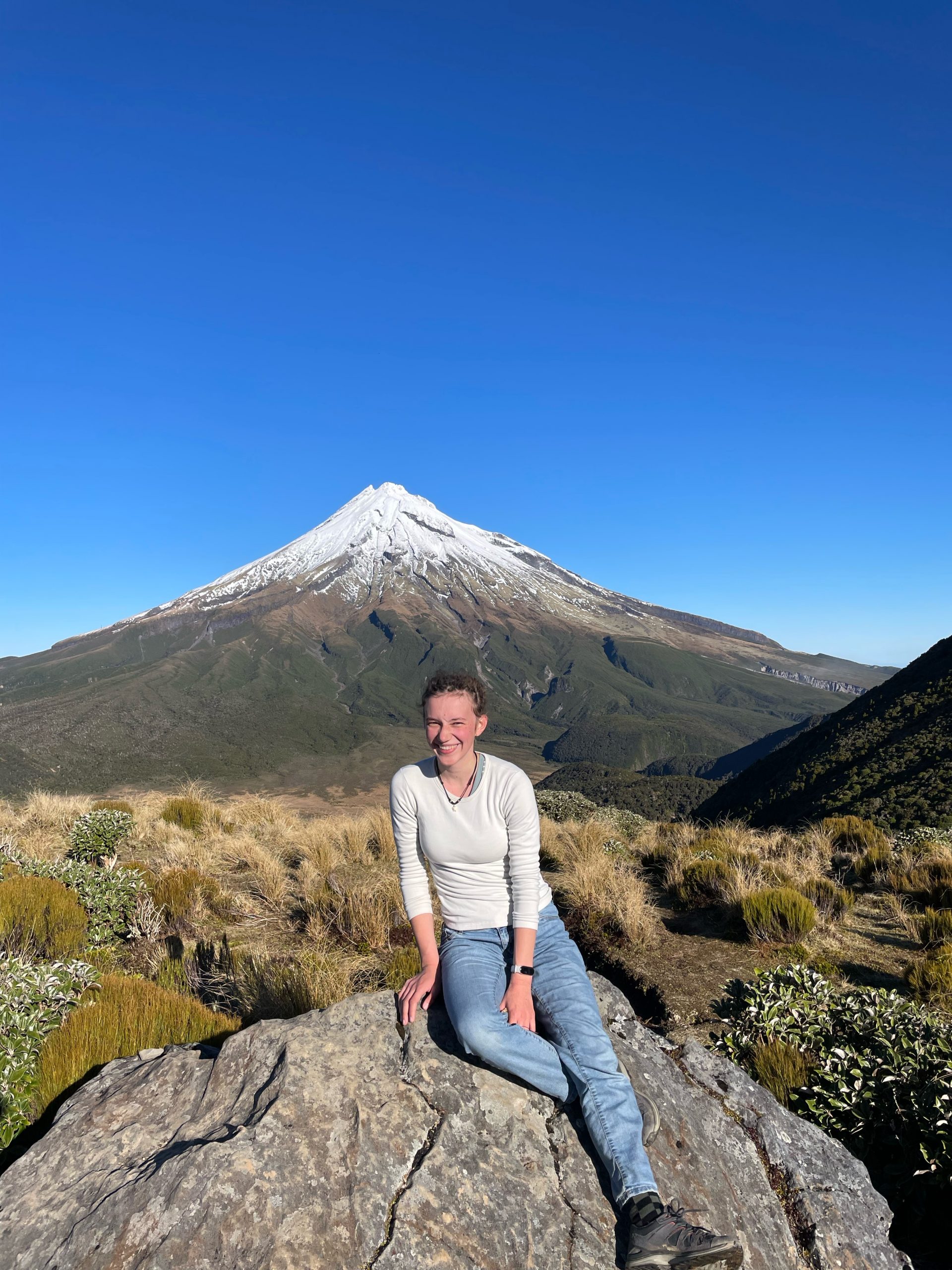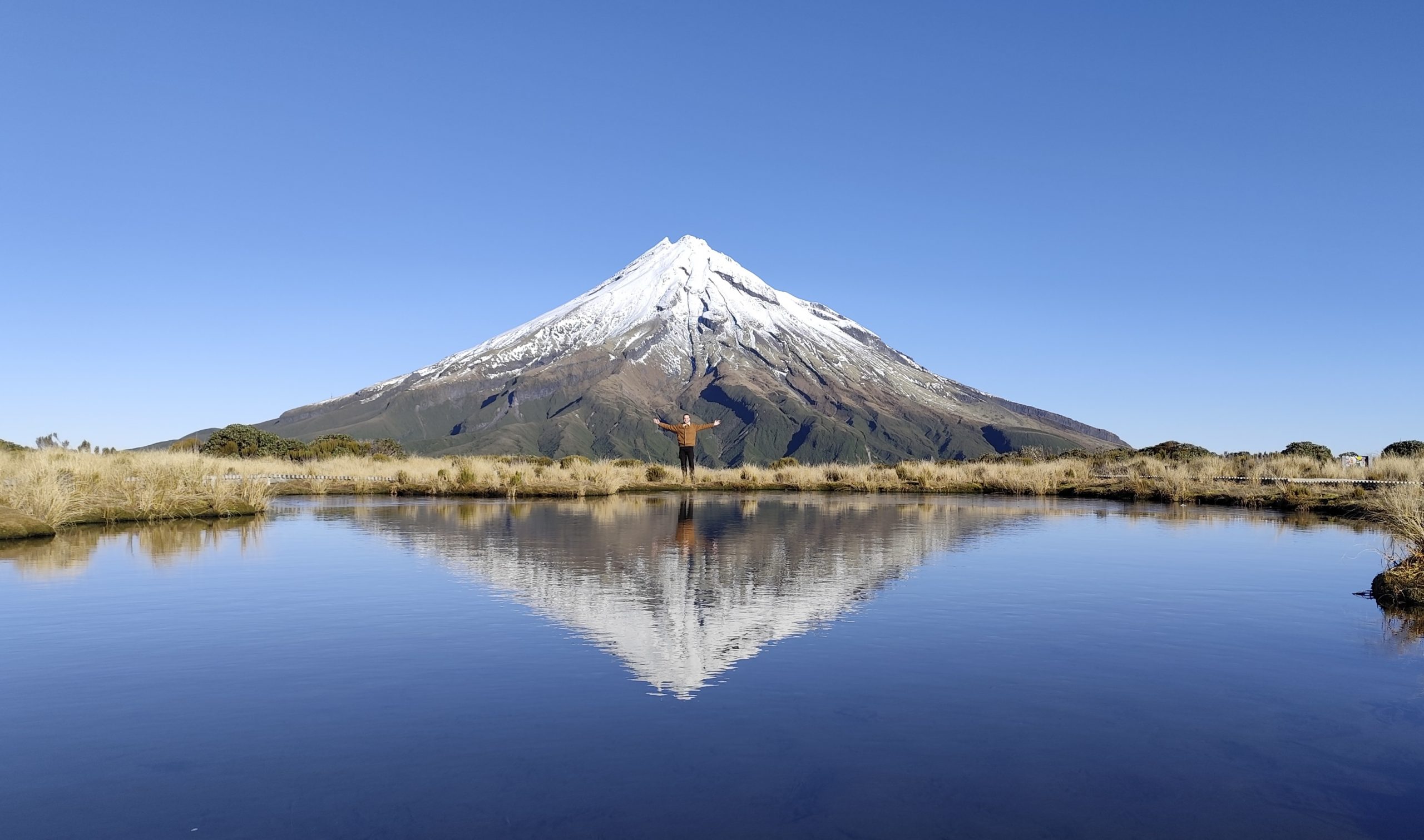 Wir hatten unfassbares Glück mit dem Wetter, klare Sicht und waren dazu auch noch fast alleine! Im Sommer muss es dort richtig voll sein, aber wir haben ja den Vorteil der Wintersaison! Das eigentliche Highlight lag jedoch noch ein paar hundert Meter weiter unten auf der anderen Seite des kleineren Berges. Dort lagen ein paar kleine Seen, in denen sich der Taranaki bei gutem Wetter spiegelte. Wir hatten nur ein bisschen Wind und konnten deshalb mehrere wirklich tolle Bilder machen. Dieser Ort war einer der Plätze, an denen ich kaum glauben kann, dass er tatsächlich auf dieser Erde existiert. Einfach wunderschön!