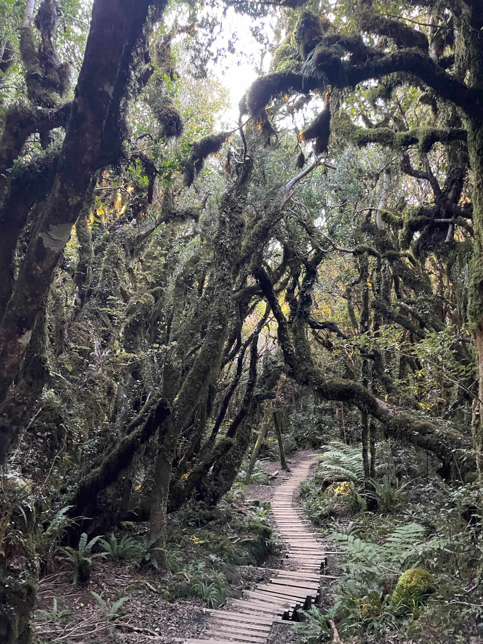Ziemlich spontan haben wir dann noch entschieden, die Wanderung zu machen, die Ulf uns am Vortag empfohlen hatte. Durch die Planung und das späte Frühstück sind wir erst recht spät losgekommen und waren deshalb erst um halb eins auf dem Weg zum Start des Wanderwegs. Auf dem Weg konnten wir immer wieder den Mount Taranaki sehen, der mich immer noch an den Mount Fuji aus Japan erinnert hat! Während der Fahrt kam er uns immer näher, denn dieser Berg war tatsächlich auch unser Ziel. Nach einer Dreiviertelstunde Autofahrt waren wir am Parkplatz für die Wanderung und sind dann erst gegen 14 Uhr mit unserem gepackten Tagesrucksack losgegangen. Da wir nicht so viel Zeit hatten, haben wir uns etwas beeilt und sind dann bei den ersten Kilometern sehr schnell voran gekommen. Der hölzerne gewundene Weg führte uns durch einen dichten Wald und war am Anfang noch ziemlich ebenerdig, aber leider mussten wir auch schnell die ersten Treppenstufen bezwingen, die nach und nach immer mehr wurden.