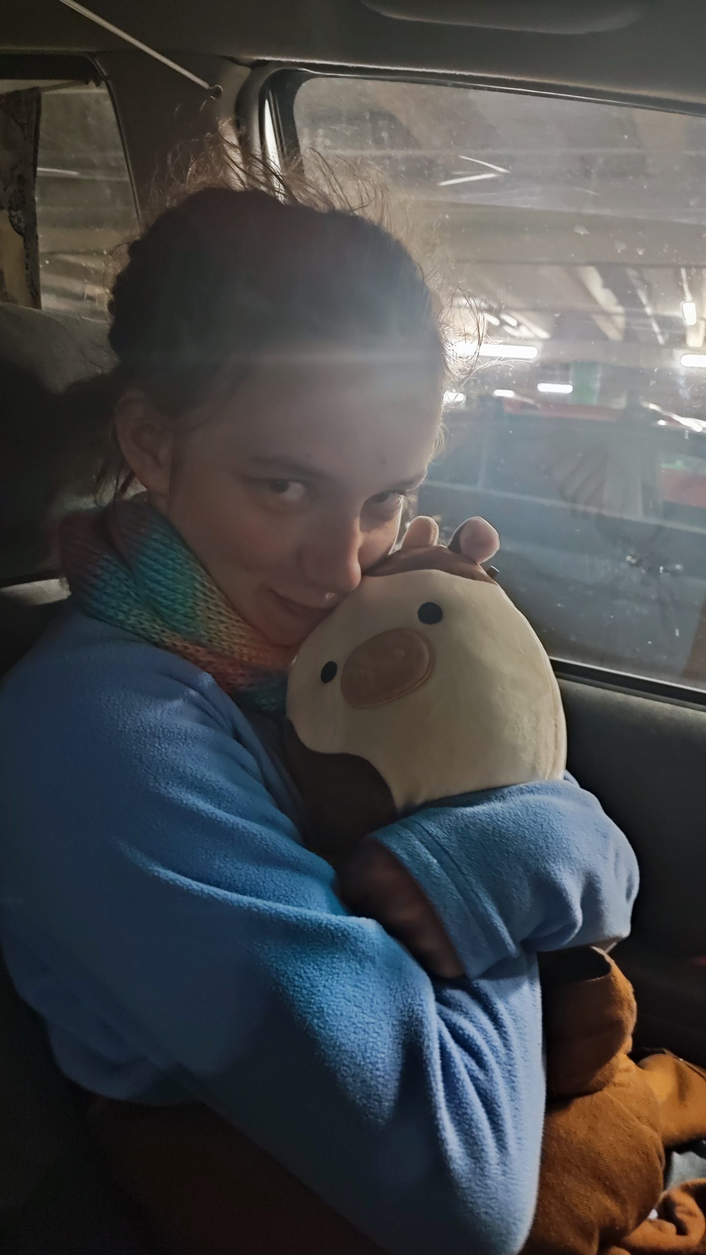 Leider hatten wir abends kein Essen mehr und mussten deshalb nochmal einkaufen gehen. Nach einem langen Wandertag eigentlich nicht mein Fall, aber dieses Mal hat es uns ein sehr positive Wendung gebracht. Denn wir haben dort eine neue Reisebegleitung gefunden! Auf einem Aussteller lagen mehrere Kuscheltiere, aber eins davon ist mir sofort ins Auge gesprungen: eine kleine Kuh! Zuerst haben wir sie dort stehen lassen und sind mit unseren Einkäufen zu den Kassen gegangen. Aber dann saßen wir wenige Minuten unten im Auto und ich konnte mir die kleine Kuh einfach nicht aus dem Kopf schlagen. Wir sind also kurzentschlossen wieder nach oben gegangen und haben jetzt eine neue Reisegefährtin, die wir Muhselotte von Drakuhla genannt haben.