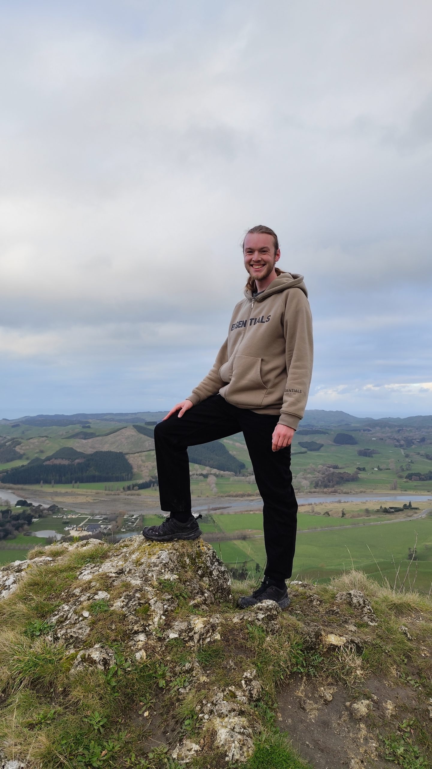 Für mich hat es sich ähnlich zum Auenland angefühlt, wer könnte das also nicht schön finden! Im Tal links neben uns floss ein Fluss um ein Dorf herum, was die Atmosphäre nur noch idyllischer gemacht hat. Mit der Kante links und den sanften Hügeln rechts ging es für uns also weiter die kleinen Bergspitzen nach oben. Nach einiger Zeit tauchte neben uns eine normale Straße auf, die sich in Serpentinen nach oben schlängelte. Ab da an ging unser Weg ein paar Meter über der Straße entlang nach oben, bis wir endlich gemeinsam an der Spitze des höchsten Hügels angekommen waren, auf dem Te Mata Peak! Dieser Peak ist nur 400 Meter über dem Meeresspiegel, weshalb man auch so problemlos mit dem Auto dorthin fahren kann, aber als Mini-Wanderung fand ich es trotzdem einfach zauberhaft, wie eine Märchenlandschaft.