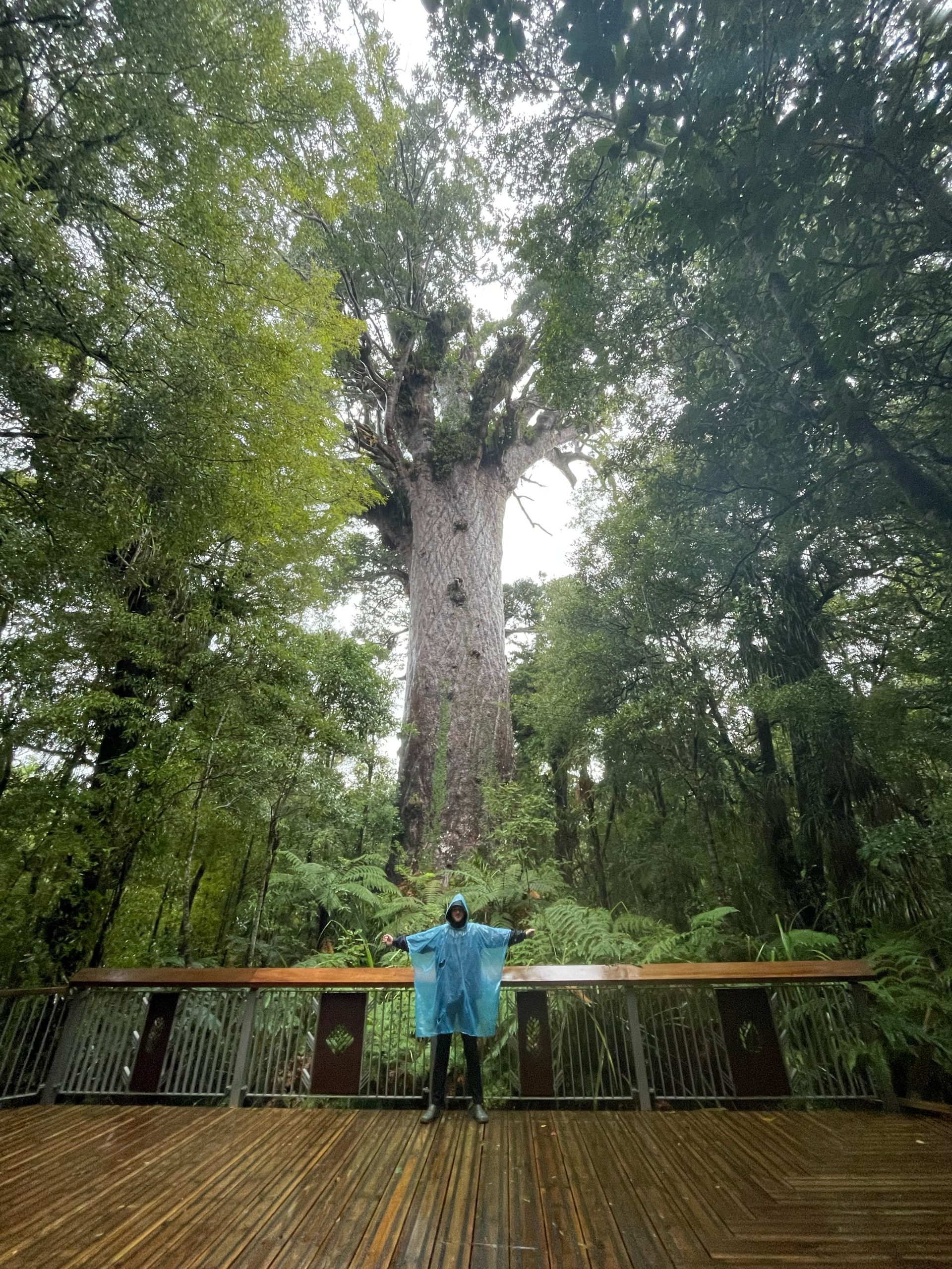 So, zurück zu Tane Muhata! Dieser besondere Baum ist mit einem geschätzten Alter von 1500-2000 Jahren der älteste bekannte Kauri Baum. Außerdem ist er mit über 50 Metern Gesamthöhe auch der höchste Baum dieser Art und er hat sogar das fünftgrößte Volumen aller Bäume weltweit! Ihr könnt euch also vielleicht ansatzweise vorstellen, wie unfassbar riesig dieser Baumriese ist. Wir hatten sehr Glück, dass wir ihn noch sehen konnten, weil der Zugang zu ihm täglich ab 15 Uhr gesperrt wird. Aufgrund seiner großen Bedeutung für die Māori und als geschützte Attraktion stehen tagsüber immer zwei Wächter am Eingang zu dem kleinen Weg, die jeden Besucher dazu anhalten sich die Schuhe zu desinfizieren und aufpassen, dass niemand den Weg verlässt. Wir sind erst kurz vorher angekommen und wurden als letzte Besucher des Tages noch hereingelassen. Deshalb hatten wir leider nicht so viel Zeit, um diesen riesigen Baum zu bewundern, aber bei dem starken Regen hätten wir vermutlich ohnehin nicht allzu lange dort stehen wollen. Als wir endlich vor dem riesigen Kauri standen, konnte ich einfach nicht glauben, dass es sich dabei wirklich um eine Pflanze handelt! Dieser Baum hat schon so viele Jahrhunderte erlebt, in seiner Lebensgeschichte ist mein ganzes bisheriges Leben vermutlich nicht mehr als Wimpernschlag. Ich bin wirklich dankbar, dass wir dieses gigantische Wesen besuchen konnten und ich wünsche dem Herren des Waldes noch viele weitere Jahrzehnte! Wegen des Regens haben wir uns dagegen entschieden noch andere berühmte Kauri-Bäume zu besichtigen, aber die Straße durch den Wald selbst war schon sehr schön.
