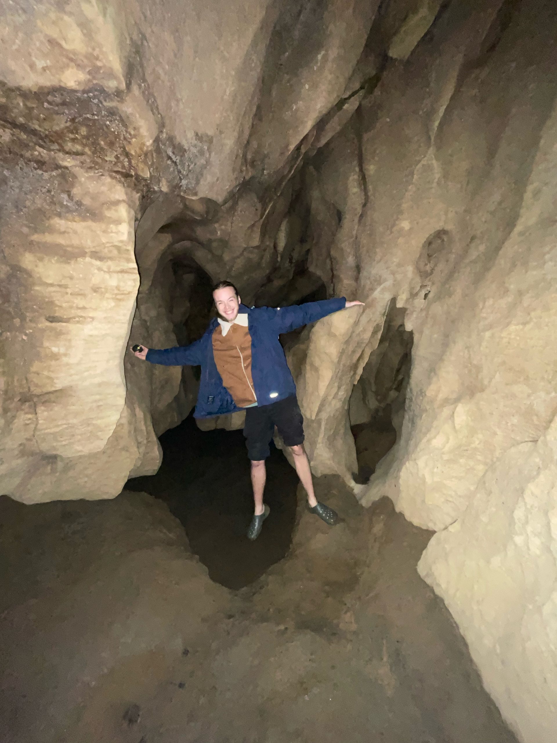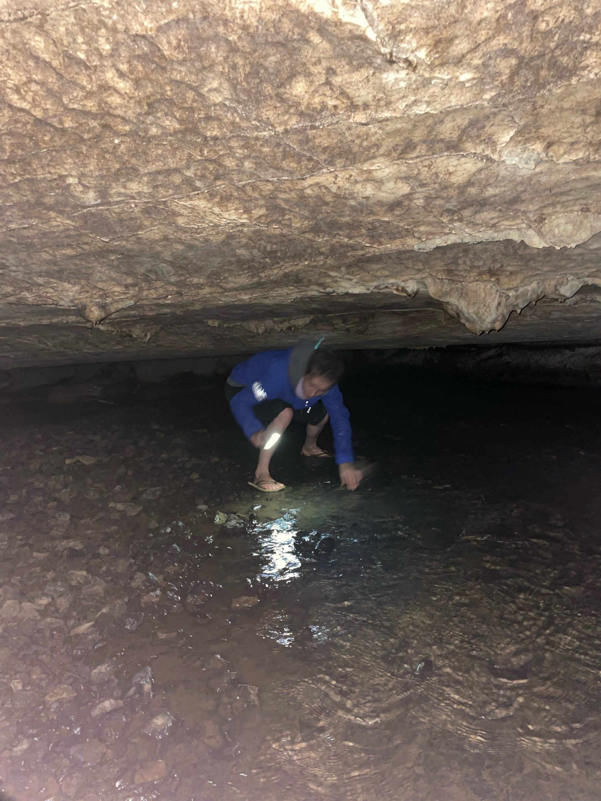 Je tiefer wir in die Höhle vorgedrungen sind, desto dunkler wurde es. Außerdem wurde der Fluß immer matschiger, weswegen wir zeitweise auf den Rand ausweichen mussten. Der Rand der Röhrenförmigen Höhle war jedoch auch sehr rutschig und vor allem sehr uneben, wir sind also die meiste Zeit mehr durch die Höhle geklettert.