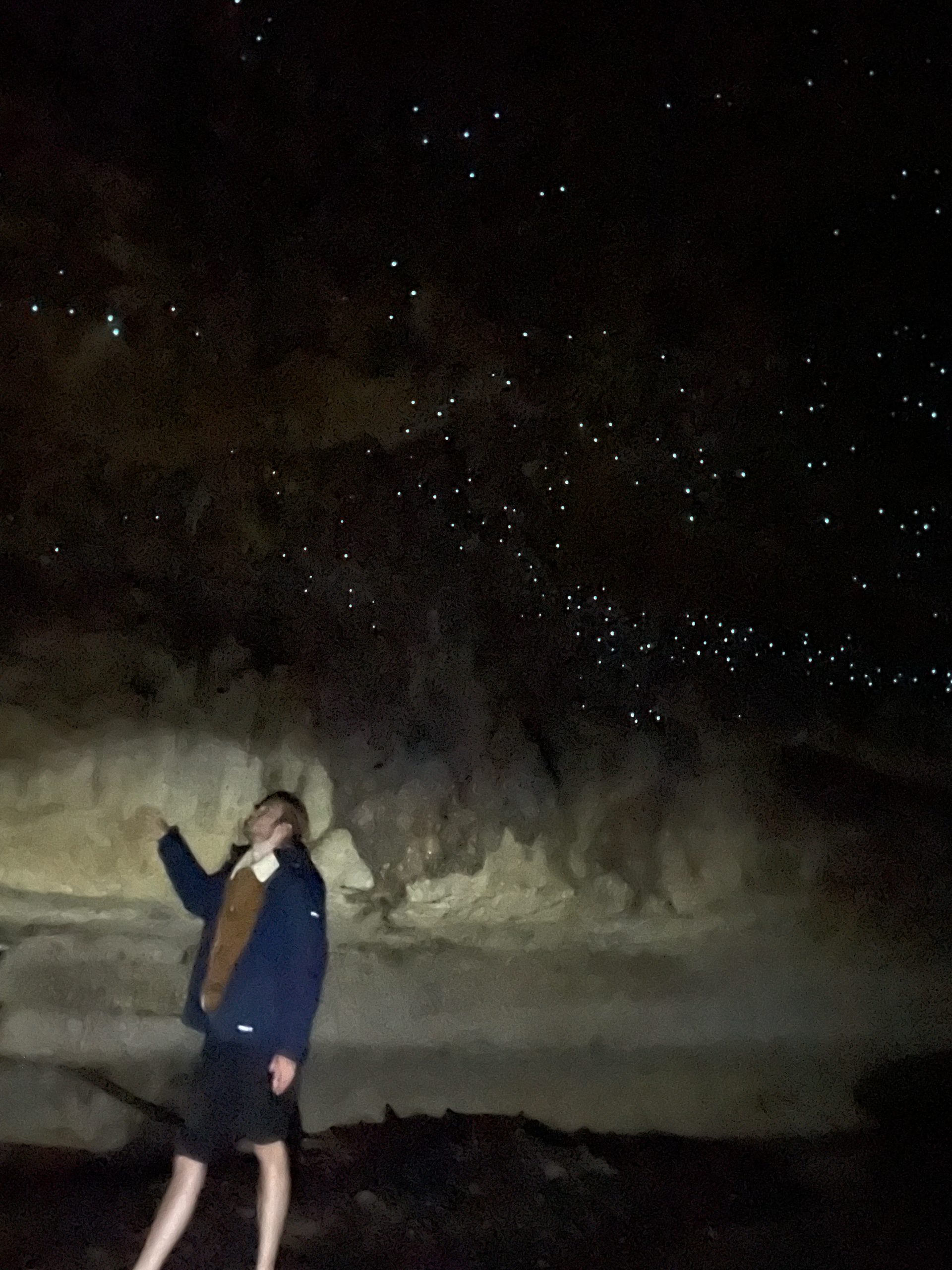 Und auch wenn der Weg so alleine schon cool war, wurden wir gegen Ende der Gänge noch einmal richtig belohnt. Denn als wir unsere Taschenlampen erst einmal ausgeschaltet hatten, konnten wir an der Höhlendecke etliche kleine, blaue Punkte erkennen: Glühwürmchen! Nicht die Glühwürmchen, die man von draußen kennt, sondern tatsächlich leuchtende Würmer. Auf englisch gibt es tatsächlich einen Unterschied zwischen den beiden Spezies (Fireflies / Glowworms), aber im Deutschen wohl nicht. So oder so war die Decke gefüllt von den kleinen, leuchtenden Wesen und so war das Ganze für uns noch umso mehr besonders, als wenn es nur die Höhle selbst gewesen wäre. In mehreren Kammern der Höhle war oft die gesamte Decke mit ihnen gefüllt, manchmal sogar noch die Wände. Je länger das Licht aus war, desto mehr hat man von den Würmern gesehen. Ein paar hingen sogar tief genug, um sie von nahem zu sehen – das war dann aber nicht mehr so schön. Es sind und bleiben halt Würmer. Trotzdem haben wir uns hier wirklich Zeit gelassen und die Höhle genossen, denn so etwas hatten wir wirklich noch nie zuvor gesehen! Solche Glowworm Caves gibt es in Neuseeland wohl häufiger, aber mit dieser Höhle haben wir uns eine richtig gute ausgesucht – denn wir waren fast die einzigen dort. Und auch wenn wir uns in der Zeit dort die Füße abgefroren haben, war diese Erfahrung doch wirklich besonders!