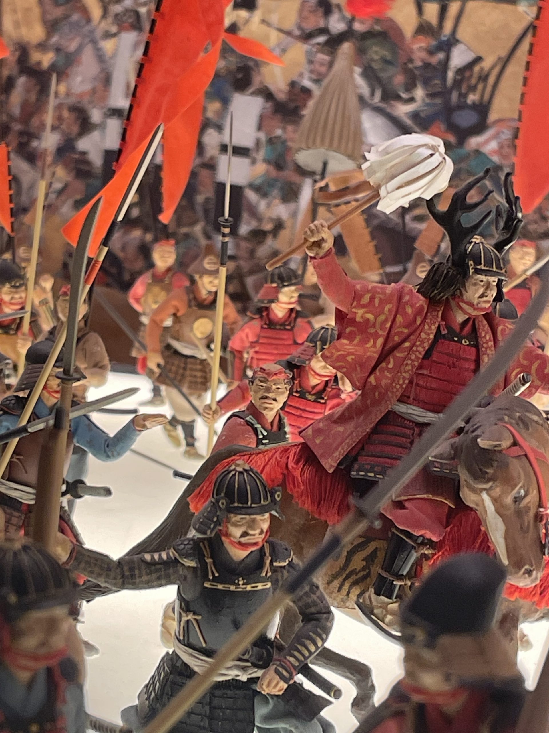 Jennie hat uns zielsicher durch das Chaos aus Menschen, U-Bahnstationen und Geschäften geführt. Auch wenn die Züge immer wieder auf ca. 100km/h beschleunigen, hat es fast eine Stunde gedauert, bis wir beim „Osaka Castle“ angekommen sind. Der Palast besteht aus über fünf Stockwerken und ist wunderschön. Er ist außen weiß, hat schwarze geschwungene Dächer und viele goldene Verzierungen (beispielsweise Tiger). Das Gebäude, welches man heutzutage sehen kann, ist nur eine Nachbildung des Original, welches vor 400 Jahren abgebrannt ist. Davor war eine sehr lange Schlange an Menschen, die alle in das Schloss wollten, welches mittlerweile ein Museum ist. Wir hatten ja zum Glück eine Expertin dabei und sind mit unseren spontan gekauften Online-Tickets an der ganzen Schlange vorbeigekommen. Im inneren sind verschiedenste Objekte ausgestellt. Alte Schriftrollen, Helme, Miniaturen der Anlange aus den unterschiedlichen Epochen und sehr viele unfassbar detaillierte Gemälde. Diese Kunstwerke haben mich echt am meisten beeindruckt. Eine einzige Schlacht wird auf mehreren zusammenhängenden Bildern bis ins kleinste Detail dargestellt. Mehrere hundert Soldaten sind alle mit winzigen Pinselstrichen dargestellt, jeder mit eigener Mimik und einem eigenen Charakter.