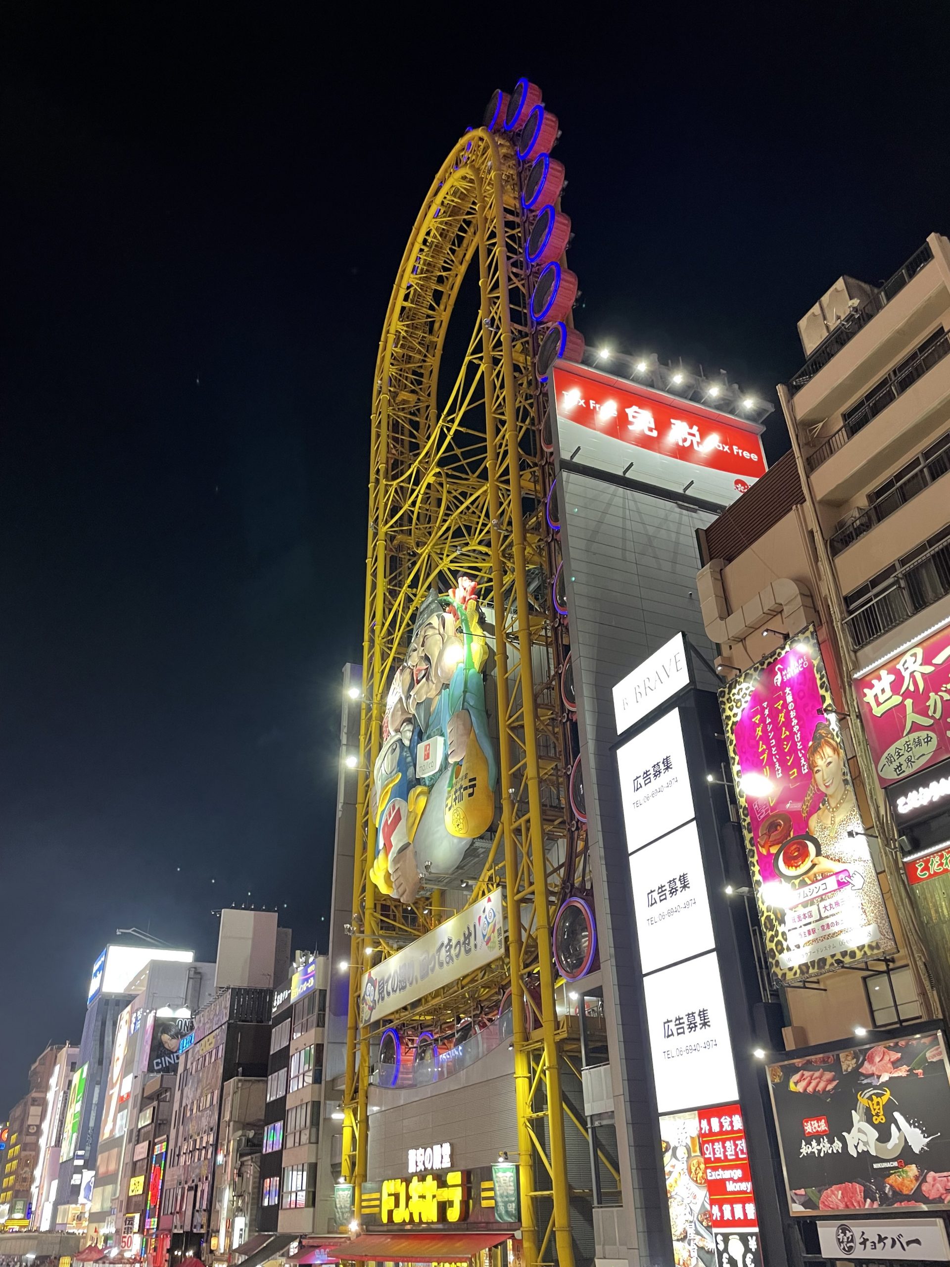 Am nächsten Tag haben wir unter anderem den Dotonbori-Distrikt besucht. Dort gibt es viele Neon Schilder, unter anderem den berühmten „Glico-Mann“, viele kleine Läden für Essen und viele andere Kleinigkeiten. Am bekanntesten ist eine bestimmte Brücke, die voll mit Menschen ist. Man ist dort umgeben von vielen Hochhäusern, an deren Außenwände die buntesten LED-Schilder angebracht sind, die die Aufmerksamkeit der Menschenmasse auf sich ziehen wollen. In diesem dicht gedrängten Gebiet sieht man unfassbar viele Handys, Kameras und posende Menschen, die die Szenerie festhalten wollen. Eine sehr lebhafte und trubelige Gegend!