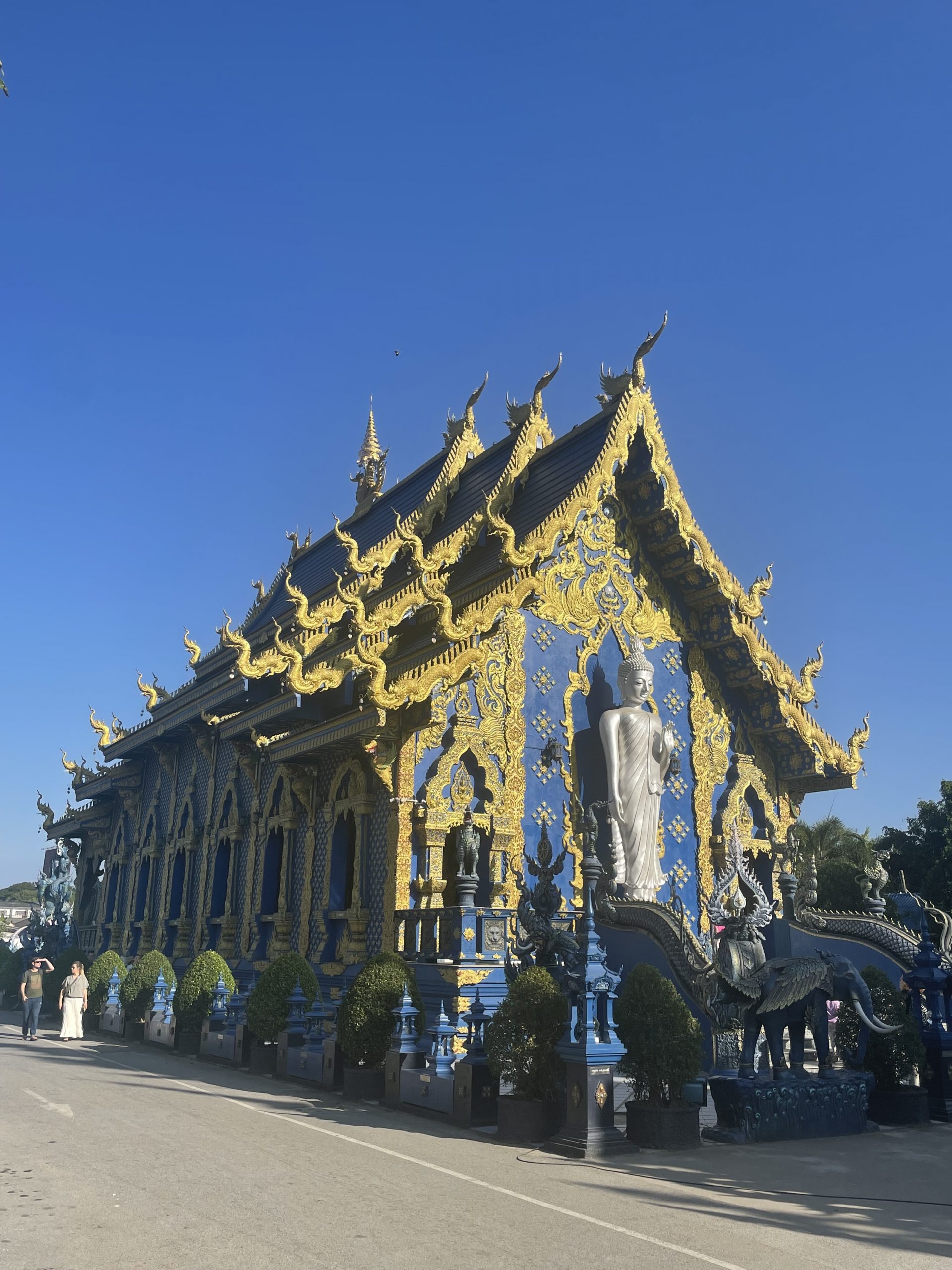 Danach haben wir eine Sehenswürdigkeit besucht, den „Wat Rong Suea Ten“ auch genannt der „Blaue Tempel“. Die Anlange wirkte fast eher wie ein Kunstprojekt, als wie ein „gewöhnlicher“ Tempel. Die Bezeichnung mit der Farbe Blau hat er sich auf jeden Fall verdient! Fast alles dort war in blauer Farbe gehalten. Die Wände des Tempels, das Dach, die Statuen vor und um den Tempel herum, sogar die Buddha-Statue war an das Thema angepasst. Sie war zwar nicht blau, dafür aber auch nicht wie gewöhnlich golden, sondern weiß glänzend und von blauem Licht beleuchtet. Alle Verzierungen wiederum waren golden, von den Drachen am Rand des Daches bis hin zu den kunstvollen Gemälden innerhalb des Tempels.