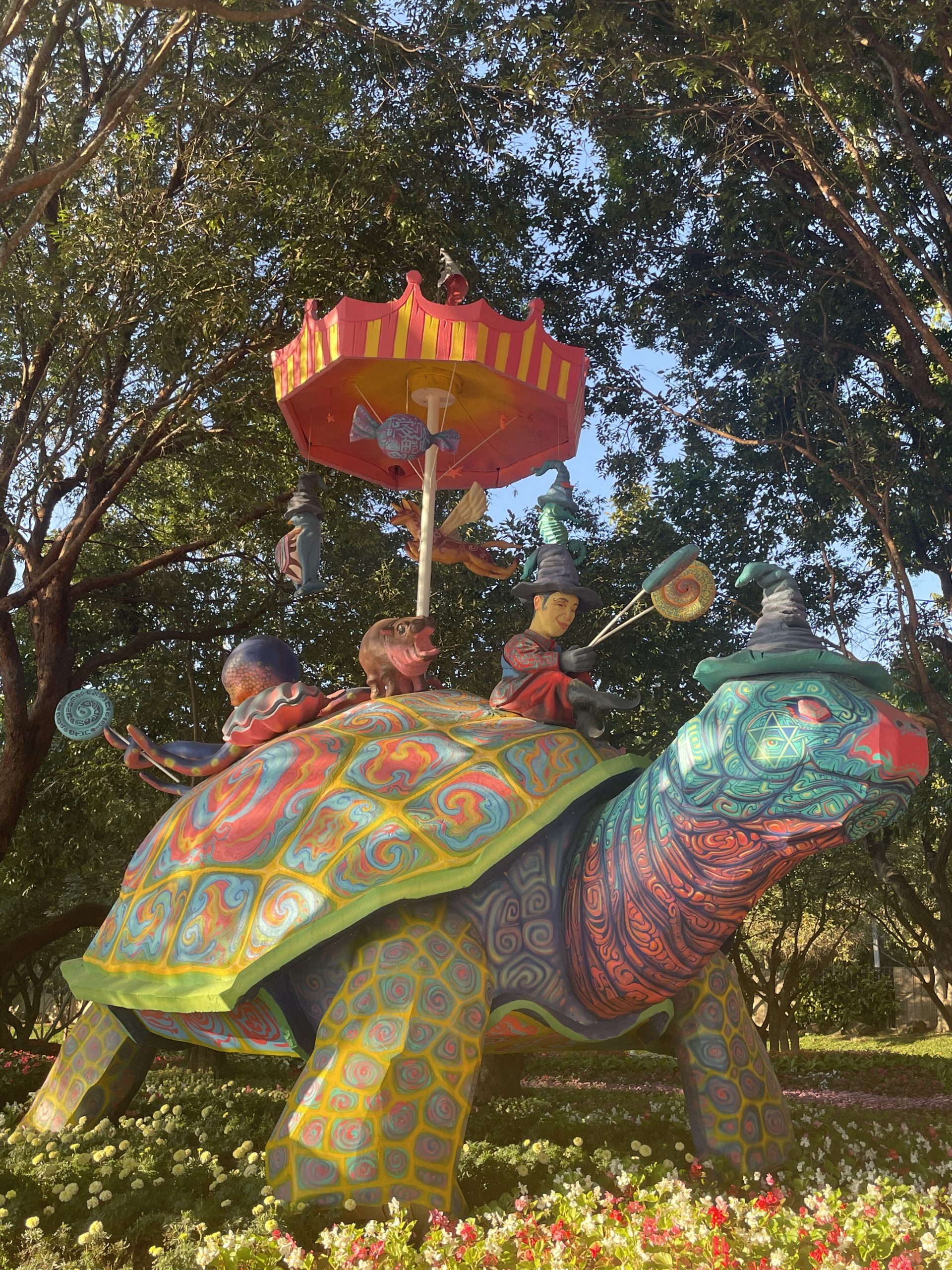 Nachdem wir alles gesehen hatten, sind wir zu einem Blumengarten gefahren. Auf dem Gelände war bis vor kurzem noch ein Blumen- und Kunstfestival, weshalb dort zusätzlich noch viele Kunstobjekte standen. Zu unserem Glück war alles noch aufgebaut, nur ohne die Menschenmassen. Wir konnten den wunderschönen Blumengarten also ganz in Ruhe ohne viel Trubel genießen. Ganz besonders ist mir eine große Schildkröte in Erinnerung geblieben. Die Statue war mit bunten Mustern bemalt, trug einen Hexenhut auf dem Kopf und hatte ein Kettenkarussell auf dem Rücken. Daneben waren mehrere kleine Figuren, unter anderm Moo Deng. Das kleine Nilpferd ist in Thailand sehr beliebt und hat in den letzten Jahren einen riesigen Hype bekommen.