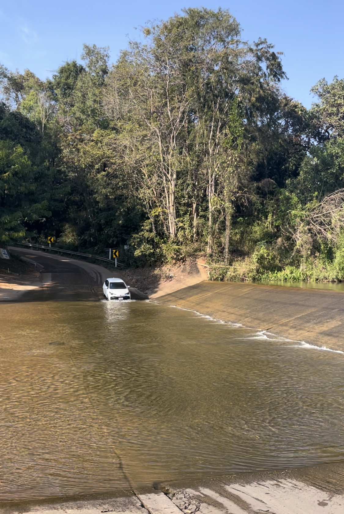 An diesem Tag haben wir Chiang Rai schon wieder verlassen und sind ganz in den Nordosten Thailands gefahren. Doch zuerst waren wir in einem kleinen Bergdorf im Westen von Chiang Rai. Der Hinweg war größtenteils unspektakulär, bis vor uns auf einmal ein Hindernis war. Die Straße ging ein winziges Stückchen steil bergab, dann etwa 30 Meter geradeaus, danach wieder steil bergauf und verlief dann wieder normal. Allein das wäre ja nicht so ungewöhnlich. Nur war rechts von uns ein großer Stausee, links von uns ein kleiner Fluss… und das Wasser floss mitten über unsere Straße! Wir haben erstmal ein anderes Auto beobachtet, was dieses Hindernis ohne zu Zögern überwunden hat. Daraufhin haben wir uns dem angeschlossen und ich habe unser Auto durch das etwa schenkeltiefe Wasser gelenkt. Es war deutlich weniger episch, als es jetzt klingt, ich habe überhaupt nichts von dem Wasser bemerkt.